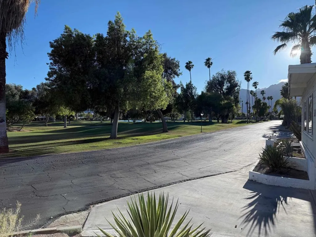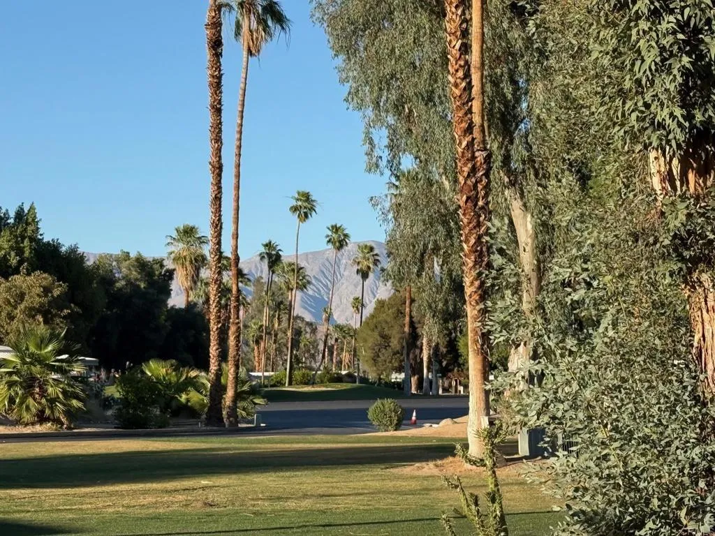 This spacious home has cathedral ceilings and is light & bright, with 2 newer, large, dual-pane windows that look out to the 1st fairway & green of the exclusive 55+ Roadrunner Golf & Country Club. Enjoy beautiful & lush views which include many palm trees, a pond & fountain on the fairway, and the iconic San Ysidro Mountains to the West. There is carpeting throughout and ceramic tile in the kitchen, both bathrooms & large laundry room. The main bath has a large oval tub and separate shower stall. This home has central forced heating and air conditioning along with a large fan in the living room. A nice sitting "wrap around" bar allows for entertaining and lots of counter space. You can enjoy the sunsets right from your living room or even better, on the front patio. This is on leased land with space rent. Don't miss this opportunity, call me today!