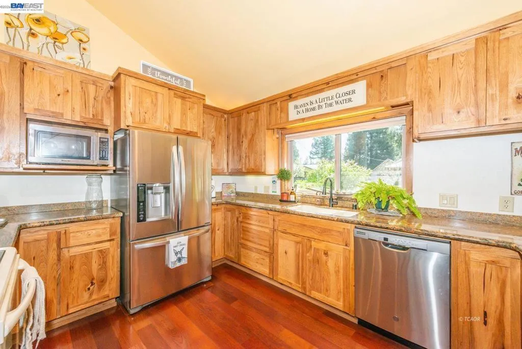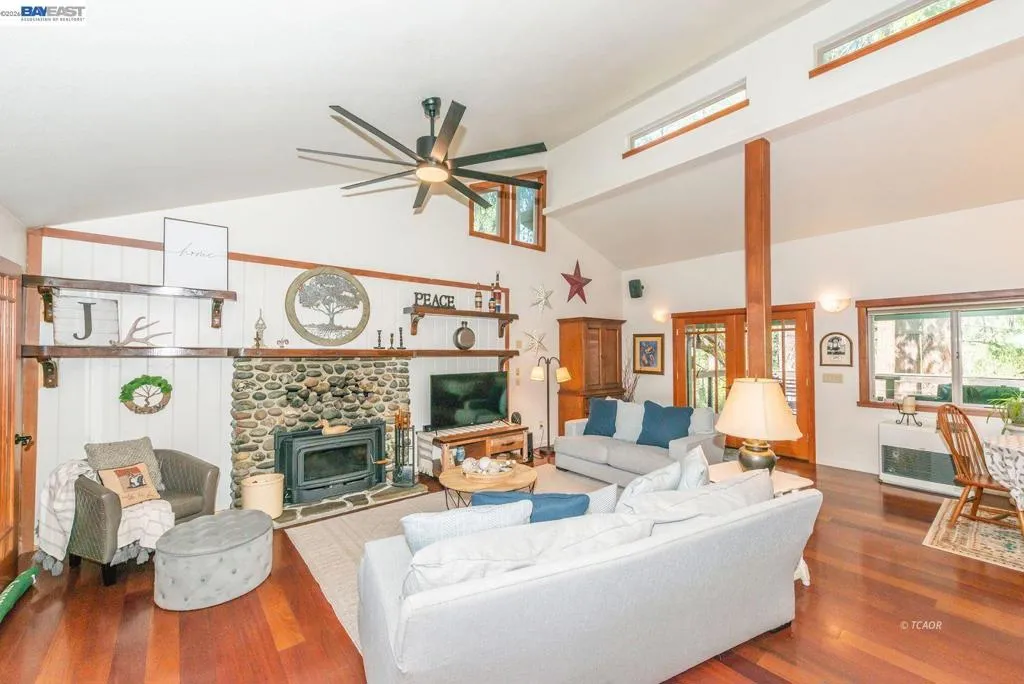 Beautifully restored in 2008, this home offering 2,174 sq ft with 2 spacious primary ensuite bedrooms and 2.5 baths. Blending historic character with modern updates, the home features Douglas Fir hardwood doors, trim, and window casings, tile entry, and engineered hardwood flooring in the main living areas. Kitchen includes granite countertops, Hickory cabinetry, and walk-in pantry. Dining room flows to living area both with French doors leading to covered back deck, plus a cozy sitting room with custom carpet and floor-to-ceiling blue pine shelving. Main-level primary suite offers walls of windows, French doors to a private deck, and spa-style bath with radiant heated tile floors, soaking tub, granite counters, and walk-in tile shower. Upstairs features a large second primary suite with balcony access, front deck, and loft. Additional amenities include half bath on main level, attached 2-car garage with workshop, lower workshop, expansive back decking with mountain and creek views, and whole-house generator (2022), all on .51 acres. Close to Trinity Lake and Trinity Alps Wilderness-ideal for year-round living or a mountain retreat.
