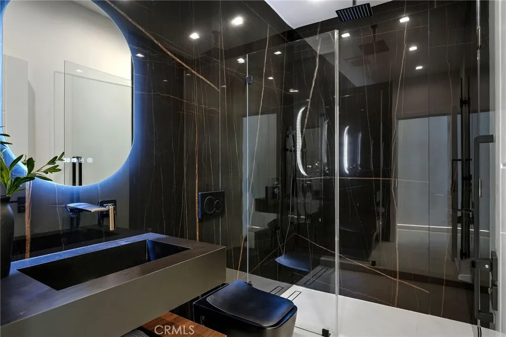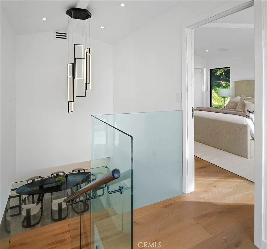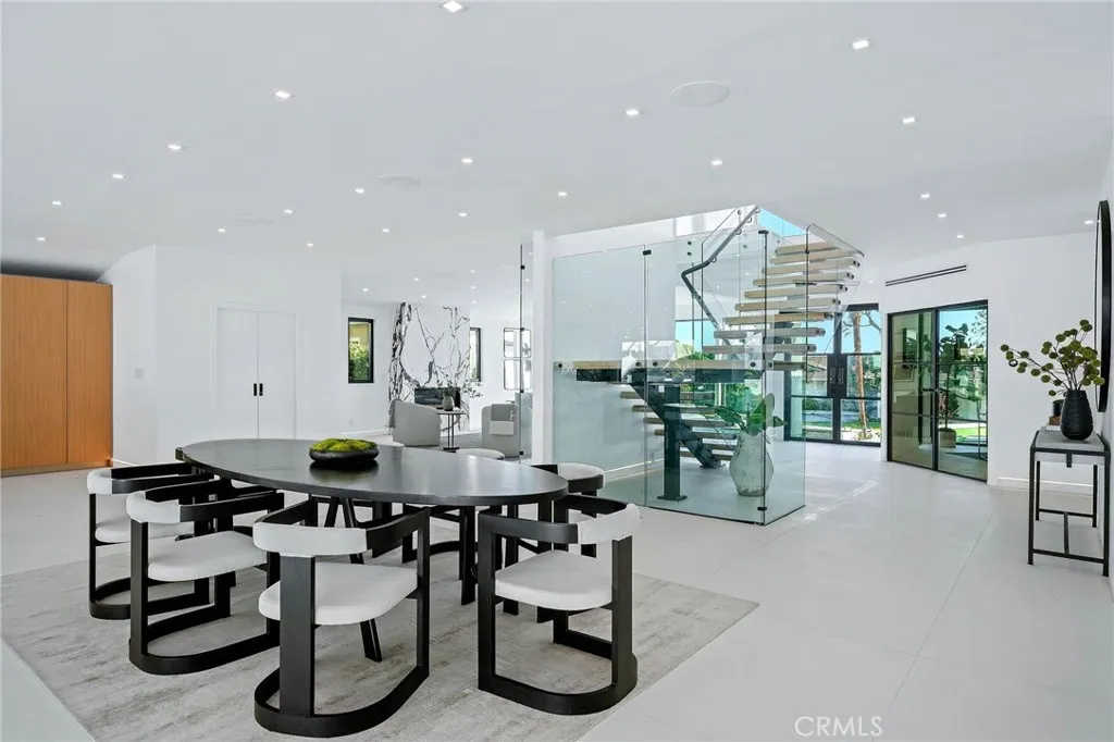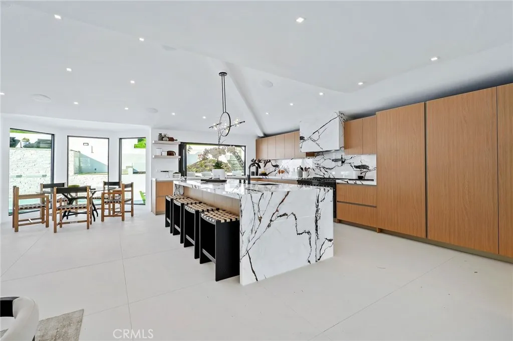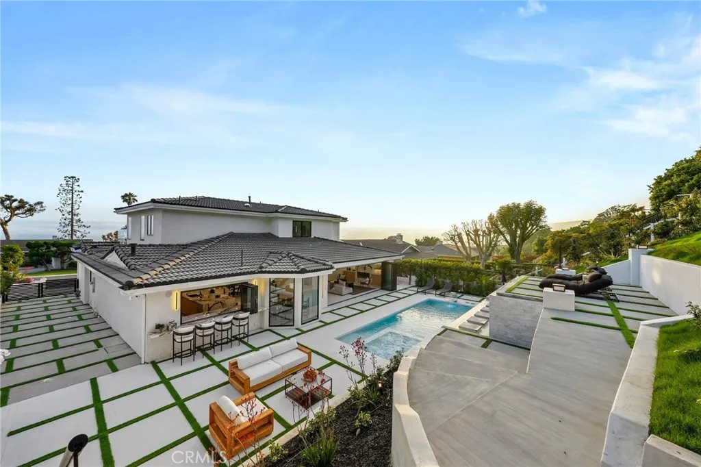 Perched above the coastline with sweeping ocean and Terranea Resort views, the property is an exquisitely designed and thoughtfully curated contemporary residence just moments from a world-class, Pete Dye-designed golf course. Entering the main level, the home unfolds through a light-filled open floor plan defined by vaulted beamed ceilings, Italian porcelain flooring, and expansive windows that frame the coastal backdrop. At the heart of the home, a custom Snaidero kitchen appointed with Thermador appliances features a large center island with breakfast bar seating, complemented by a sunlit breakfast nook surrounded by floor-to-ceiling windows. The kitchen flows seamlessly into the dining area and rear family room, where sliding glass doors open to the backyard, creating a natural extension of indoor-outdoor living. A custom wet bar sits adjacent to the dining space, enhancing the home’s effortless entertaining design. A striking glass and steel staircase serves as an architectural focal point, connecting the home’s two levels with a refined modern presence. The main level offers three en-suite bedrooms, a dedicated home office, and a temperature-controlled wine cellar. Upstairs, the primary suite provides a private retreat with a fireplace, spa-inspired bath, dual walk-in closets, and an oversized terrace with sweeping ocean views. An additional en-suite bedroom features its own private balcony, capturing the same panoramic views of the Pacific. Designed for both relaxation and entertaining, the resort-style backyard includes a pool and spa, outdoor kitchen, fire pit, and lush landscaping, offering a true lifestyle experience. A versatile converted flex space with new flooring and custom cabinetry is ideal for a home office, gym, or studio, while still offering the flexibility to be used for parking if desired. Additional features include smart home integration, built-in audio, and thoughtfully executed modern finishes. A rare convergence of design, setting, and lifestyle, the home offers a seamless indoor-outdoor living experience against a sensational coastal backdrop.