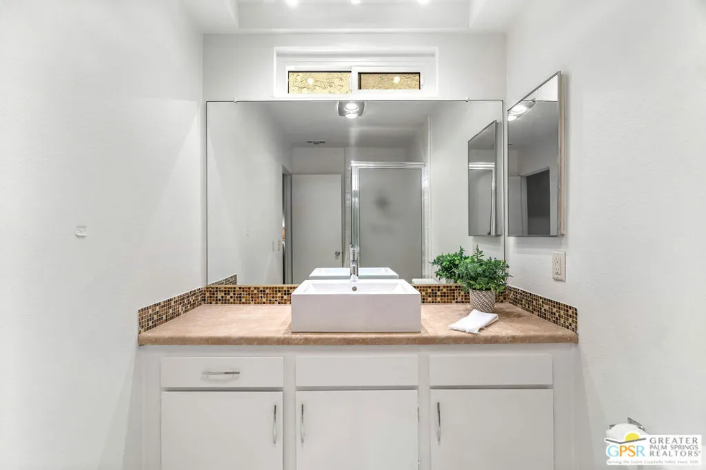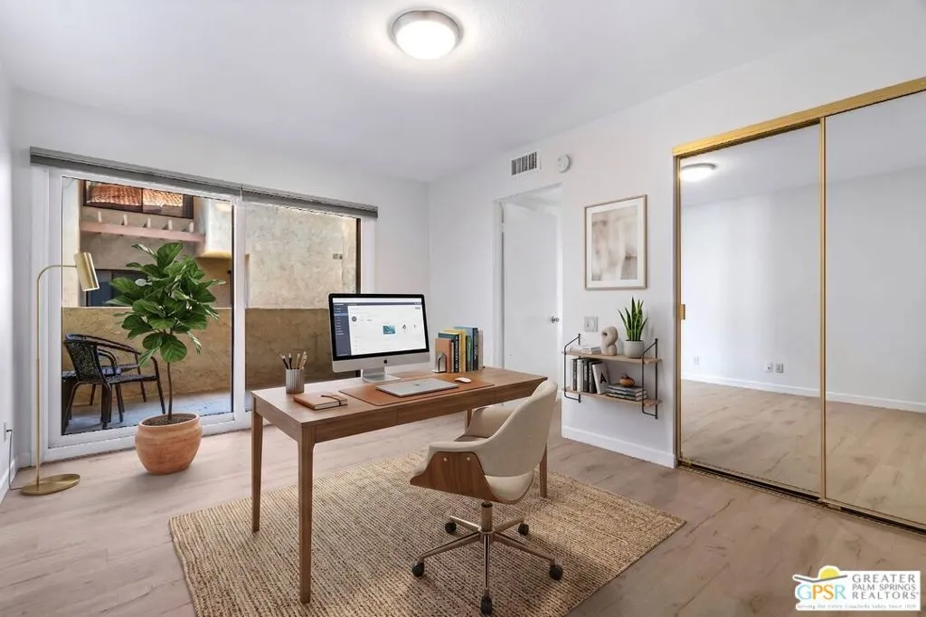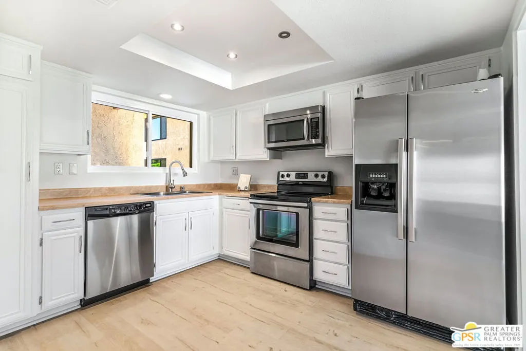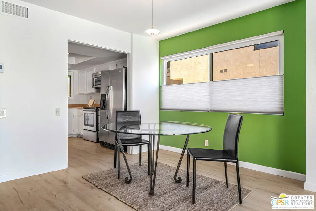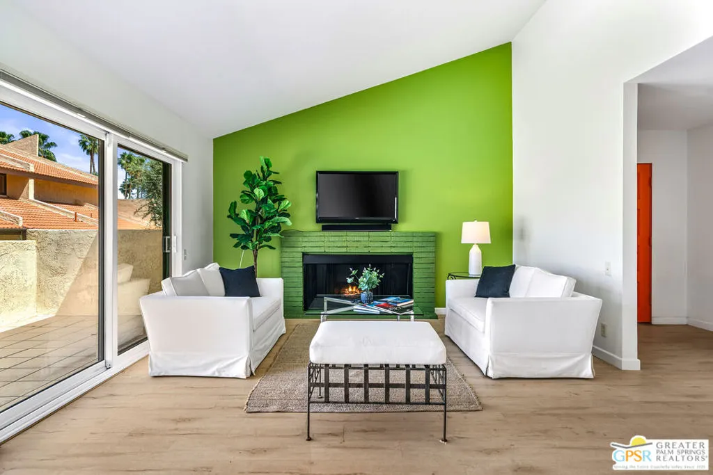 Welcome to Canyon Villas, a gated community in the desirable South Palm Springs area, fee land (NO LEASE ) and enjoy resort-style living. This beautifully appointed 3-bedroom, 3-bath condominium offers approximately 1,590 sq ft of thoughtfully designed living space, blending comfort, style, and functionality. Step inside to discover an open and airy floor plan highlighted by vaulted ceilings, abundant natural light, and a spacious living area complete with a fireplace. Large sliding glass doors create seamless indoor-outdoor flow, opening to an expansive private patio perfect for entertaining, relaxing, or soaking in the stunning mountain views. The kitchen connects effortlessly to the dining and living spaces, while the flexible layout includes a main-level bedroom ideal for guests or a home office. Upstairs, additional bedrooms feature soaring ceilings and generous space, walk-in closets, creating a comfortable retreat for residents and visitors alike. Updated with dual pane windows and vinyl flooring throughout. This condominium is an ideal full-time residence, vacation getaway, or investment opportunity. Additional highlights include two covered parking spaces, ample guest parking, and tasteful upgrades throughout. Canyon Villas residents enjoy beautifully landscaped grounds along with community pools, spas, and tennis and pickleball courts, all set in a tranquil environment just minutes from downtown Palm Springs, dining, shopping, and outdoor recreation. Canyon Villas HOA fee includes water, sewer, roof, trash, building, basic cable, and internet. Experience the best of desert living in this inviting and move-in-ready home.