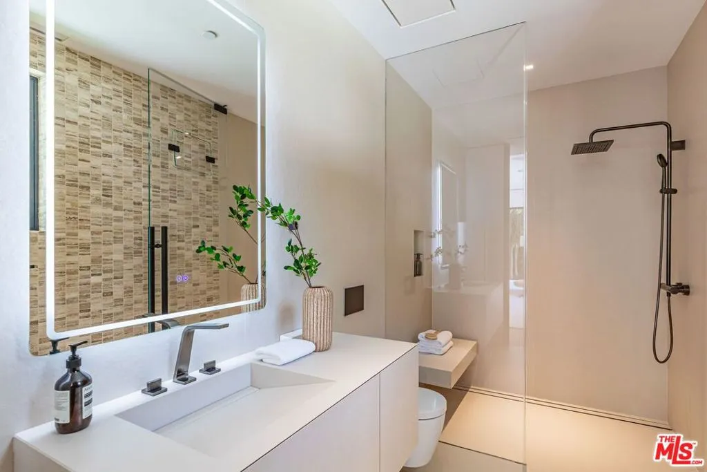 Nestled in one of Beverly Hills' most prestigious enclaves, on just over half an acre, this breathtaking modern estate seamlessly blends timeless elegance with contemporary luxury. The striking white facade, framed by lush greenery and mature trees, sets the stage for an exceptional living experience. Designed by Tim Campbell for both grand entertaining and intimate gatherings, the 13,000 SF home boasts a thoughtfully curated open-concept layout with seamless indoor-outdoor flow. With 9 ensuite bedrooms and 10 bathrooms, this estate offers an unparalleled level of comfort and sophistication. The primary suite is a true retreat, featuring dual bathrooms and dual walk-in closets, creating a private sanctuary of luxury. A detached guest house with a private bedroom provides additional space for visitors or extended stays. Outside to discover a resort-style backyard, complete with a pool, cascading waterfall, and spa. A poolside cabana and expansive patio space invite effortless al fresco dining and lounging, while the large, flat lawn provides ample space for recreation and relaxation. Every detail of this residence has been meticulously designed to offer the finest in modern living, making it the perfect home for those who appreciate style, comfort, and world-class amenities.