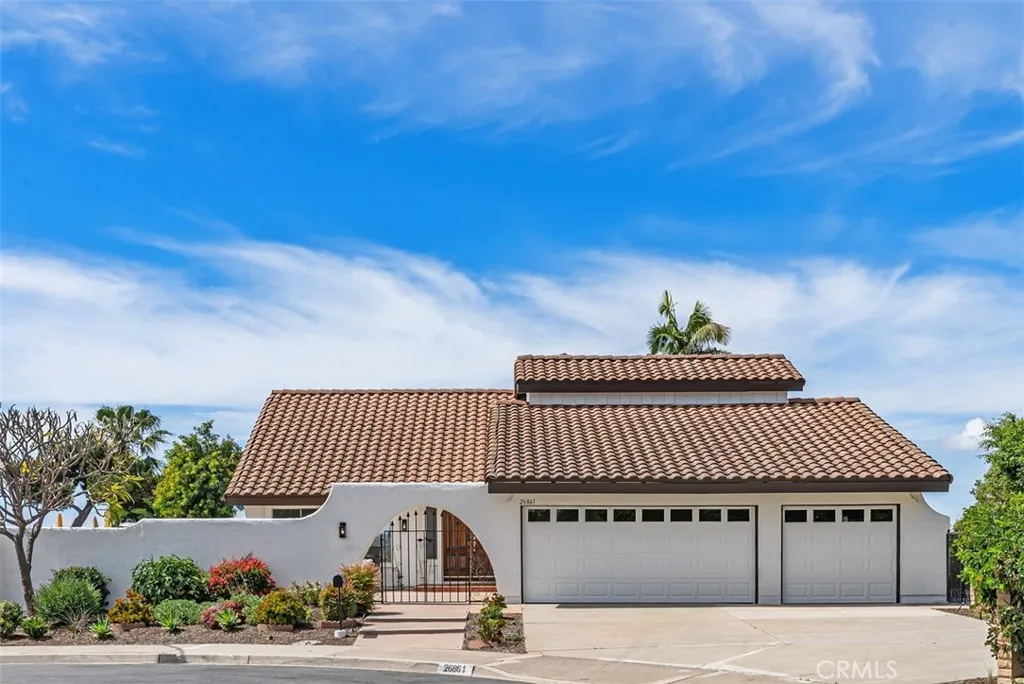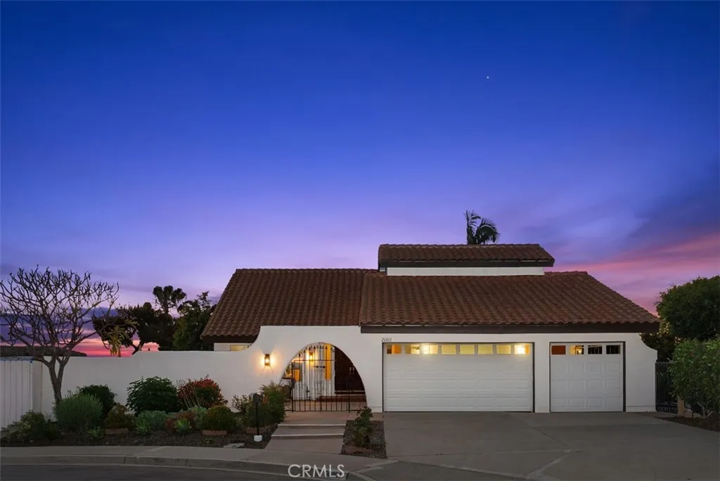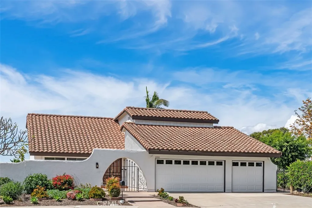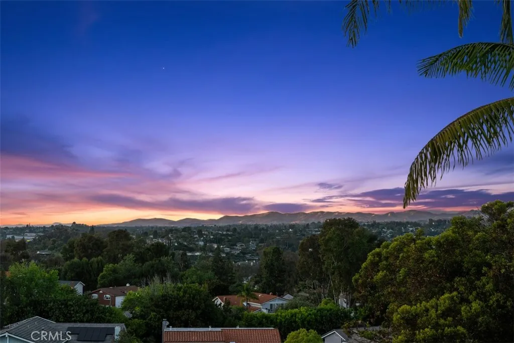 Welcome to 26861 Quevedo Lane nestled at the end of a quiet, CUL-DE-SAC street with PANORAMIC, WEST-FACING SUNSET VIEWS! This home offers exceptional privacy with only one true neighbor, a single-level home on one side, and a rare wrap-around yard that enhances both space and seclusion. Perched at the top of the hill, enjoy sweeping views from the backyard and from the home’s most important living spaces, including the kitchen, dining room, family room, primary suite, and two secondary bedrooms. Step inside to soaring vaulted ceilings, a dramatic sweeping staircase, and an array of windows allowing an abundance of natural light that fills the home. The main level features a versatile den with sliding glass doors to the side yard, perfect as a home office, guest space, or easily converted into a MAIN FLOOR BEDROOM. A convenient powder room and interior laundry room add to the home’s functionality. The kitchen is perfectly positioned to take in the stunning views with a large picture window over the sink, a charming eat-in breakfast nook, and seamless flow into the dining room. The adjacent family room, complete with a cozy fireplace, opens directly to the expansive backyard—ideal for entertaining or simply relaxing while enjoying the sunset. Upstairs, the spacious primary suite captures breathtaking panoramic views and offers a large walk-in closet, dual vanities, and a generous walk-in shower. Four additional bedrooms, a secondary bathroom with dual sinks and tub/shower combo, and a large linen closet complete the upper level. Freshly painted with brand new carpet and a FULL PEX REPIPE, this home is move-in ready and offers an incredible opportunity to customize and make it your own—all while enjoying one of the best locations, lots, and views in the neighborhood. Inquire about MULTIPLE SCHOOL OPTIONS unique to this desirable neighborhood. Enjoy the option to join Lake Mission Viejo with swimming, BBQ’s, fishing, boat & paddleboard rentals, concerts & events. Just a short stroll away is SIERRA REC CENTER with multiple membership options to the pool, spa, water slide, fitness center, & more as well as walking and biking trails, Mission Viejo Country Club, the 5 freeway, shopping & restaurants and only a 10-15 minute drive to world class beaches, 5-star resorts, Laguna Beach, Dana Point Harbor, the Lantern District & MORE! Welcome Home!
