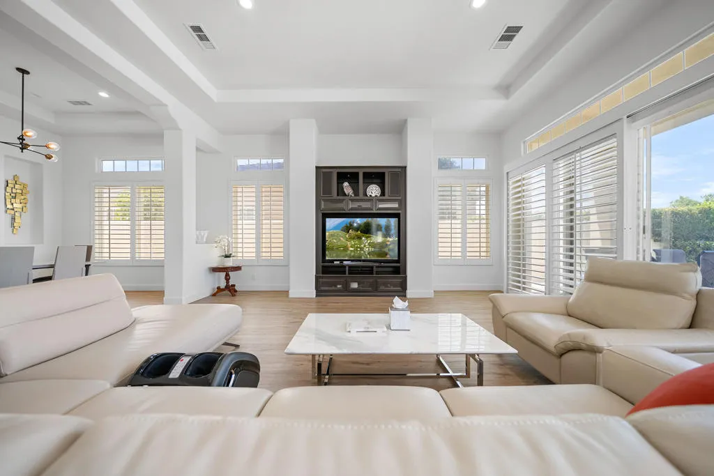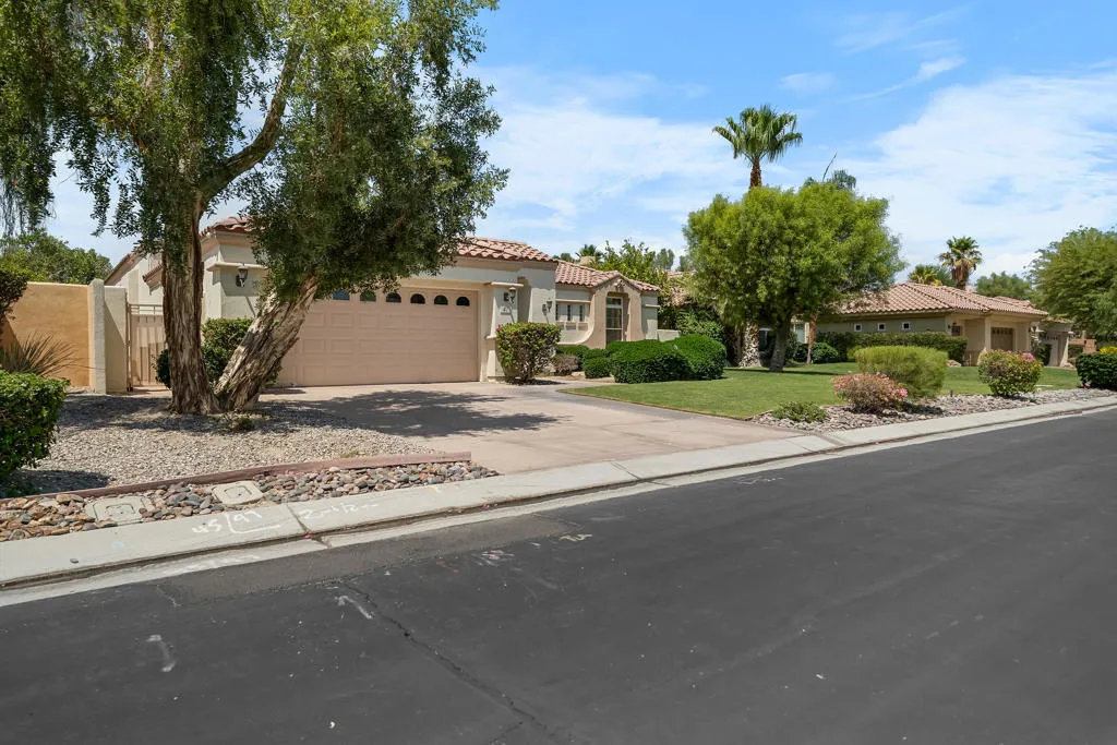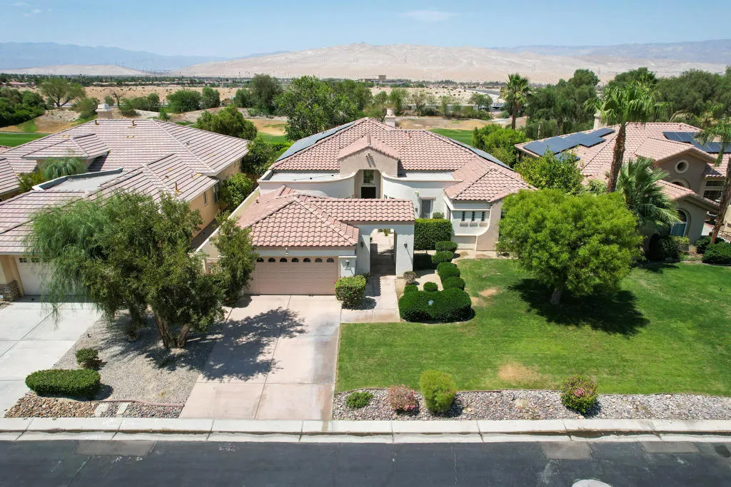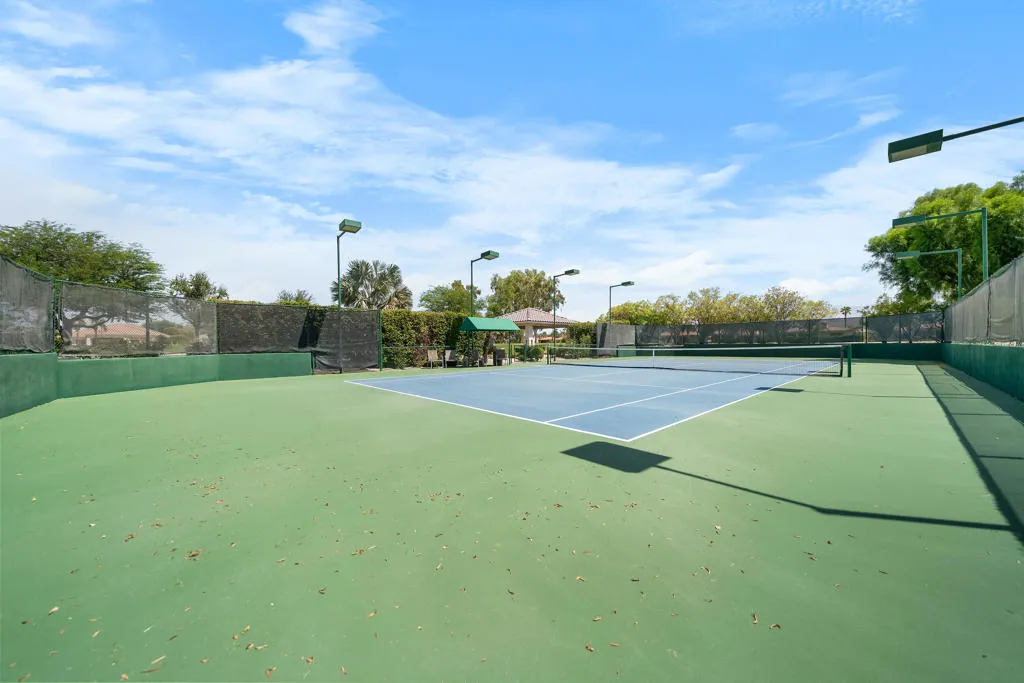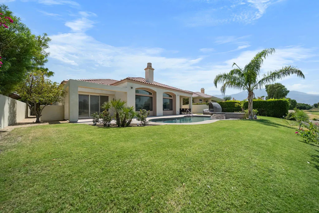 On the 3rd hole of the Mission Hills Gary Player Course, this updated and well-maintained 3 bedroom, 4 bath home offers golf course views and a bright, functional layout. The north facing front door brings in soft natural light while maintaining ideal desert orientation.Located in a gated community with a low HOA, residents enjoy tennis courts, pickleball, bike paths, and multiple community pools perfect for an active desert lifestyle.The home includes leased solar for energy efficiency and a tankless hot water heater for modern convenience. All three large bedrooms feature their own private exit to either the backyard or courtyard, creating excellent separation and flexibility for guests or multi use living.
