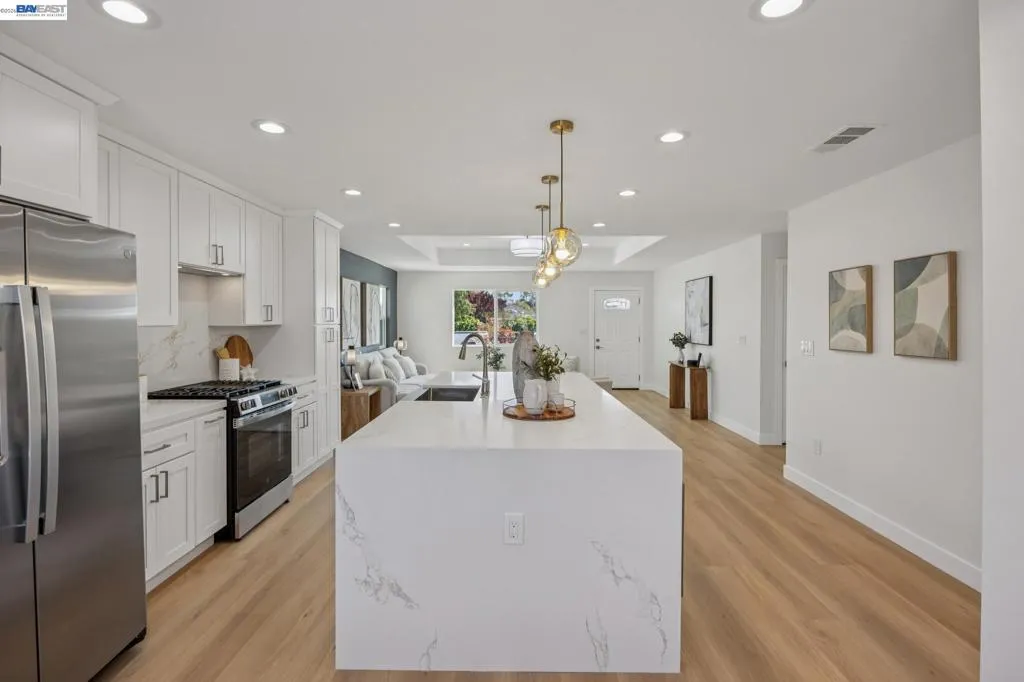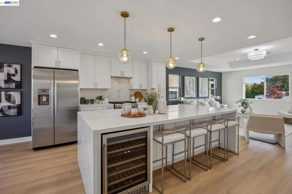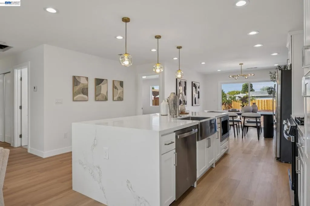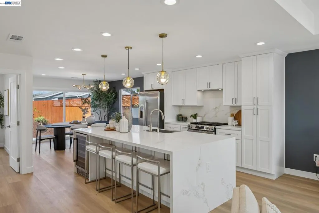 Step into this stunning, like-new residence, thoughtfully rebuilt down to the studs with full permits—delivering the quality, efficiency, and peace of mind of modern construction in a quiet, family-friendly neighborhood. Offering nearly 1,500 square feet of living space, this single-story home features a bright and functional three-bedroom, two-bathroom layout filled with natural light. At the heart of the home, the chef-inspired kitchen shines with a dramatic waterfall quartz island, stainless steel appliances, shaker cabinetry, gas range, and a built-in wine fridge—perfectly designed for both everyday living and effortless entertaining. The spacious primary suite serves as a private retreat, complete with 2 closets, including a walk-in, and a beautifully appointed en-suite bath. No detail was overlooked in this comprehensive renovation, which includes all-new framing, drywall, insulation, electrical, plumbing, central heating/AC, and all new interior finishes. The exterior has been equally refreshed with new stucco, a concrete driveway, new garage door, and a new fence—enhancing both curb appeal and functionality. The expansive, low-maintenance backyard offers incredible potential for a future ADU, garden, or outdoor living space. Ideally located, you’re just moments from Sprouts Farmers Market, Coyote Hills Regional Park, and top-rated schools such as Challenger and Stratford. With easy access to the Dumbarton Bridge and Highway 880, and close proximity to major employers including Tesla, Lucid Motors, Meta, and Google, this home perfectly balances modern luxury, comfort, and everyday convenience.