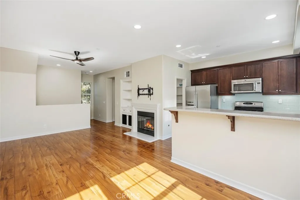 Welcome to your new home in the heart of Columbus Square. This beautifully updated, turnkey tri-level townhome offers 2 bedrooms and 2.5 baths, with thoughtful upgrades throughout. From the newer gas water heater and Wi-Fi–enabled garage door motor to the neutral paint, LED recessed lighting, and custom Roman shades, every detail has been carefully considered. On the first level, you’ll find a convenient indoor laundry room with a full-size washer and dryer, ample cabinetry, and space for folding. There’s also a storage closet and direct access to the attached two-car garage, plus your own private driveway—a rare and valuable feature in this community. Upstairs, the main living area is bright and inviting, featuring engineered wood floors, a cozy gas fireplace, and an open layout that flows seamlessly into the dining space. The living room includes a built-in media cabinet and pre-installed TV mount, making it both functional and comfortable. A modern ceiling fan and nearby breakfast bar make everyday living and entertaining effortless. The kitchen is light and modern, showcasing quartz countertops, a glass tile backsplash, under-cabinet lighting, and sleek wood cabinetry. Stainless steel appliances—including the refrigerator, dishwasher, microwave, and gas cooktop—are all included, and a spacious pantry provides plenty of storage. A powder room and additional cabinetry complete this level. On the top floor, the spacious primary suite features custom Roman shades, a ceiling fan, TV mount, and a large walk-in closet. The en-suite bathroom offers dual vanities and a shower-tub combination. The secondary bedroom is versatile and ideal for a home office, workout space, or guest room, with its own ceiling fan, ample closet space, and easy access to a full bath. Located just steps from the greenbelt, you’ll enjoy access to community amenities including basketball courts, BBQ and picnic areas, and open green spaces. You’re also conveniently close to the OC Airport, Metrolink, major freeways, and The Village at Tustin Legacy, where shopping, dining, and everyday essentials are just minutes away. This home truly has it all—style, comfort, and an unbeatable location. Don’t miss the opportunity to make it yours.