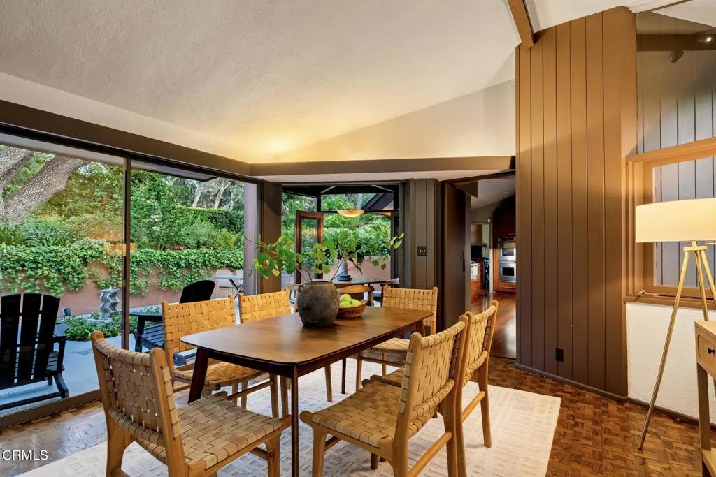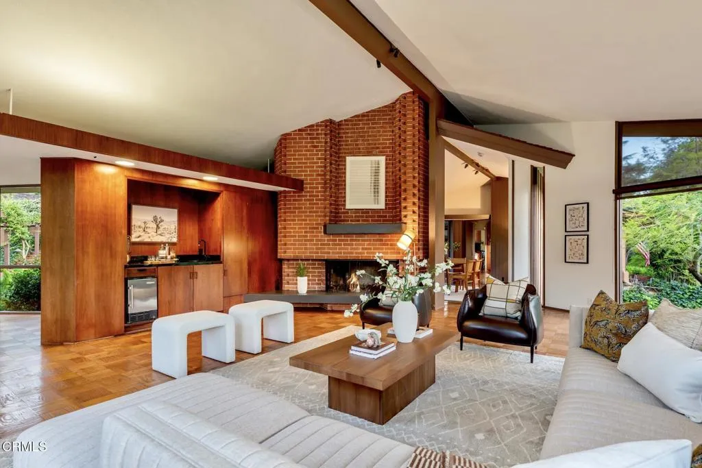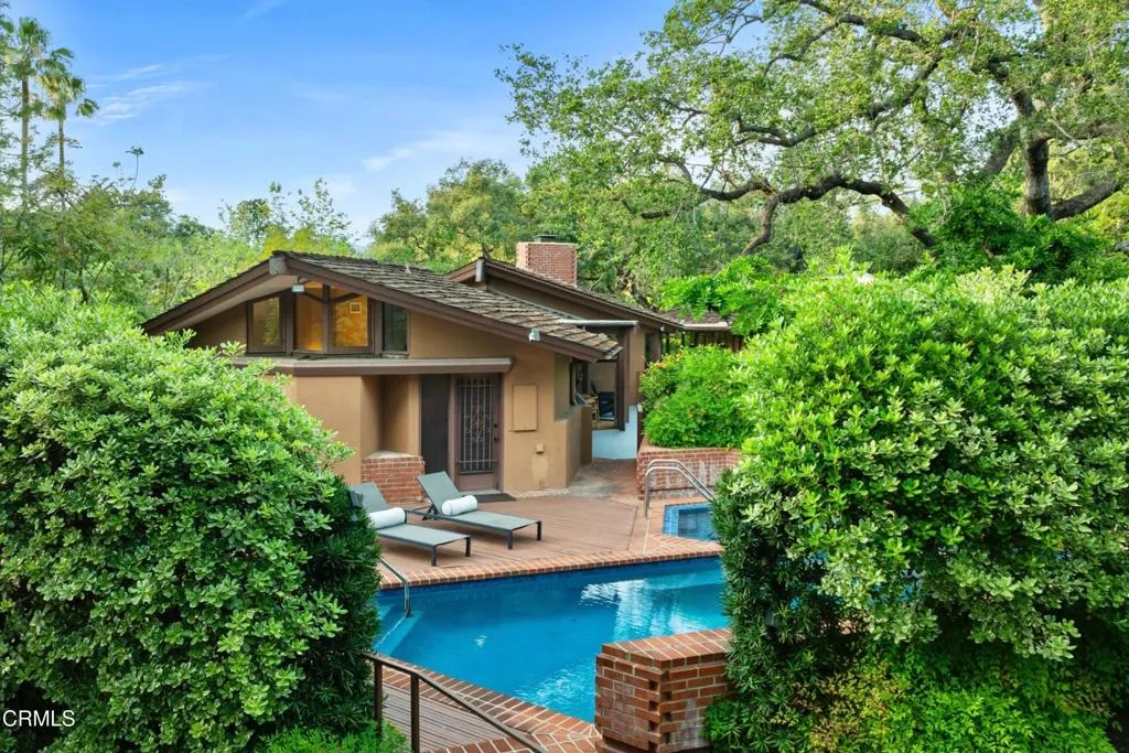 Tucked amid the treetops of Lacy Estates, this iconic 1953 Mid-century Modern home, designed by acclaimed architect Whitney R. Smith, AIA, is a masterclass in streamlined, organic shapes and indoor/outdoor integration. Situated on nearly an acre, the private, gated compound offers an enchanting escape with walls of floor-to-ceiling glass, framing a sweeping panorama toward the San Gabriel mountains. The private retreat boasts 3,768 square feet of refined living space, including 4 bedrooms, an office, and 3 baths. The dramatic living room with a 14 foot high ceiling features access to a wraparound wood deck, brick fireplace and an elegant wet bar ideal for crafting the perfect martini. The gourmet kitchen is a modernist's dream, updated with high-end stainless steel appliances and treetop vistas, while the adjacent light-filled breakfast area showcases the front courtyard. Practicality is discreetly handled with a separate laundry area off the kitchen, featuring ample counter space and a sink. The fourth bedroom and bathroom, ideal for guests, is adjacent to the laundry area. The main living area is separated from the private bedrooms by a glass-enclosed hallway - a cinematic bridge rising over a flowing babbling brook and stone-encased pond. The primary suite features a generous 300 sq ft walk-in closet and an ensuite full bathroom bathed in natural light from the geometric skylights above. There are two adjacent bedrooms and baths plus a private cozy office. Outside, the lush, spectacular landscaping features mature oak trees, expansive decks for entertaining, and a unique hexagon-shaped pool and spa. A brick walkway, shaded by mature vines, leads to the front door, while a unique, impressive light fixture--a gift to the former owner from Chiang Kai-Shek--adorns a front yard oak. Gated, with up to 12 parking spaces and a two-car garage with an additional bonus room and 3/4 bath, this iconic, private sanctuary feels worlds away, yet is minutes from Pasadena and Los Angeles. Filled with clean lines and stream-lined organic shapes, this tailored, elegant, modernist home is aspirational living defined.