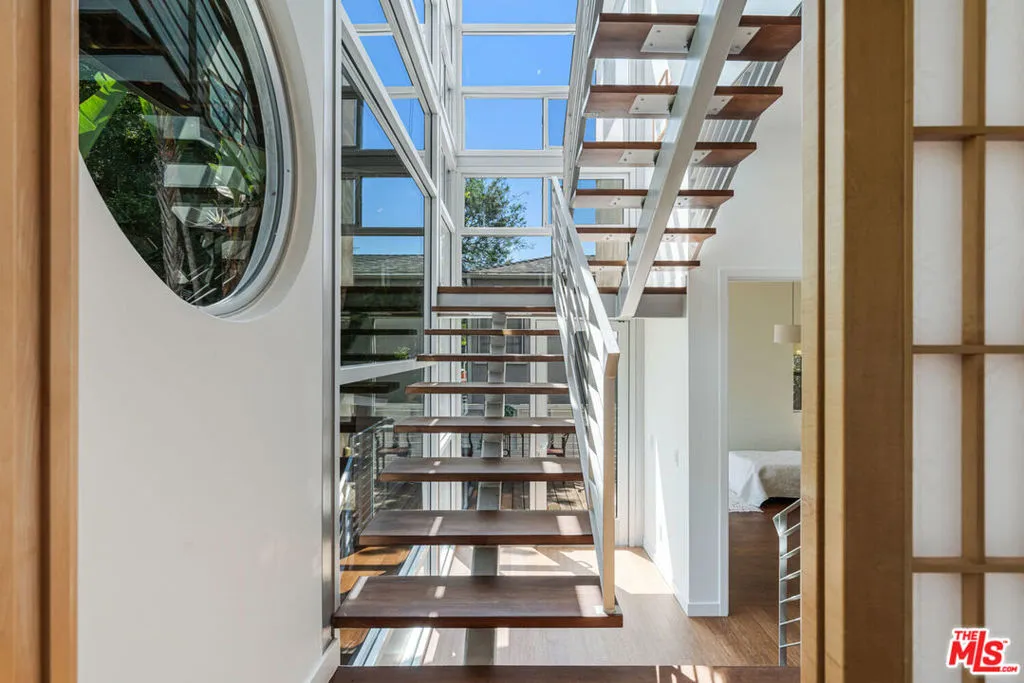 Perched on a knoll in Cheviot Hills' Monte Mar enclave, this custom architectural residence by Eric C. Chang, AIA, reveals a quiet sophistication, where an understated exterior gives way to a deeply intentional interior shaped by light, proportion, and thoughtful design. Rebuilt from the ground up in 2012-2013 and thoughtfully upgraded over the past year, the home draws inspiration from the philosophy of "round heaven, square earth," with circular and linear forms woven throughout to create a sense of harmony, balance, and flow. Sunlight fills the south-facing interiors, where open living spaces unfold with ease and continuity. The main level is conceived as a continuous living space, with living, dining, and kitchen areas flowing together, framed by expansive windows that capture soft greenery and hillside views. Circular openings and windows act as sculptural portals, establishing a quiet architectural rhythm, while a dramatic glass-enclosed stairwell introduces movement and layered perspectives across levels. Also on the main level, the primary bedroom suite offers a private retreat, complete with a spa-like bath featuring dual vanities, a soaking tub, separate shower, and two generous walk-in closets. At the heart of the home, a beautifully crafted washitsu room with tatami flooring and shoji screens offers a rare and versatile living experience, equally suited for tea gatherings, intimate dining, meditation, or yoga. Both serene and social, it reflects a lifestyle that values presence, connection, and balance. Additional tatami-accented spaces extend this design language, creating a cohesive sense of calm throughout. Designed for both active living and quiet retreat, the lower level is anchored by a family room with soaring 14-foot ceilings and a new fireplace, complemented by three en-suite bedrooms with walk-in closets, and a dedicated office positioned for privacy and flexibility, including its own entrance. Outdoors, terraced gardens and mature plantings, including tall bird of paradise, create a lush, layered setting that enhances both beauty and stability, offering inviting spaces for entertaining, play, or peaceful moments throughout the day. Located near Rancho Park Golf Course, Cheviot Hills Park, and key Westside access, this residence offers a rare balance of architectural clarity, warmth, and a lifestyle that feels at once active, connected, and quietly restorative. (Please note: Public records show 4 bathrooms, but there are actually 3 full baths, one 3-quarter bath, and a powder room. According to owner/architect, the city approved bathroom additions and signed off on the Certificate of Occupancy.)