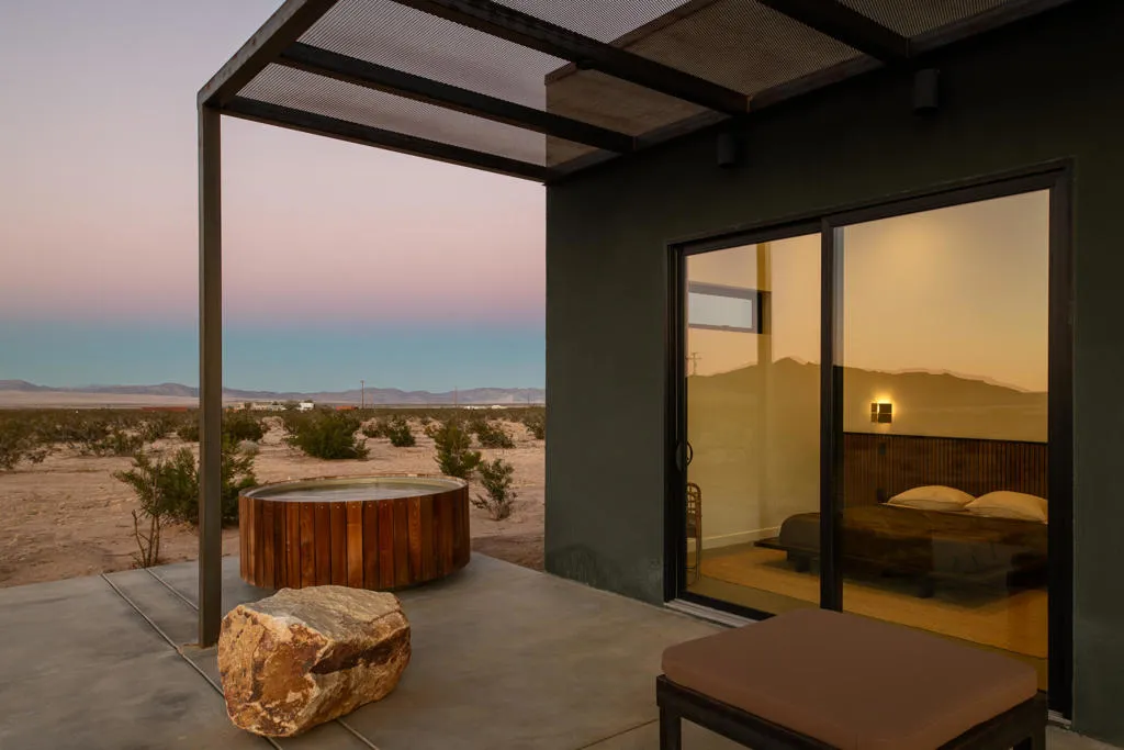 The Goat Mountain House.A 2024 architectural compound in the Joshua Tree area, set against the raw beauty of the Mojave.Welcome to The Goat Mountain House, a contemporary, design-forward retreat conceived for those who value architecture as art. Completed in 2024, this modern minimalist compound comprises two sculptural volumes: a striking main residence and a generous guest house, each thoughtfully positioned to harmonize with the surrounding landscape and capture the quiet grandeur of Goat Mountain.The main house features clean lines, smooth stucco walls, and soaring ceilings that create a sense of calm and openness. Floor-to-ceiling glass frames expansive High Desert views, flooding the interior with natural light and connecting every space to the rugged beauty outside. A refined kitchen with a large island anchors the open-concept layout, flanked by two serene bedrooms and a spa-like bath.A west-facing covered patio extends the living area outdoors, ideal for al fresco dining beneath endless desert skies. Between the two structures, a mature olive tree offers a sculptural focal point and anchors the flow of the compound.The guest house mirrors the home's aesthetic with its own living area, kitchenette, two bedrooms, and a beautifully finished bath. Outside, a wood-paneled hot tub and private patio create a perfect vantage point for stargazing or quiet morning coffee.Set in one of the most desirable pockets of the desert, the property offers rare tranquility, sweeping panoramic views, and a feeling of total serenity, all just minutes from Joshua Tree National Park, La Copine, the Integratron, and the shops and dining of Pioneertown and Yucca Valley.Custom planter boxes with sculptural cacti and a bespoke stone fire feature complete the setting, an intentional blend of restraint and warmth.More than a home, The Goat Mountain House is a living composition, an architectural retreat that functions beautifully as a full-time residence, a second home, or a design-forward short-term rental investment. It embodies the essence of the High Desert with expansive views, inspired design, and absolute quiet.
