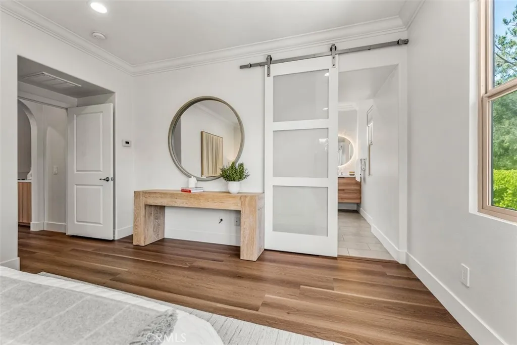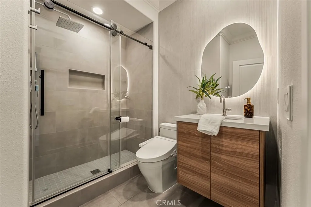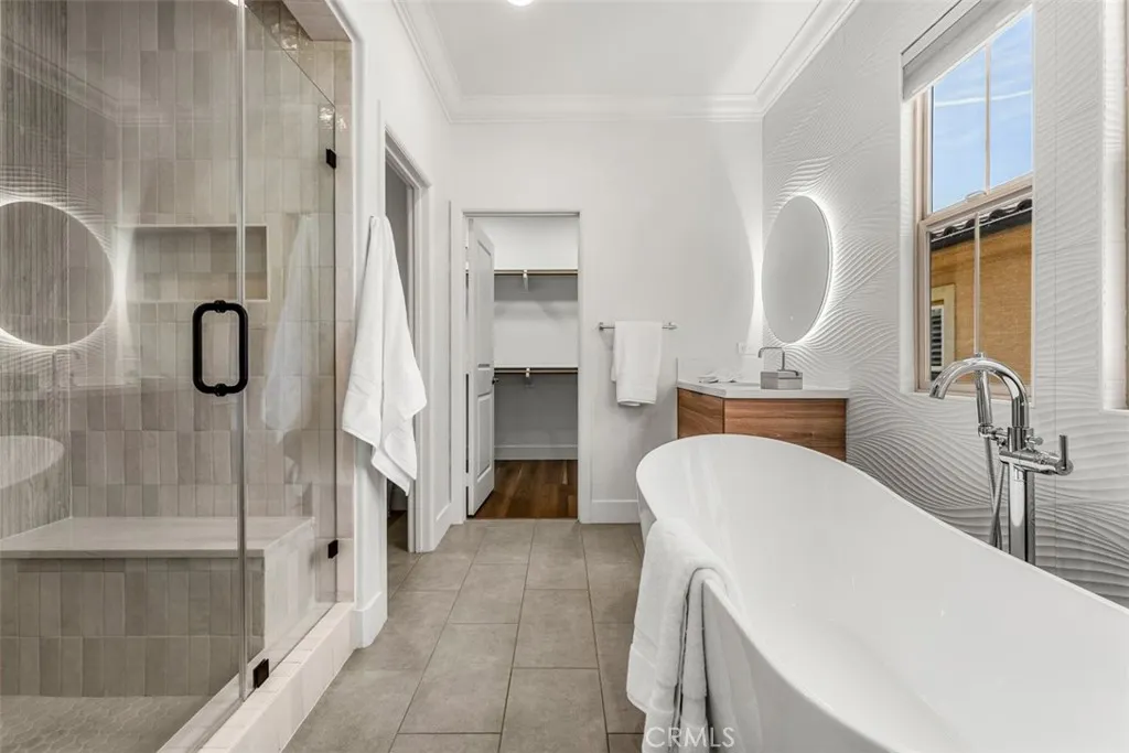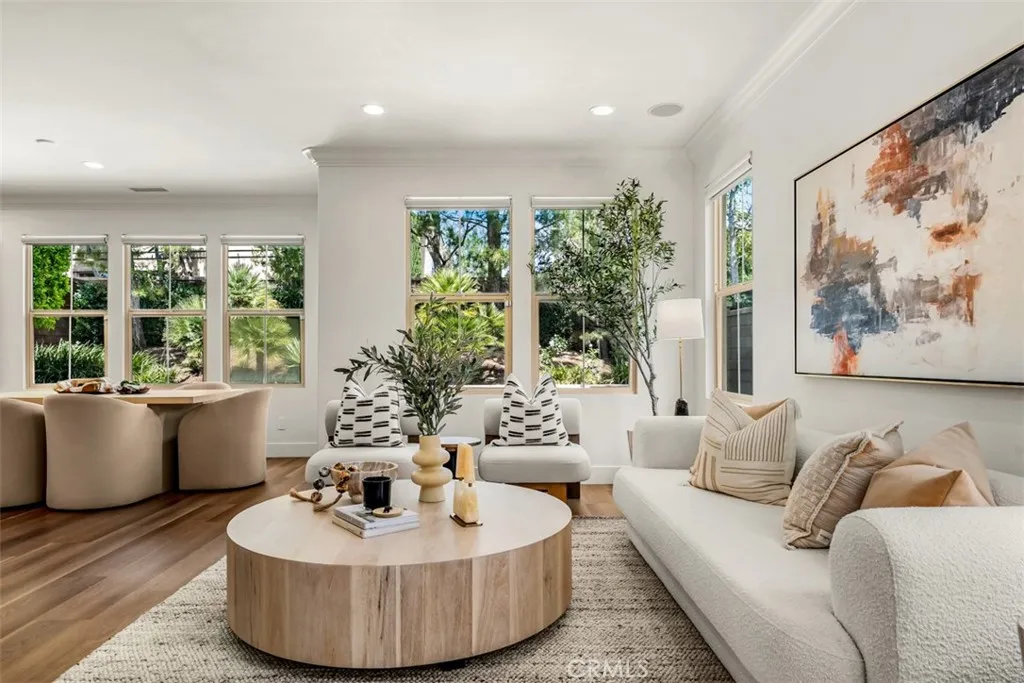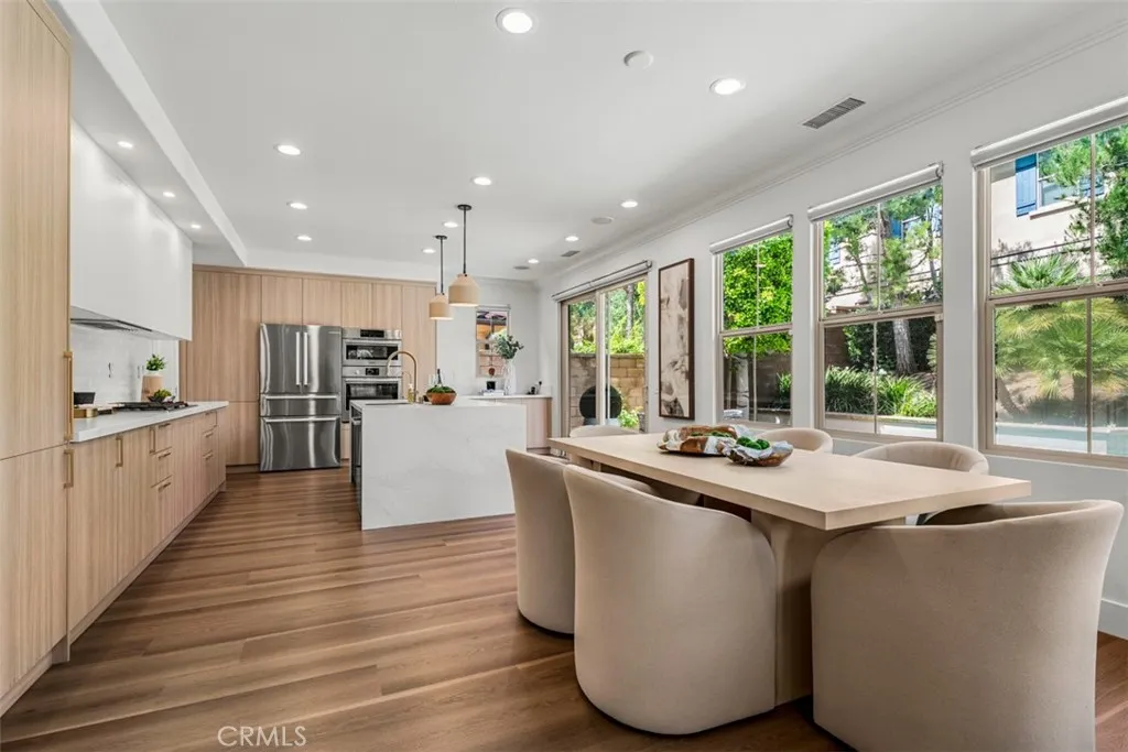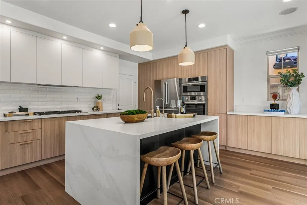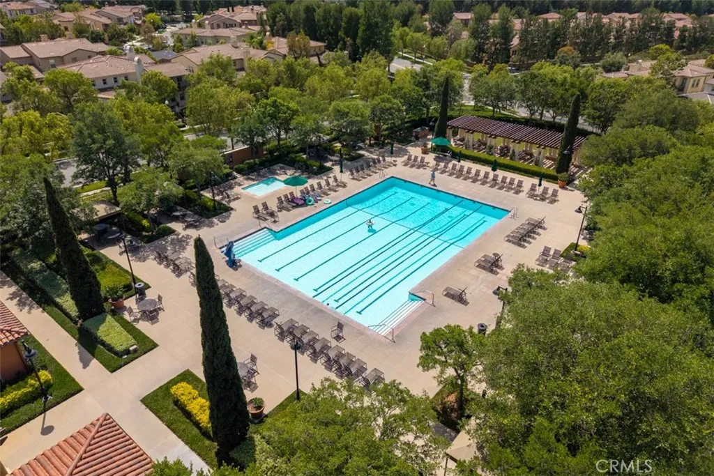 Set on a coveted corner lot within the Paloma enclave of Portola Springs, this extensively remodeled residence spans approximately 2,339 square feet of thoughtfully designed living space. Offering four bedrooms and three full bathrooms, the home unfolds through an open-concept floor plan where the living, dining, and kitchen areas flow effortlessly together. Abundant natural light fills the interiors, enhancing wide-plank flooring and refined designer finishes throughout. The kitchen features Silestone counters, Wolf and Bosch stainless steel appliances, custom cabinetry, Porcelanosa tile backsplash, and a waterfall-edge eat-in island beneath pendant lighting. Sliding glass doors invite you to a resort-inspired backyard where a private pool and water feature sit nestled within lush, mature landscaping — a true retreat from the everyday. A main-level bedroom, currently serving as an office, is situated alongside a remodeled bath with a walk-in shower, dual shower heads, and a backlit mirror, allowing for flexible use as guest space or a workspace. Upstairs, three bedrooms surround a versatile loft that functions well as a secondary living area, media space, or lounge. The primary suite is positioned as a private retreat featuring a spa-inspired bath features dual vanities, a freestanding soaking tub, and a spacious walk-in shower, complemented by a large walk-in closet. Completing the second level is a dedicated laundry room with built-in cabinetry and sink. Life in Portola Springs is defined by its balance of natural setting and everyday convenience—set against scenic foothills with miles of walking and biking trails, while offering access to multiple resort-style pools, parks, sports courts, and community spaces throughout the village. Highly regarded Irvine Unified schools, nearby shopping centers including Woodbury Town Center, and convenient access to major freeways position the home within one of Irvine’s most sought-after master-planned communities.