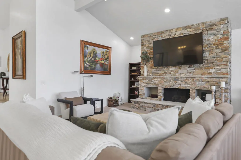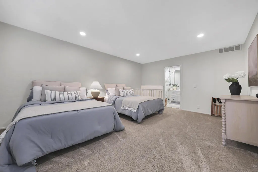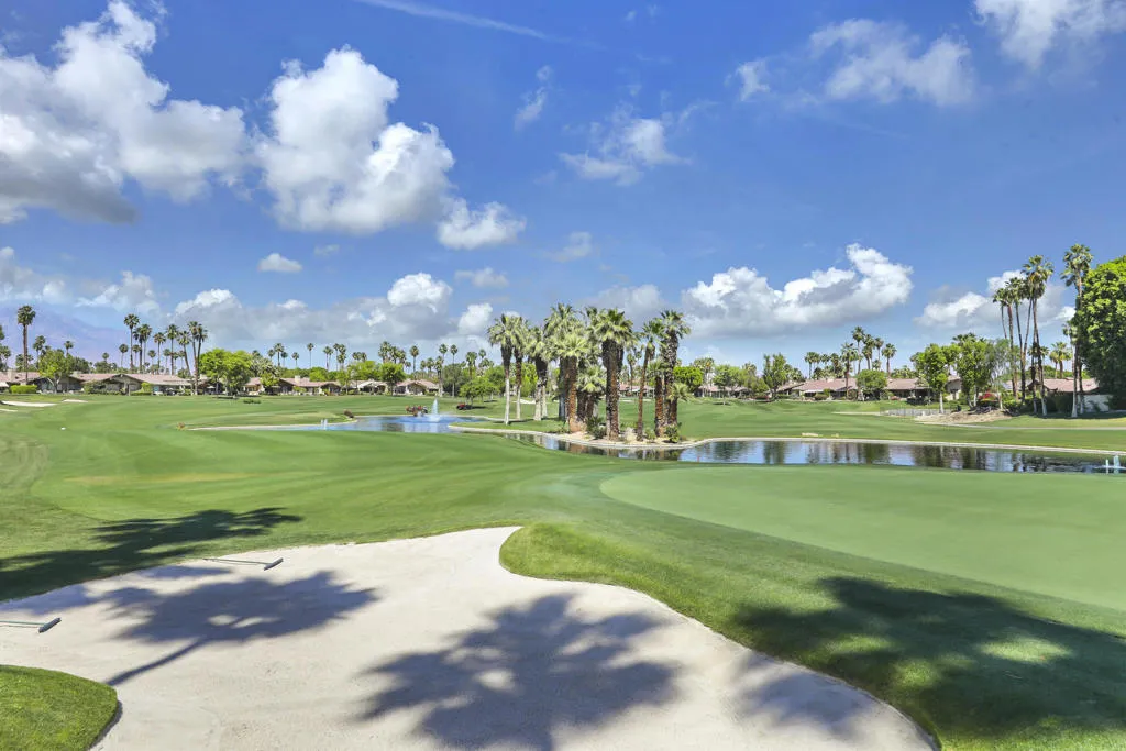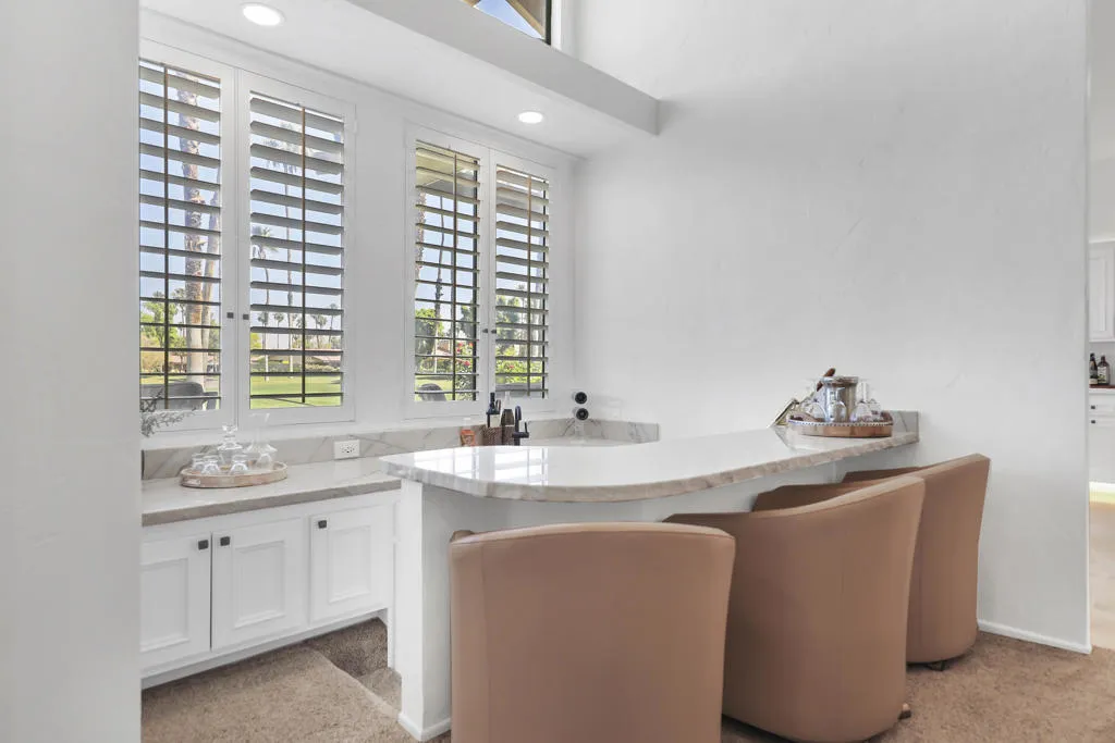 This Taos floorplan is one of the most desirable layouts in The Lakes Country Club! Located on a quiet interior street with minimal exterior noise. Offering approximately 2,800 square feet, this thoughtfully designed home features two spacious bedrooms plus a versatile den that easily functions as a third bedroom, along with four beautifully updated bathrooms. All sleeping areas are thoughtfully separated for an abundance of privacy.Designed with light and openness in mind, the home showcases an expanded great room created by removing walls for seamless flow between living spaces. A custom fireplace of stacked stone is artistry at its best. The kitchen has been tastefully upgraded with new cabinetry and elegant white and gray quartz countertops, creating a clean, modern aesthetic. Polished flooring runs throughout the main living areas, while plush carpeting adds comfort to the bedrooms. Newer appliances make this home move-in ready.Natural light pours in through walls of glass and high windows, all enhanced by plantation shutters, framing breathtaking views of the lake and golf course beyond. The extended patio is perfectly positioned to capture these stunning vistas and offers ample space for outdoor living and entertaining--ideal for enjoying the serene desert evenings.This is a rare opportunity to own a light-filled, beautifully updated home in one of the community's most sought-after locations.