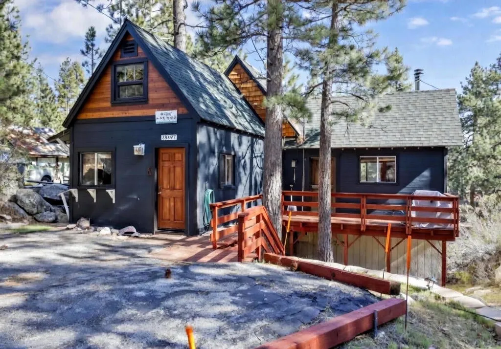 Welcome to the quiet neighborhood of Fawnksin, on the North Shore of Big Bear Lake. Known for its colorful history with celebrities, a familiar movie filming location, some of the oldest buildings in the Big Bear Valley, and boulder terrain; you will find a quaint town with 300+ homes on the north side of the Lake. There is immediate access to the famous Big Bear City with just a short 10 minute drive. This 2 bedroom 1 bathroom cabin is awaiting its new home owners. Just the perfect size for a mountain cabin, over 800 square feet of living space to make it your comfortable forever home, get-away escape or rental. Stainless steel appliances with thick granite counters/backsplash, and natural wood tones throughout all interior. Under cabinet accent lighting. Bedroom 1 is on the main floor and the bedroom 2 is upstairs. The living room boasts pitched ceilings and a wood burning stand-alone fireplace. This cabin has side decking views of the north and backyard decking with views of the south to take in the pines and inhale the fresh mountain experience. The exterior lot sits on just over 5000 square feet and displays the boulders and pine trees for that epic mountain surrounding. This area known for its boulders and charming surroundings overlooking Big Bear Lake with views of Snow Summit. Showings maybe postponed due to complete painting of exterior. Call for inquiries and viewings.