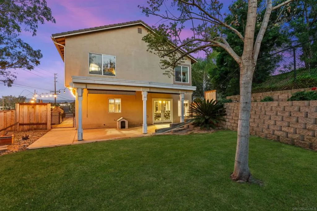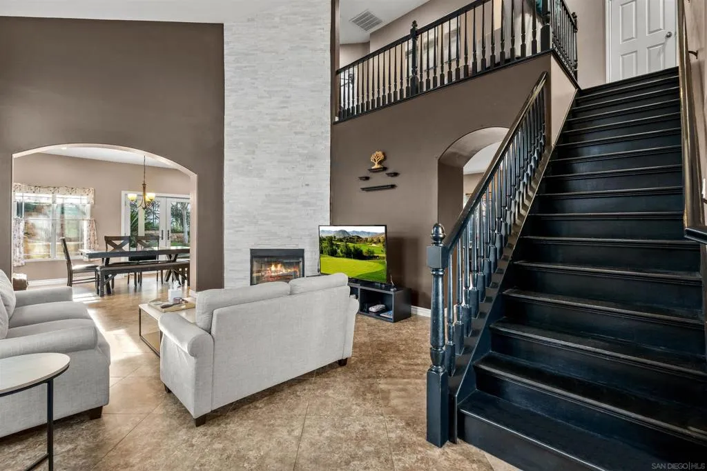 Welcome to a private estate in the heart of Escondido, where refined living meets everyday comfort. Tucked at the end of a long driveway, this two-story residence offers exceptional privacy with no neighboring homes crowding the surroundings, creating a peaceful retreat while still being close to dining, shopping, and daily essentials. A dramatic two-story entry sets the tone, highlighted by a stunning floor-to-ceiling stacked stone fireplace that anchors the main living space. Expansive windows fill the home with natural light, enhancing the open and functional layout designed for both comfort and style. The formal dining room connects seamlessly to the main living areas, ideal for entertaining. The kitchen features granite countertops, stainless steel appliances, abundant cabinetry, and a spacious breakfast bar for casual dining. The adjacent family room opens to the backyard through a wall of windows, creating a seamless indoor-outdoor flow. Upstairs, the primary suite offers a private escape with vaulted ceilings and a spa-like bath complete with soaking tub, glass-enclosed shower, dual vanities, and ample storage. The outdoor space is designed for both relaxation and entertaining, featuring multiple seating areas, a grassy lawn, mature fruit trees, and a covered patio. Enjoy the rare bonus of viewing holiday fireworks from your own backyard. Additional highlights include a 3-car garage, RV parking, and fully paid solar—resulting in no electricity costs. No HOA and no Mello Roos.