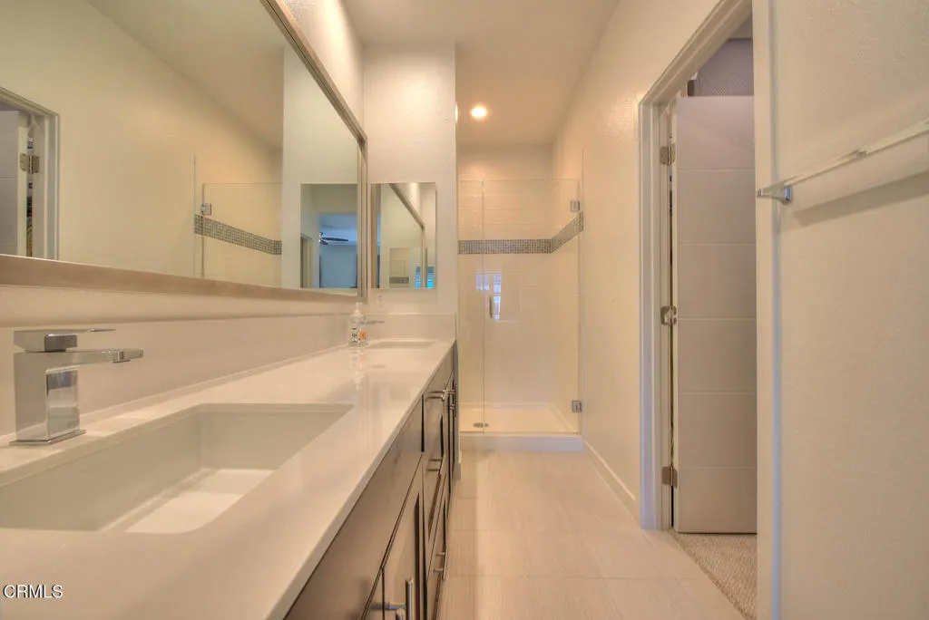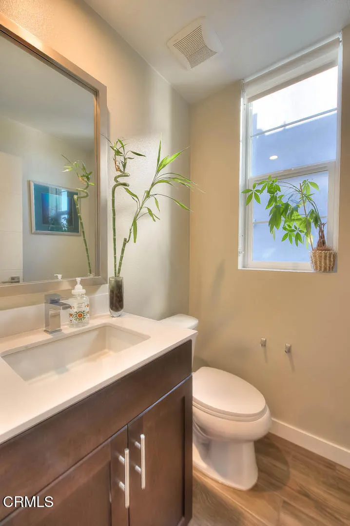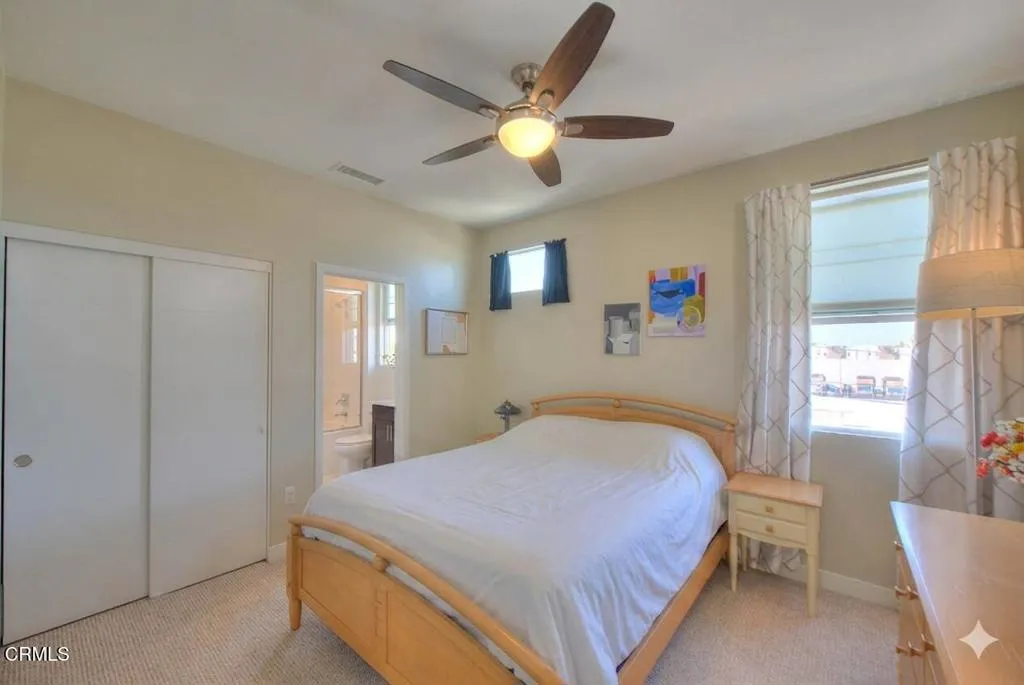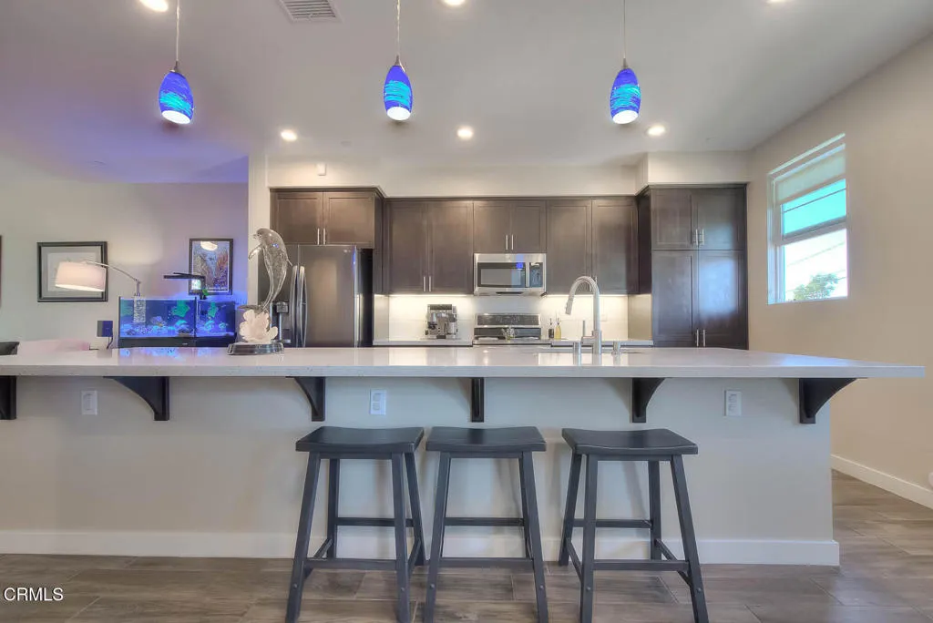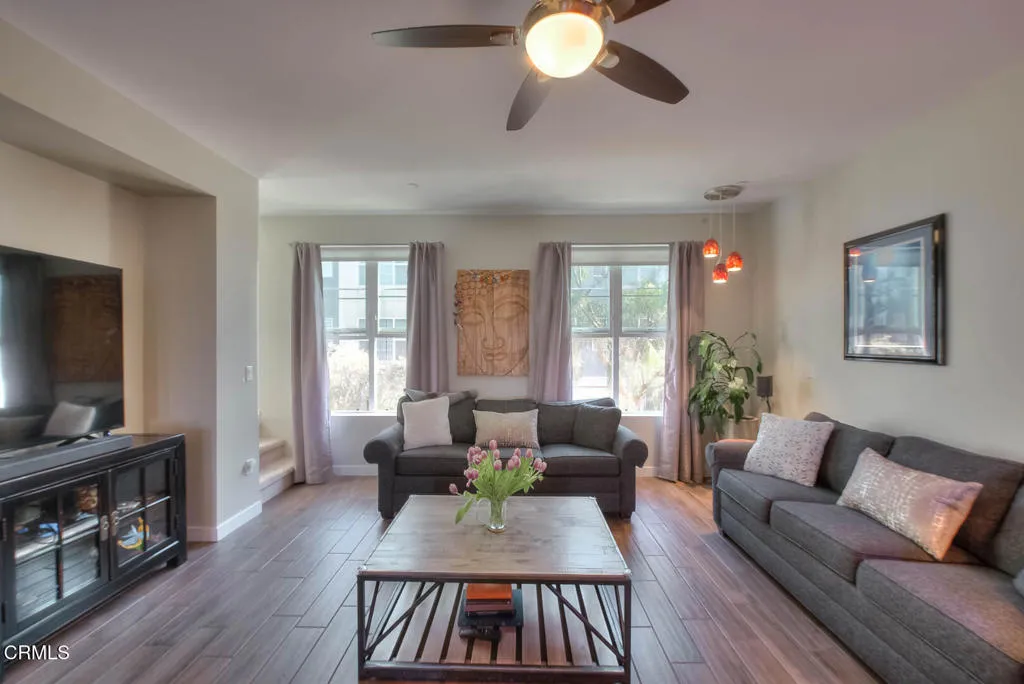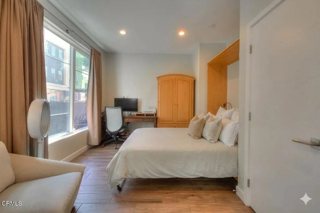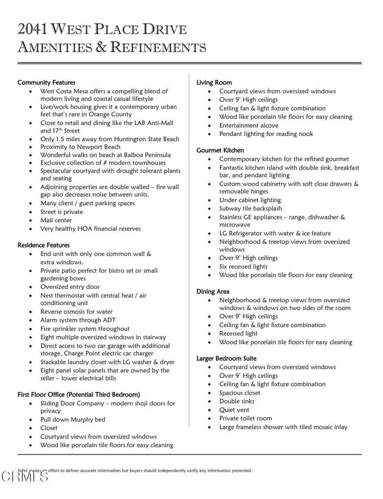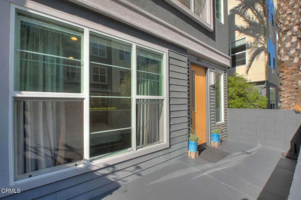 Completed in 2015 and impeccably maintained, this sophisticated south facing end-unit townhome exemplifies the best of modern design, functionality, and flexibility.A gated private patio welcomes you--an inviting outdoor space ideal for a bistro setting or curated garden planters. The ground level features a versatile office or optional bedroom, thoughtfully equipped with a Murphy bed and closet, making it perfect for guests, remote work, or creative use.The main living level is a showcase of contemporary living, offering an open-concept floor plan enhanced by soaring ceilings and expansive windows that flood the space with natural light. The living room is both stylish and functional, featuring a built-in entertainment alcove, ceiling fan, and a charming corner accented with pendant lighting--ideal for a reading nook or lounge space.At the heart of the home, the chef's kitchen impresses with an extended center island complete with dual sinks, breakfast bar seating, and designer pendant lighting. Stainless steel appliances, abundant counter space, and custom cabinetry with soft-close drawers and removable hinges elevate both form and function. The adjacent dining area is anchored by a statement chandelier and enjoys tranquil treetop views, creating a warm yet refined atmosphere for everyday living and entertaining.Upstairs, two well-appointed bedroom suites provide comfort and privacy. Each features high ceilings, ceiling fans, and oversized windows. The primary suite offers a spacious closet, dual vanities, a private water closet, and an expansive shower. The secondary suite enjoys serene treetop vistas and includes a full bath with quartz-topped vanity and a deep soaking tub.Designated as a live/work residence, this home offers exceptional flexibility for business use, creative studios, or professional services--all from the comfort of your own space. Ample guest and client parking further enhances its practicality. Energy efficiency is thoughtfully addressed with eight solar panels, helping to keep utility costs in check.Residents also enjoy a beautifully landscaped community courtyard with inviting seating areas--an ideal setting for relaxation or casual gatherings. This is a rare opportunity to own a modern townhome that seamlessly blends coastal-inspired living with urban convenience.