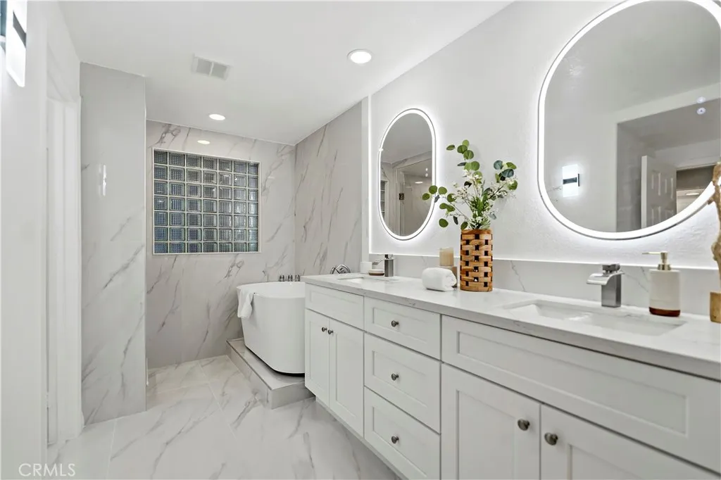 Luxury, convenient, and affordable—one of the largest and most desired models in the Metropolitan community. Ideally located on a corner lot with only one shared wall. Spacious patio with an exclusive-use planter, perfect for a personal garden, plus two assigned parking spaces. Thoughtfully designed dual-master layout with walk-in closets, including one oversized for a potential third bedroom or study. Bright and inviting 9-ft ceilings, recessed lighting, and crown molding. Fully upgraded kitchen and baths feature quartz countertops, breakfast bar, high-gloss soft-close cabinetry, and new appliances under a full-year warranty. Porcelain tile in kitchen and baths, dual vanities with waterfall faucets, and dimmable LED mirrors. One bath offers a walk-in shower, a freestanding soaking tub with massage jets; the other features a full-size walk-in shower with a marble bench. Separate toilet rooms for maximum privacy and utilization. Luxury vinyl flooring throughout the living and bedrooms. Prime Irvine Business Complex location—near major freeways and within walking distance to John Wayne Airport, banking, dining, and yet tucked in a quiet, private setting. Minutes from leading healthcare providers such as Hoag Urgent, UCI Health, and CHOC Children's, and premier shopping destinations like Diamond, The District, and South Coast Plaza. Maintenance-free lifestyle with resort-style amenities, professional on-site management known for its supportive community focus. Gated access with a guard and 24-hour security. HOA dues cover insurance, water, sewer, gas, trash, as well as access to the pool, spa, and fitness center.