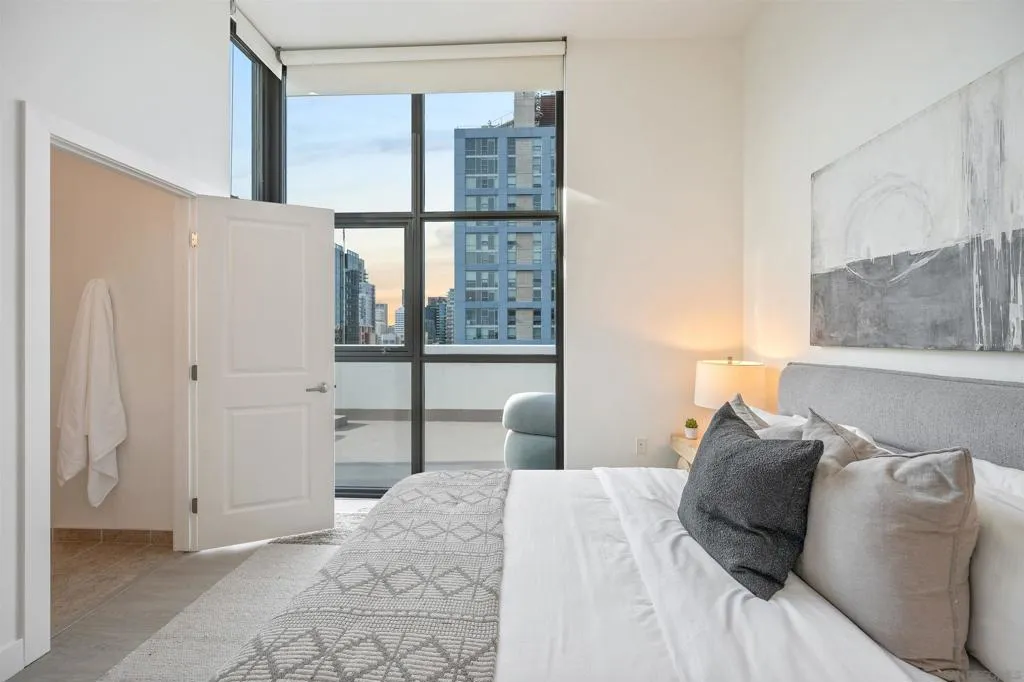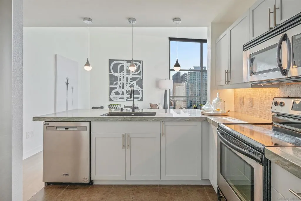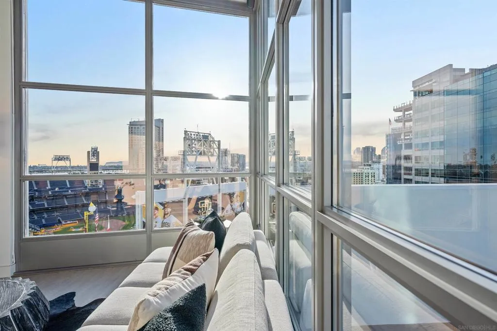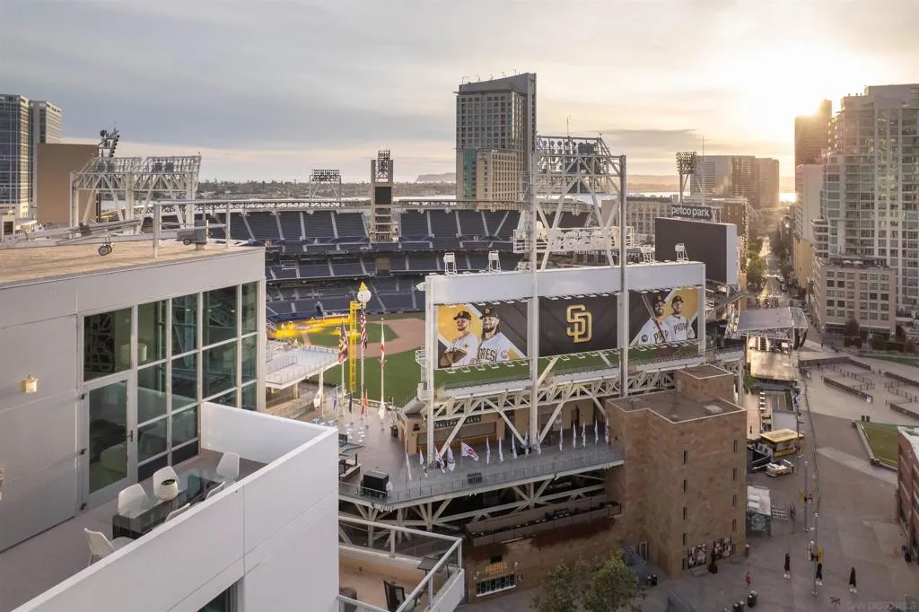 Penthouse with iconic Home Plate views—watch the Padres from your living room or your expansive private balcony. This 2 bed, 2 bath, 1,129 sq ft corner residence spans an entire side of the building, showcasing panoramic West, North, and East exposures with skyline and water views from Point Loma to Coronado. Enjoy incredible natural light through 14-foot floor-to-ceiling windows, along with newer flooring, fresh paint, and a remodeled kitchen. The unit offers rare privacy with only one shared wall, plus in-unit laundry, two prime P1 parking spaces by the elevator, and two private storage units. The oversized balcony is exclusive to the unit—not a shared space. Whether you are entertaining, relaxing, or catching a game from home, this penthouse delivers a truly unique Downtown lifestyle.