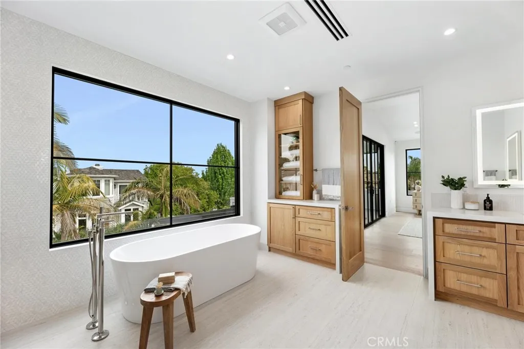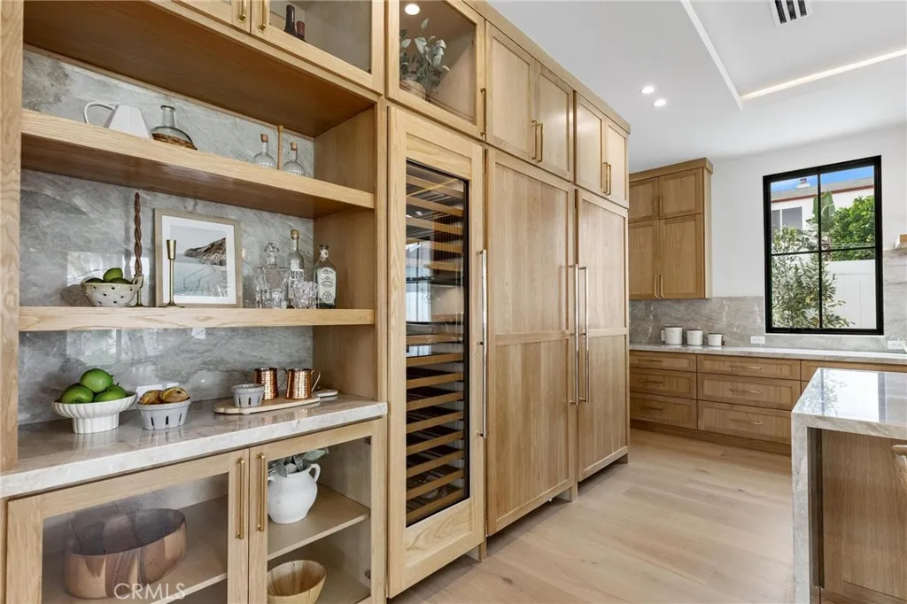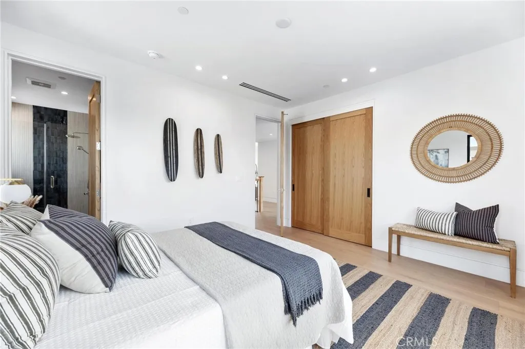 Newly built and thoughtfully designed, 1721 2nd Street blends contemporary architecture with timeless finishes, exceptional scale, and seamless indoor-outdoor living in the heart of Manhattan Beach. Entering through the oversized front door, a double-vaulted entry creates a striking first impression, with sightlines extending through the open-concept main level to the rear yard. Defined by 10-foot ceilings, expansive proportions, and walls of glass framed by oversized Marvin windows, the home is filled with natural light and a strong sense of connection throughout. A formal dining room offers an elegant setting for large-scale entertaining, flowing into the kitchen and main living areas. At the center of the home, the kitchen is anchored by a 10-foot Perla Venata quartzite island and features custom natural oak cabinetry and a full suite of premium appliances, including a 48-inch Wolf range, Sub-Zero refrigeration, full-height wine storage, and dual dishwashers. A secondary dining area opens directly to the backyard through oversized LaCantina doors. The main living room features a statement fireplace, custom built-ins, and seamless access to the outdoors. A 400-square-foot covered outdoor living room with fireplace, along with a built-in BBQ kitchen, extends the home’s footprint and enhances year-round livability. The main level also includes a versatile ensuite bedroom, powder room, and custom mudroom with direct access to the oversized three-car garage. Upstairs, three secondary bedrooms each offer ensuite baths and ample closet space. An oversized loft provides flexible living space, while the primary suite serves as a private retreat with a fireplace, terrace, and spa-like bath featuring a soaking tub, dual vanities, and a custom walk-in closet. Wide-plank white oak flooring, custom oak doors, curated stonework, and Perla Venata quartzite surfaces define the interiors, complemented by Brazo and Delta fixtures. A fully integrated smart home system with audio, lighting, and security, along with solar panels and fire sprinklers, enhances modern living. Defined by its open-concept layout and effortless indoor-outdoor connection, 1721 2nd Street offers a rare blend of modern sophistication and elevated coastal living in one of Manhattan Beach’s most sought-after locations.