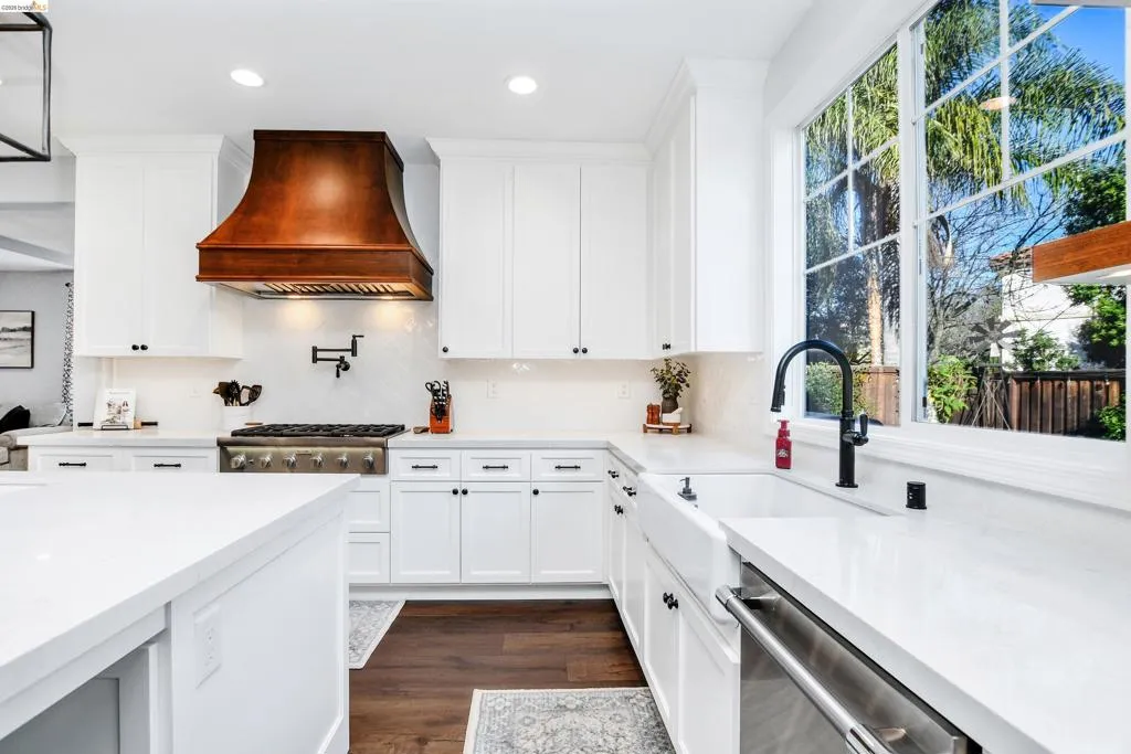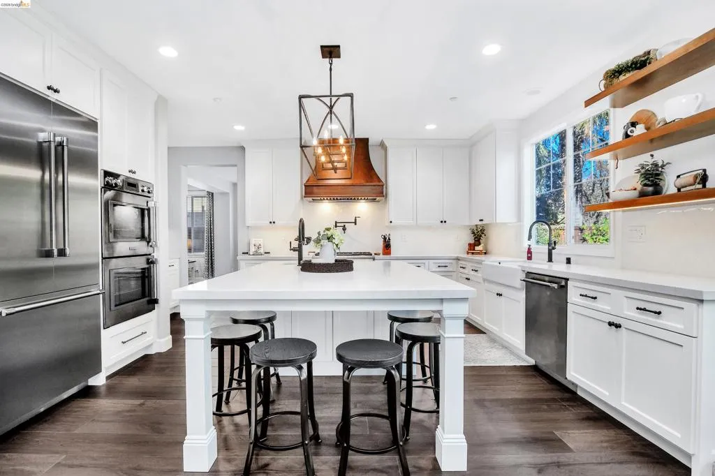 Coveted Montelena home offering elevated living throughout. The downstairs and staircase feature Cortec luxury vinyl plank flooring, creating a seamless, sophisticated look, while fresh baseboards add a crisp finish. Upstairs includes plush new carpeting and refreshed linoleum in the laundry room and bathrooms. The kitchen is a true showpiece, highlighted by a statement wood range hood, floating shelves, and matching mantel in the adjoining family room. Custom cabinetry extends to the ceiling, enhancing scale, with under cabinet lighting for added ambiance. The extended island is perfect for gathering, complemented by a full suite of Thermador appliances, including a 6-burner gas range, double oven, built in refrigerator, microwave drawer, and dishwasher. Designer finishes include quartz countertops, pot filler, chandelier, and full height backsplash. A walk-in pantry with custom cabinetry adds both style and storage. The family room opens to the backyard through French doors with retractable screens for indoor outdoor living. Additional features include dimmable recessed lighting, media lounge with a built-in, and an upstairs loft for flexible living space. Enjoy thoughtful upgrades, quality craftsmanship, and a layout designed for comfort and entertaining.