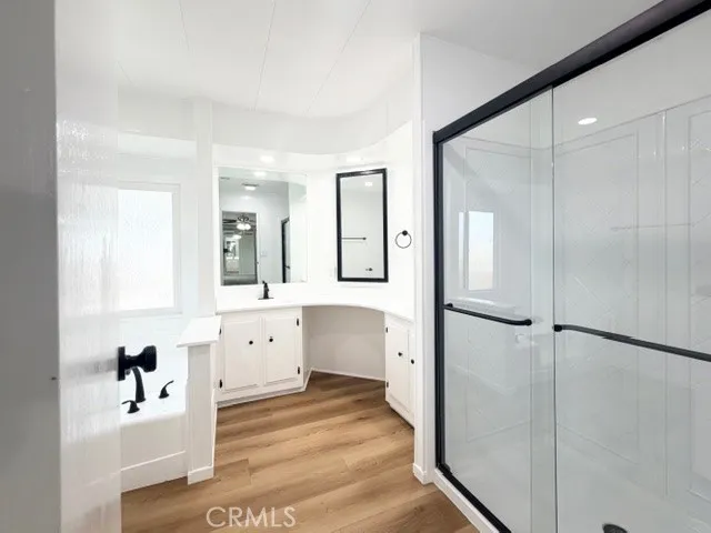 Spacious and like new!!! Welcome to Valencia Lea, Highland’s premier +55 community! This 2 bed 2 bath 1977 Goldenwest 1440sqft, plus bump-outs, home has great curb appeal, located on quite street with mature landscaping, featuring new paint, new dual pane windows and a large porch! This home features new interior paint, new lighting, ceiling fans, and new durable luxury vinyl plank flooring with carpeted bedrooms. The large beam-vaulted living and dining areas have plenty of windows, with new window coverings, letting in tons of natural light, and built-in dining room cabinets. The upgraded kitchen features updated counter tops, deep farm sink and new appliances! The kitchen is open to the family room with a huge bar peninsula, perfect for informal living. The guest bedroom has a large mirrored closet and nearby guest bathroom features tub shower combo. The large primary bedroom features a huge triple mirrored closet and attached spacious bathroom with glass enclosed low-threshold shower, double vanity, linen storage, garden tub and plenty of light! The full-length carport includes storage sheds. Don’t delay in taking a tour!