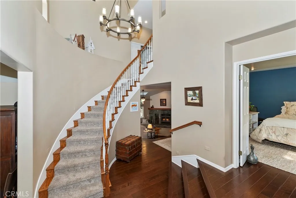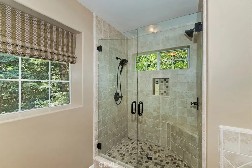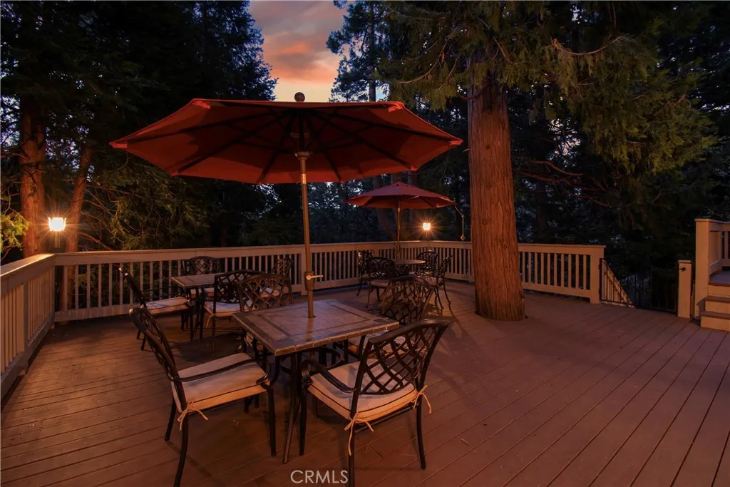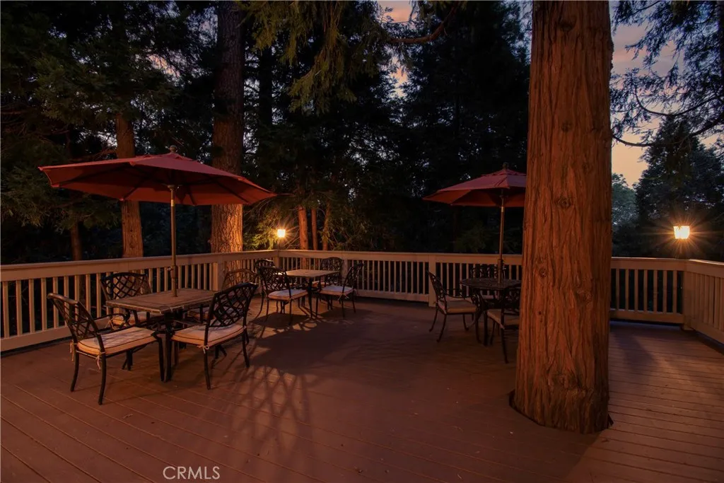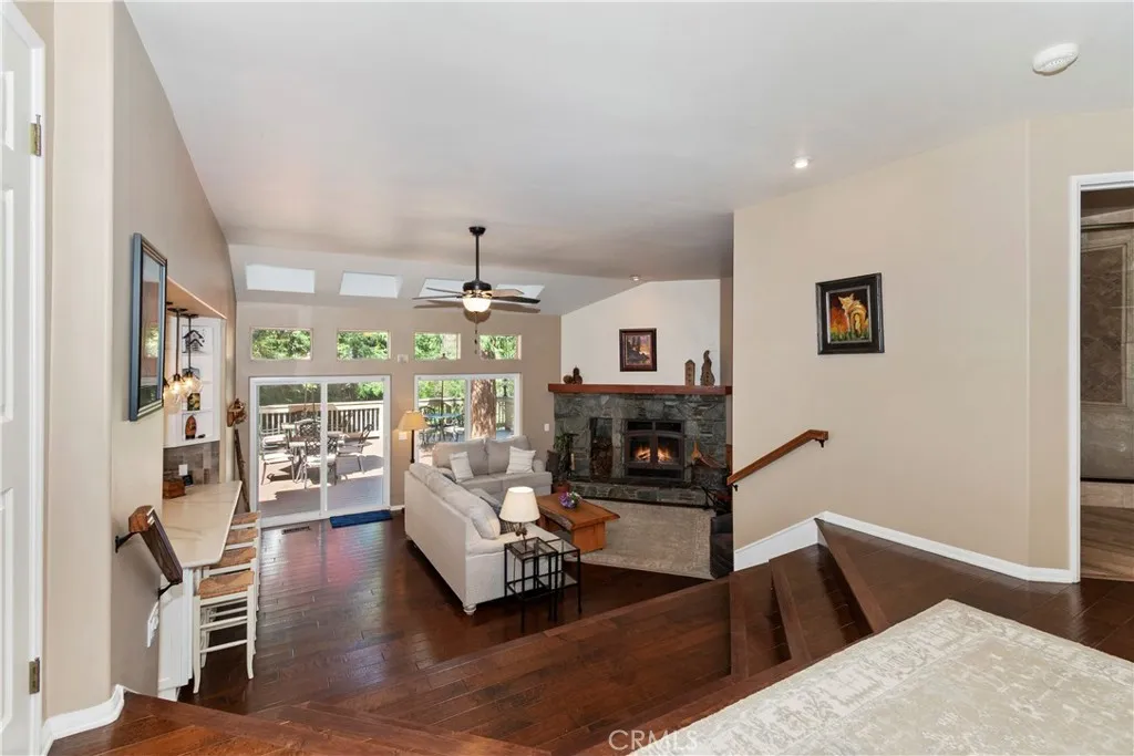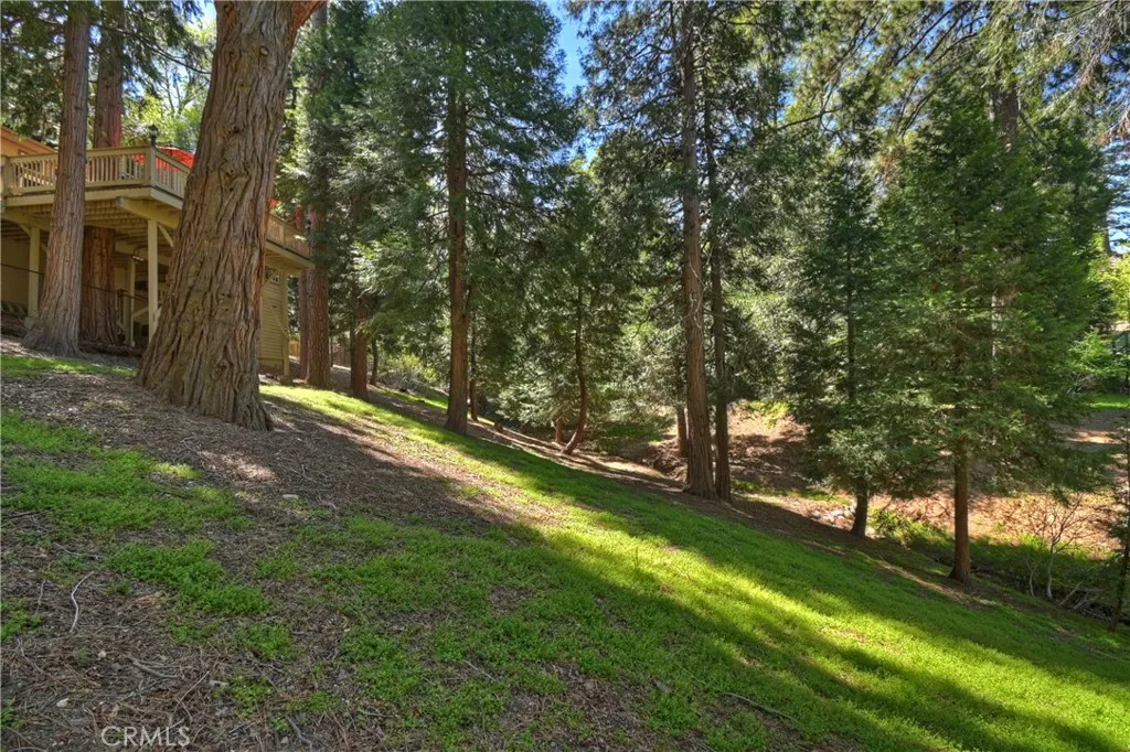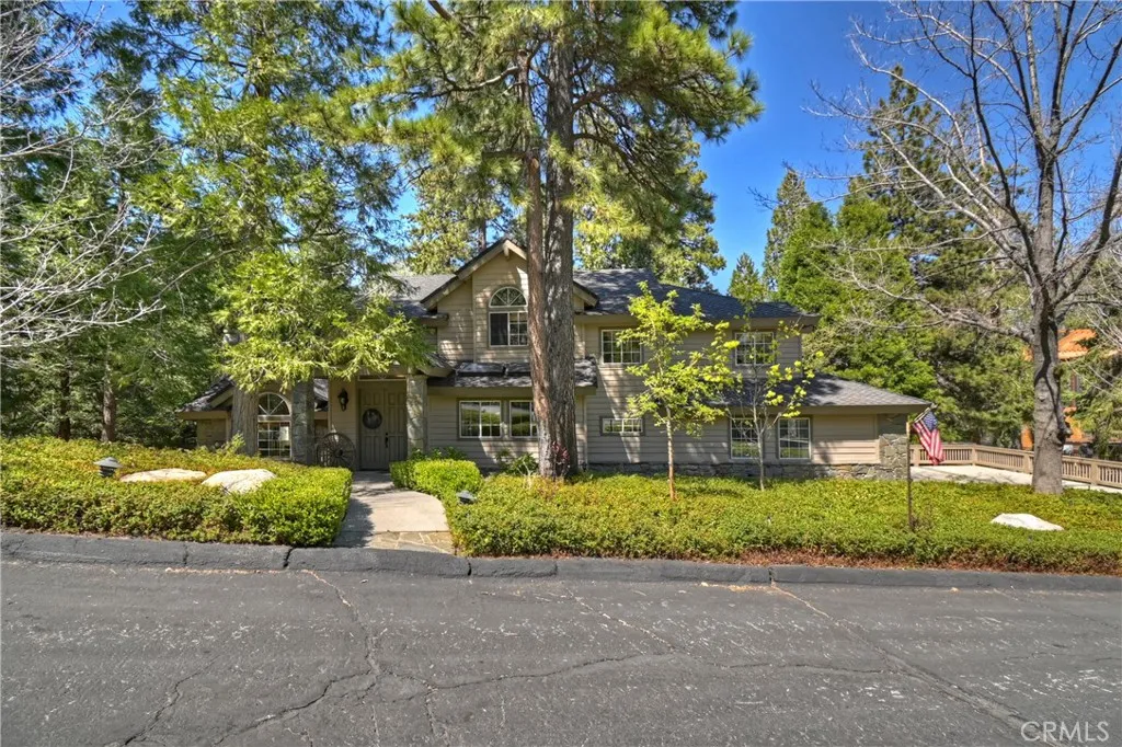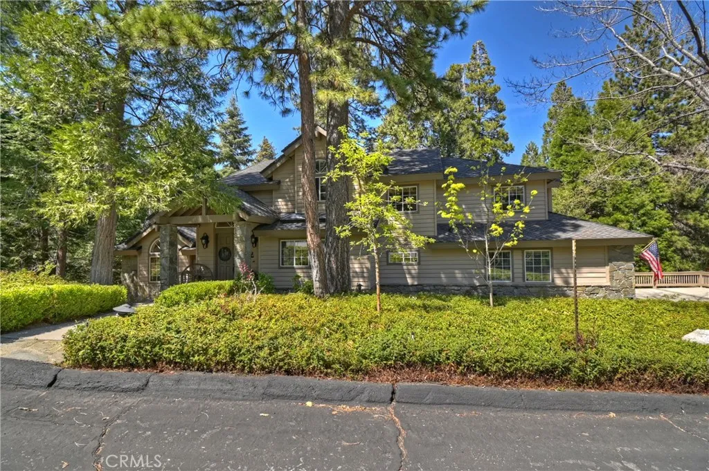 Lovely home in the gated community of Cedar Ridge Estates on nearly an acre of land!!! Spacious home with 3699 sq. ft. featuring 4 bedrooms and 3 baths with a flexible layout. The property is nicely landscaped and fully fenced, with a level driveway providing easy access from the street to the 3-car garage. Did we mention the ample off-street parking! Stone accents showcase the pillars and walkways taking you to the covered front porch. Big and open from the moment you step inside. The main level includes a formal living room with gas fireplace along with a bedroom that works well as a guest room or private office. The upgraded kitchen is designed for both everyday use and entertaining. Features include quartz countertops, a large island with secondary sink, walk-in pantry, custom soft-close cabinetry, two ovens and a 5-burner gas range. Large, sunny window over the sink. A long breakfast bar connects the kitchen and family room featuring a wood-burning fireplace with direct access to rear deck. A formal dining room sits just off the kitchen and also opens to the deck. An open, light-filled staircase leads to the upper level with two guest bedrooms, a full bath, and the spacious primary suite. The large guest room has a built-in desk w/bookcases; the closet is currently set up as an art studio, offering great light and shelving to conveniently store your supplies. The primary bedroom includes a large walk-in closet and the dual-sided gas fireplace is shared with the bathroom. Luxury bath features a jetted soaking tub, walk-in shower, double sinks and lighted vanity mirrors!! It’s a place of comfort for sure. Outdoor spaces are a highlight with the large deck overlooking a natural forest and seasonal stream…… complete with accent lighting for evening use. Easy to gather without feeling crowded. If natural light is important, this home has multiple skylights. Additional enhancements include 2 A/C’s, 2 FAU’s, whole house self-activated gas generator, central vacuum system… yes it works….. small fenced dog run. Built-ins and cabinets in garage. Well maintained showing pride of ownership. This area is truly a step outside the norm. A gated community with large stately homes on private lots with lush green landscaping along with a mature mountain forest ~ close to the lake and minutes to historic Lake Arrowhead Village, yet a sense of privacy and serenity exists here. Boat slip in MBM #4 Slip 7 and boat available for additional costs.