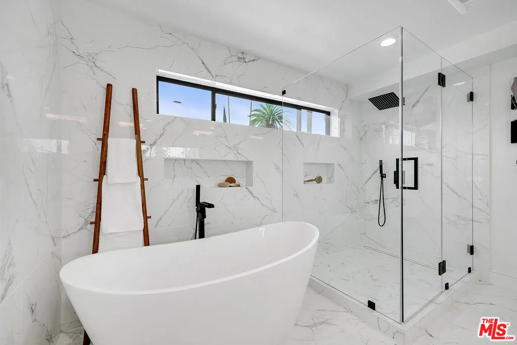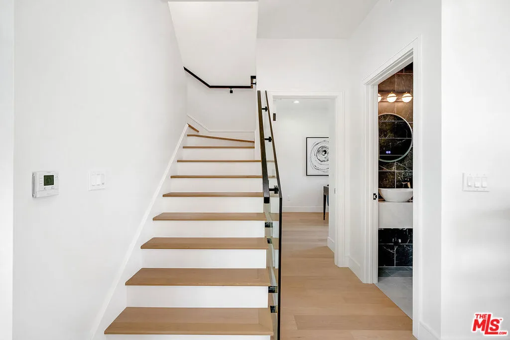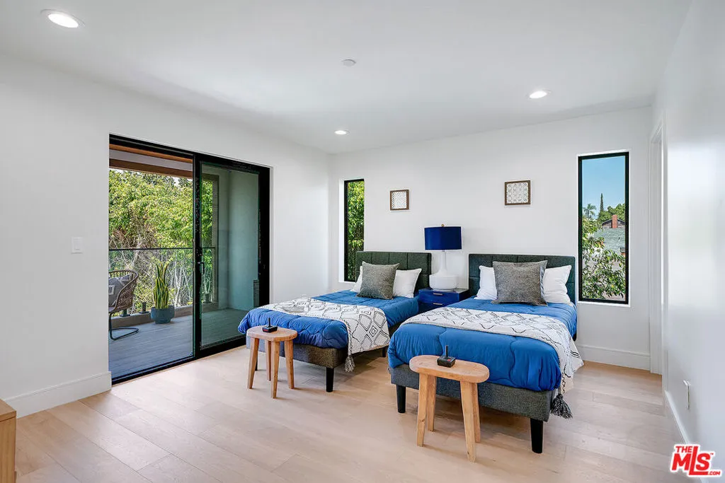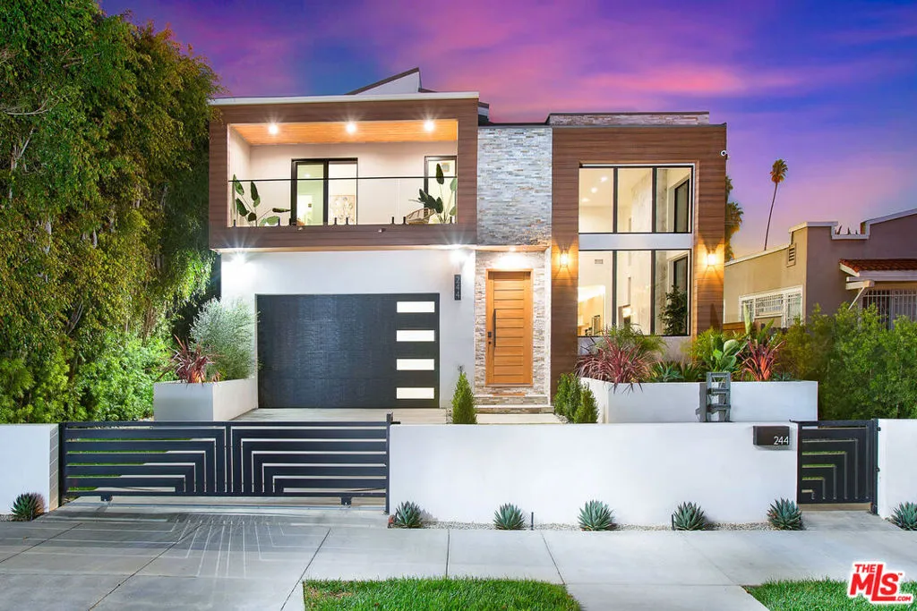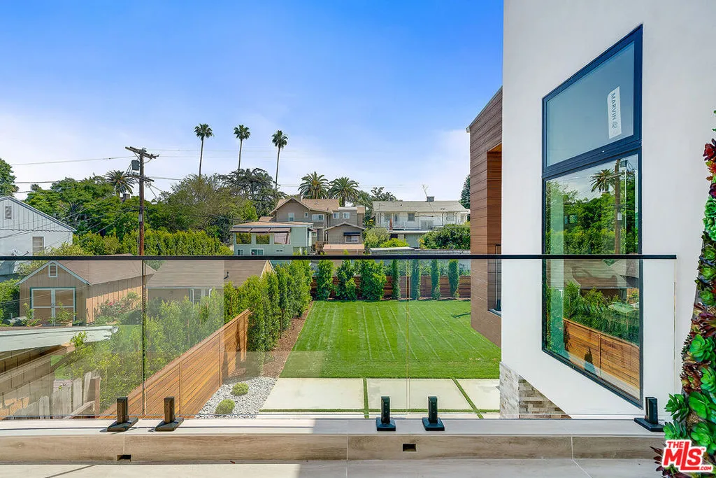 Stunning 2021-built modern residence offering 4 bedrooms and 4.5 baths in a highly desirable Hancock Park adjacent location. Thoughtfully designed with an open floor plan, this home features soaring 16-foot ceilings in the living room, a sleek fireplace, and expansive windows that flood the space with natural light. Seamless indoor-outdoor California living is showcased with a covered deck leading to a private, spacious backyard lined with mature ficus trees. The chef's kitchen is equipped with a striking waterfall island, walk-in pantry, and ample cabinetry, perfect for both everyday living and entertaining. All bedrooms are En-suite, including a convenient downstairs suite ideal for guests or a home office. Upstairs, each bedroom enjoys its own balcony, while the luxurious primary suite features dual walk-in closets, a spa-inspired Jack-and-Jill bathroom, and a standalone soaking tub, plus a private balcony overlooking the backyard. Additional highlights include an upstairs laundry room, separate powder room, and a full security camera system. A rare opportunity to own a newer construction home that perfectly blends modern design, functionality, and prime location