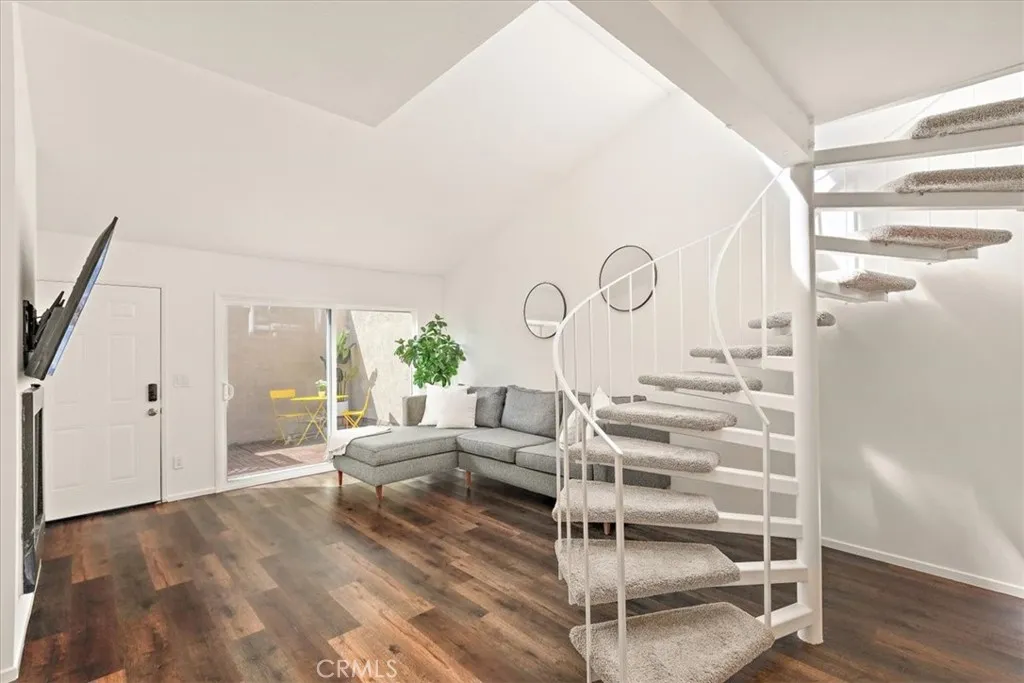 Tucked inside Fullerton’s Arbor community, 2900 Madison Ave offers a bright, loft-style layout with a sense of volume that makes its 756 square feet live larger than expected. Before you even step inside, the home is introduced by a private front patio entry that creates a charming sense of arrival, with the community fountain just outside the unit adding a peaceful, tucked-away feel. Inside, the main living area feels open and airy, anchored by dramatic ceiling height, warm wood-look flooring, and a sculptural staircase that gives the home real character. The kitchen and dining area flow easily from the living space, while the upstairs bedroom retreat adds separation and privacy from the main level. An inside laundry room adds everyday convenience, and the overall layout feels both functional and visually distinctive. Set within the gated Arbor community in a location convenient to Cal State Fullerton, shopping, dining, and freeway access, this home offers a low-maintenance lifestyle with style, comfort, and a unique sense of space.