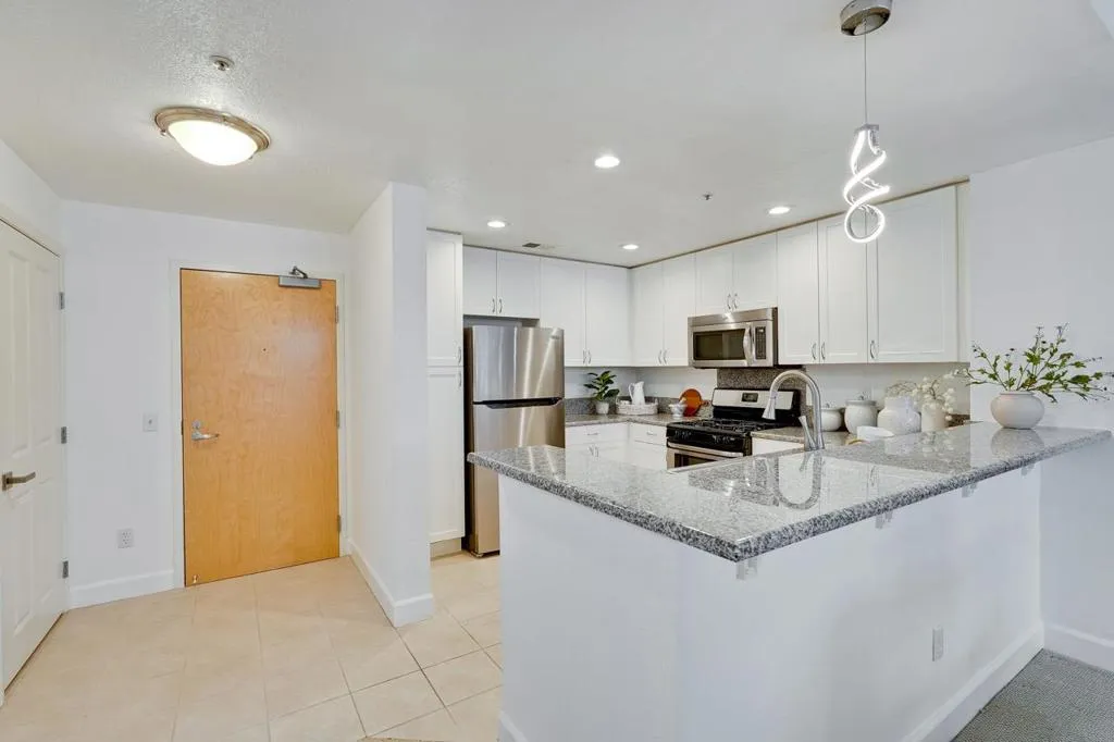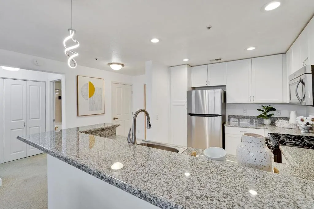 Stunning luxury Montebello high-rise condo in prime Cupertino City Center with top-rated schools: Cupertino High, Lawson Middle and Eaton Elementary. Move-in ready, this well-appointed home offers tall ceilings, oversized windows, central heating & AC, and fresh paint, all in a quiet non-wood-frame building. Open floor plan features a gourmet kitchen with brand-new refrigerator, granite countertops/breakfast bar, ample cabinetry, and recessed lighting. The dining area flows into a spacious, light-filled living room with access to a private balcony. Serene bedroom includes a walk-in closet, while the updated bathroom offers modern vanity lighting, new fixtures, and a shower over tub. Also featured is in-unit laundry and a premier parking space located steps from the elevator. Enjoy peace of mind and a low-maintenance lifestyle in a fob-secured building with gated parking and elevator access. HOA includes water and garbage, along with resort-style amenities including fitness center/gym, gated pool, hot tub, and clubhouse with kitchen. Ideally located near Apple Park, major tech campuses, Cupertino Main Street, library, civic center, restaurants, shopping, groceries, and parks. Rare opportunity to enjoy modern elegance, comfort, and convenience in a premier location!