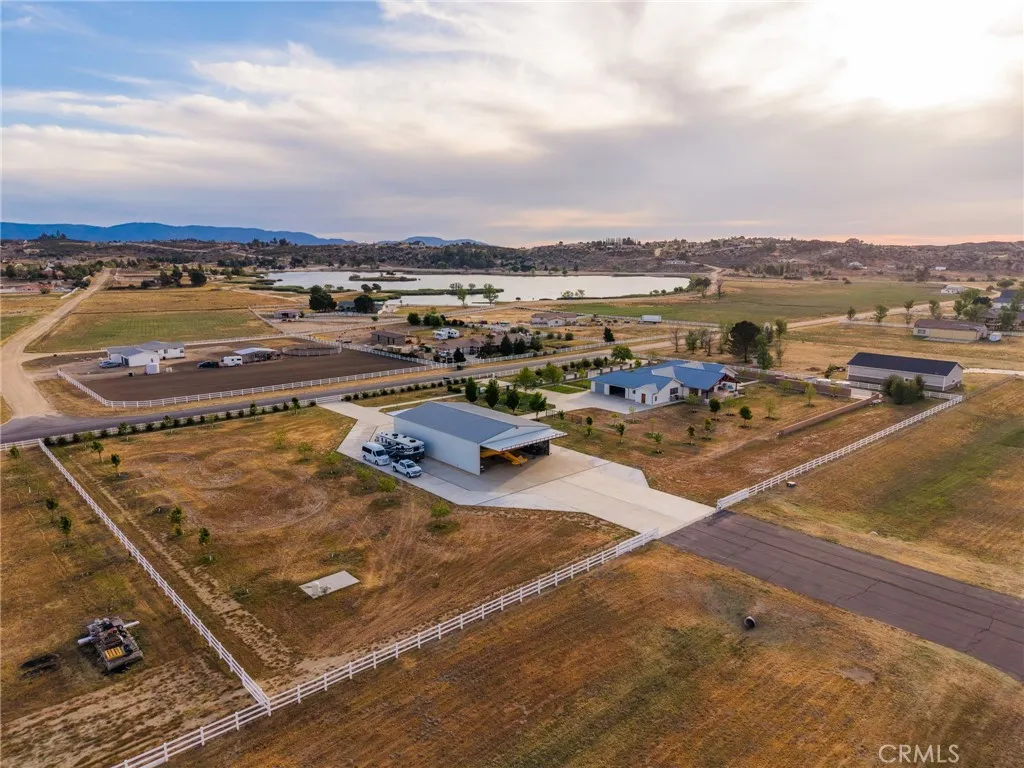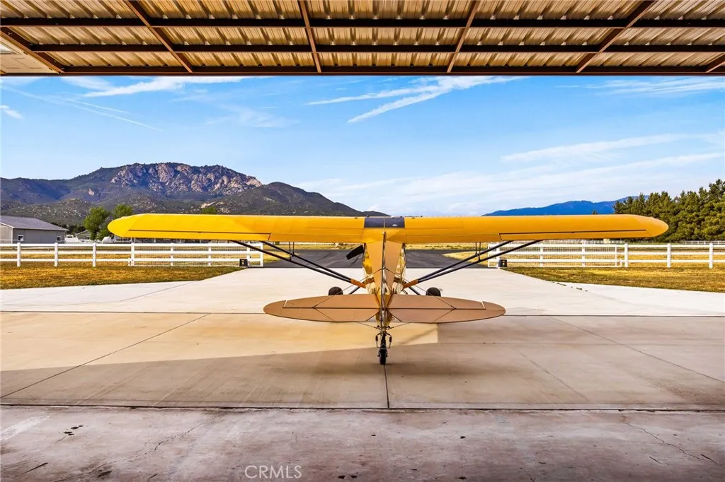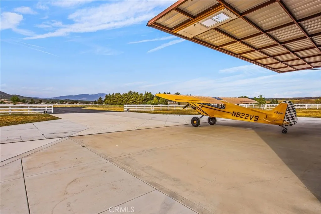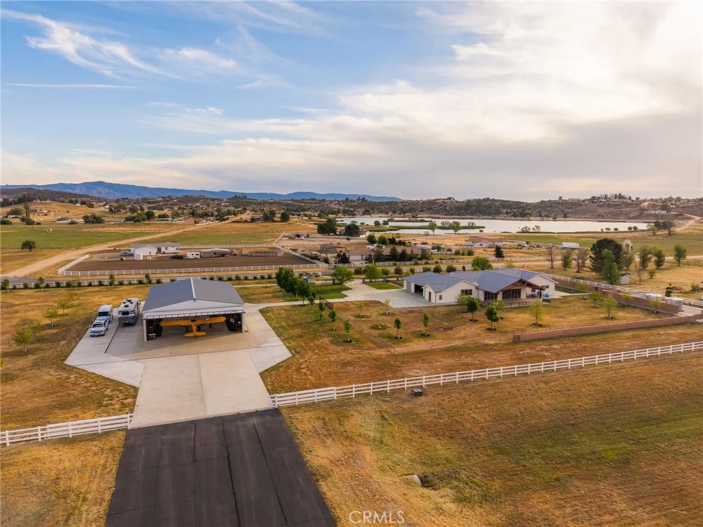 Elevate your lifestyle with this aviation home and hangar on 5.38 acres in Lake Riverside Estates, a historic equestrian and aviation community. Nestled between the Mountains and a Private Lake, find paradise. This turnkey property includes a 3,750 sq ft steel hangar with motorized 47' and 45' hydraulic doors, direct concrete taxiway access to a 3,600' lighted, paved airstrip with VASI and helipad, and a newer, high-quality 4-bedroom, 3-bathroom residence built in 2022. The grounds feature manicured lawns, trees, expansive parking, concrete pathways, vinyl fencing, motorized gates, and decorative wrought iron with stacked stone cross fencing. The home showcases smooth stucco, steel-insulated roof, solid mahogany doors, a grand entry, and expansive indoor–outdoor living spaces with 12' and 8' trackless doors to a large, covered patio. No expense was spared on design, construction and materials. The chef’s kitchen offers a quartzite waterfall island, floor-to-ceiling cabinetry, double Sub-Zero refrigerators, a 6' Wolf range with BBQ, a walk-in pantry with a deep freeze, and a wine fridge. Five-and-a-half-foot hallways lead to four bedrooms, a dedicated laundry/storage room, and a primary suite with a walk-in closet and retreat-style bath featuring a 16'×8' tiled shower and claw-foot tub. Additional features include two 5-ton heat pumps, solid brass hardware, plantation shutters, auto-raising shades, custom closet systems in all bedrooms, a 1,140 sq ft finished garage with built-in cabinetry, epoxy flooring and ensuite bathroom, a security system with server, owned solar panels with backup power, and a private office. Lake Riverside Estates offers miles of riding trails, a community arena, a 55-acre lake with trails, a lakeside tot lot, sports courts, a community pool, and HOA-maintained roads; this property sits on paved roads with expansive mountain views and open space, just 25 minutes from Temecula and convenient to Idyllwild, Palm Desert, and Julian. This is a rare California opportunity to own a premier airpark and equestrian lifestyle within a single, cohesive compound.