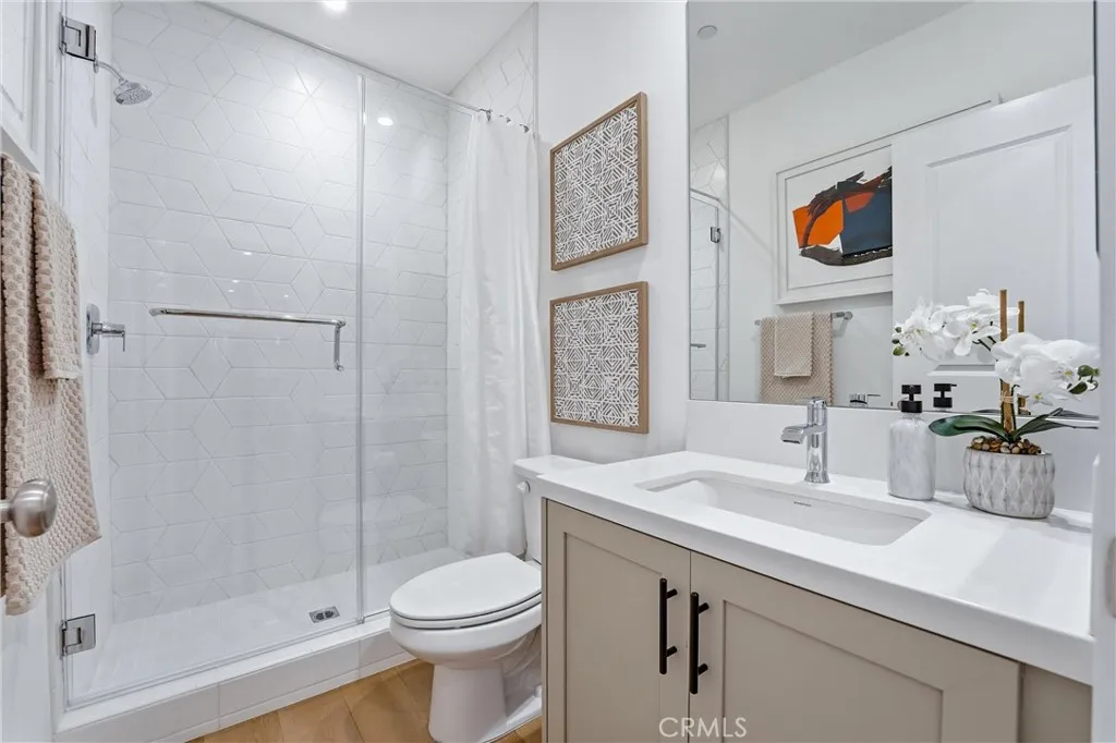 Builders home model facing the greenbelt. 3 Bedroom with 1 bedroom on main living floor (level 2). Highly upgraded throughout, modern lighting fixtures, open kitchen with spacious island with sink and breakfast bar, nice patio balcony. Large En-suite (hosts personal bath) and Primary Suite with large walk in shower, dual sinks and plenty of cabinetry. Energy-conscious including solar, heat pump heating and cooling system, tankless water heater and smart controls. Enjoy Cypress Village amenties and the location within the Great Park area, close to the sport courts, hangar and balloon.