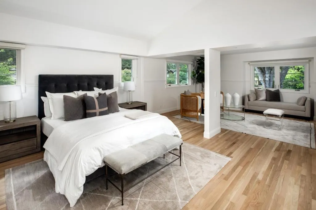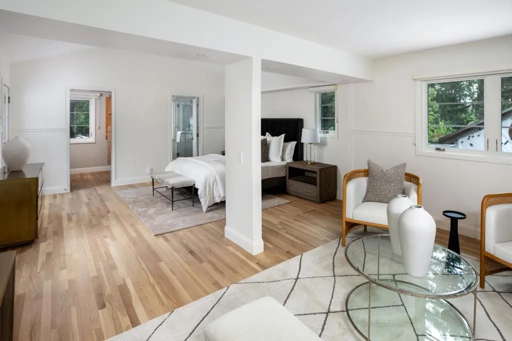 This thoughtfully remodeled Woodland Acres home offers a spacious two-story floor plan on approximately one-third acre. There are 4 bedrooms and 3 baths, including a privately located main-level bedroom with built-in Murphy bed that is ideal for guests or office use, plus an upstairs primary suite with its own sitting or office area, balcony overlooking the rear grounds, and remodeled bath. Two additional main-level bedrooms have direct access to an all-new bath. Fresh updates throughout include refinished hardwood floors, newly painted interiors, and updated landscaping, including a newly planted front lawn beneath a heritage Valley Oak. A formal living room with fireplace and deck access is complemented by the great room with dining area, remodeled kitchen, and spacious family room opening to the rear yard with a second large deck and patio. Completing the home is an attached 2-car garage with EV charging outlet. All of this in the sought-after Woodland Acres neighborhood with convenient access to shops, restaurants, and major commute routes, plus excellent Cupertino schools.