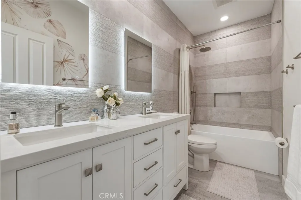 Location, Location! Quail Hill, just a one-minute walk to award-winning Alderwood Elementary and located within the renowned University High School district. Spanning approximately 1954square feet, this 3-bedroom residence has been thoughtfully upgraded with over $250,000 in recent improvements, offering the perfect blend of style, comfort, and functionality. From the moment you enter, you’ll notice the model-like quality, with hardwood flooring downstairs, custom window treatments, and abundant natural light throughout. The fully remodeled kitchen serves as the centerpiece of the home, featuring elegant marble countertops, a spacious island with seating for six, white cabinetry with pull-out drawers, a wine fridge, designer lighting, and high-end appliances. The kitchen flows effortlessly into the inviting family room, complete with a custom built-in, surround sound, recessed lighting, and soaring ceilings—ideal for both everyday living and entertaining. Step outside to your private, custom-designed backyard retreat, beautifully landscaped with upgraded Spanish tile flooring, built-in planters, and a gas firepit. Mature landscaping provides exceptional privacy, creating a true outdoor sanctuary. Upstairs, the expansive primary suite offers a luxurious escape with a spa-inspired bathroom featuring an oversized rain shower, a freestanding oversized Krion solid surface tub, designer tile, Restoration Hardware vanities and a towel warmer. A custom walk-in closet with modular elfa shelving system completes the space. Two additional bedrooms include custom modular elfa closets, and share a fully upgraded bathroom with stylish finishes. A versatile loft at the end of the hallway provides the perfect setup for a dual home office, while a separate laundry room adds convenience. Additional features include a spacious downstairs powder room with potential for full bath conversion, a formal dining room with custom barn doors that can be converted into a main-level bedroom, ample under-stair storage, and a tankless water heater in the attached two-car garage. Residents of Quail Hill enjoy resort-style amenities, including multiple pools, parks, fitness centers, tennis and basketball courts, and miles of scenic hiking trails. Ideally located just minutes from Irvine Spectrum and the beaches of Laguna, this home offers the best of Southern California living.