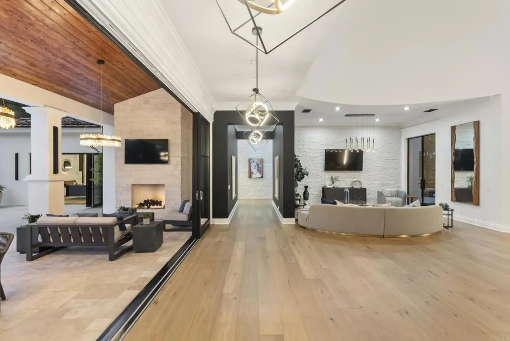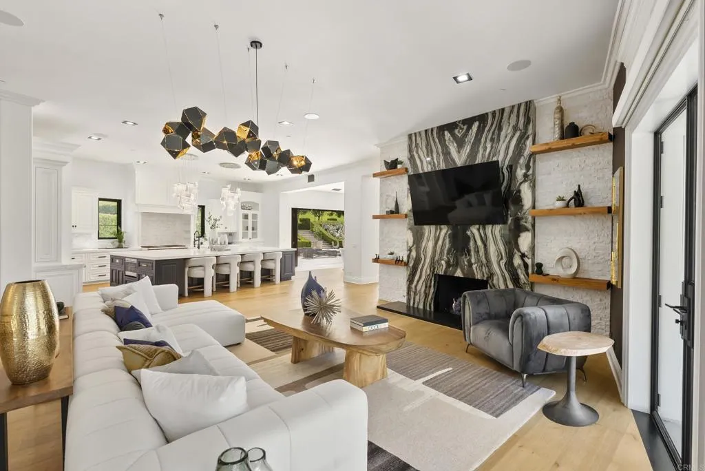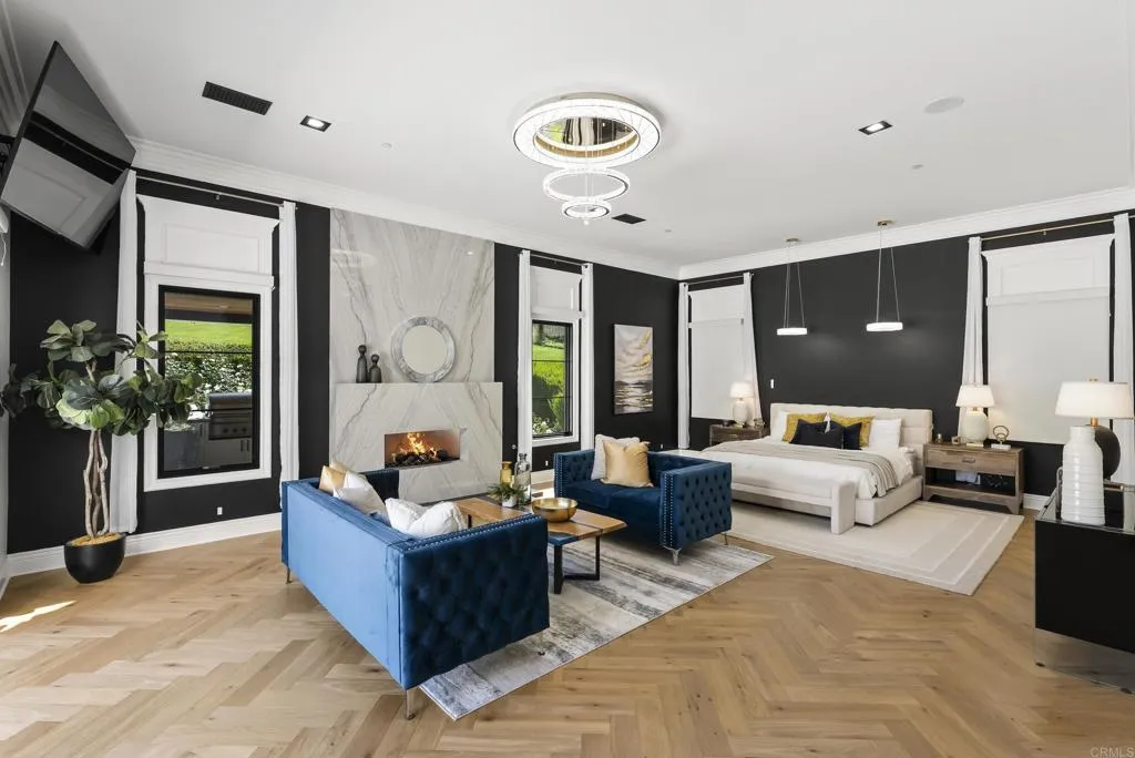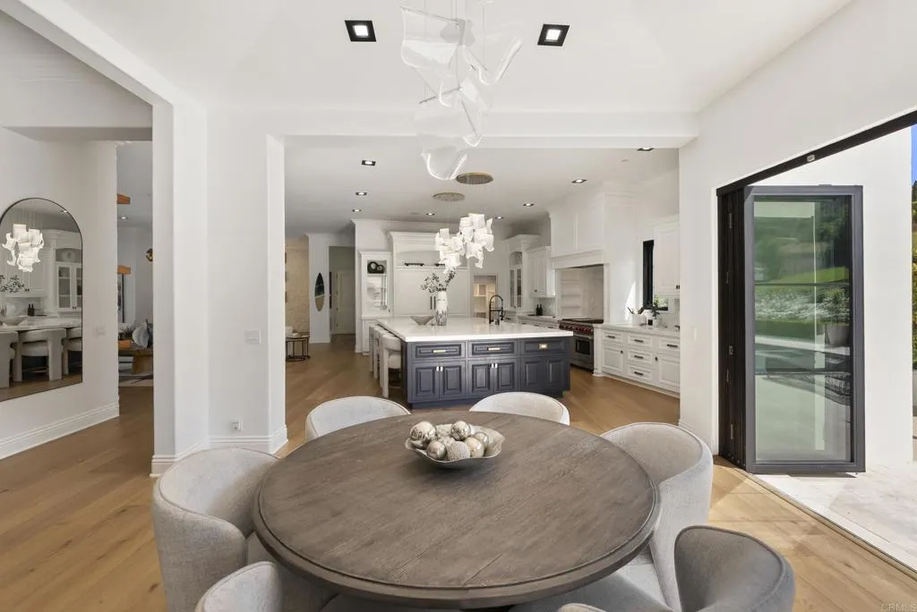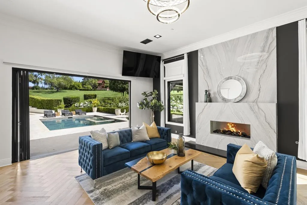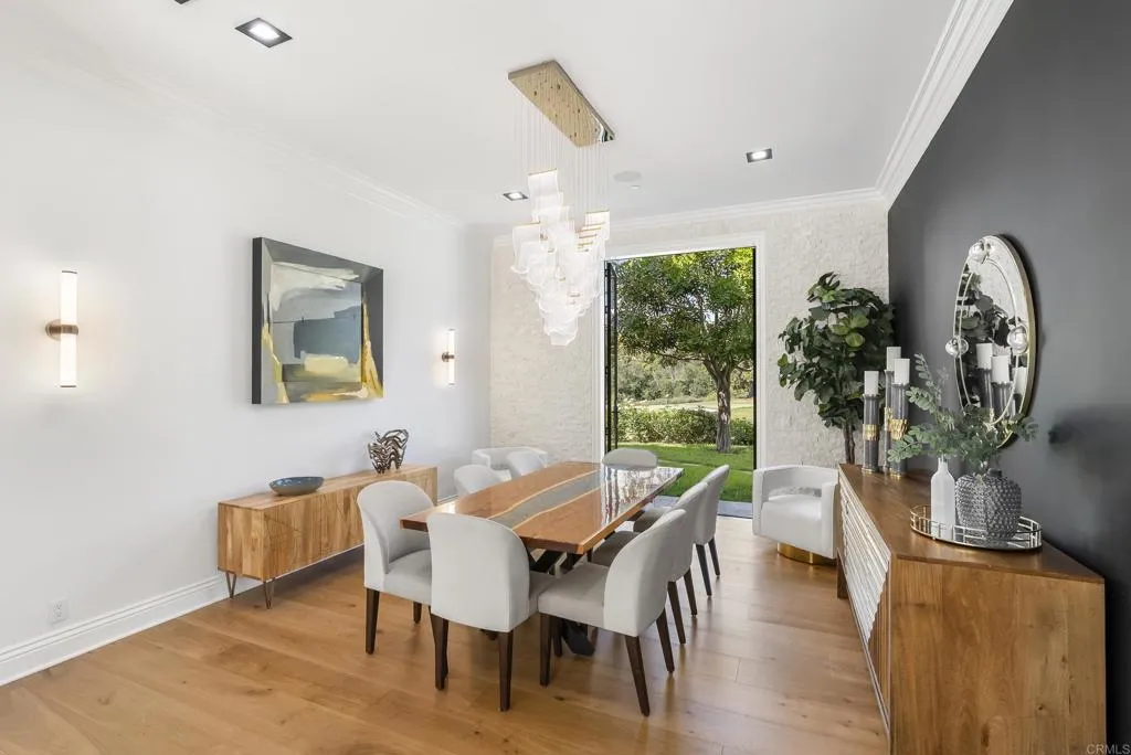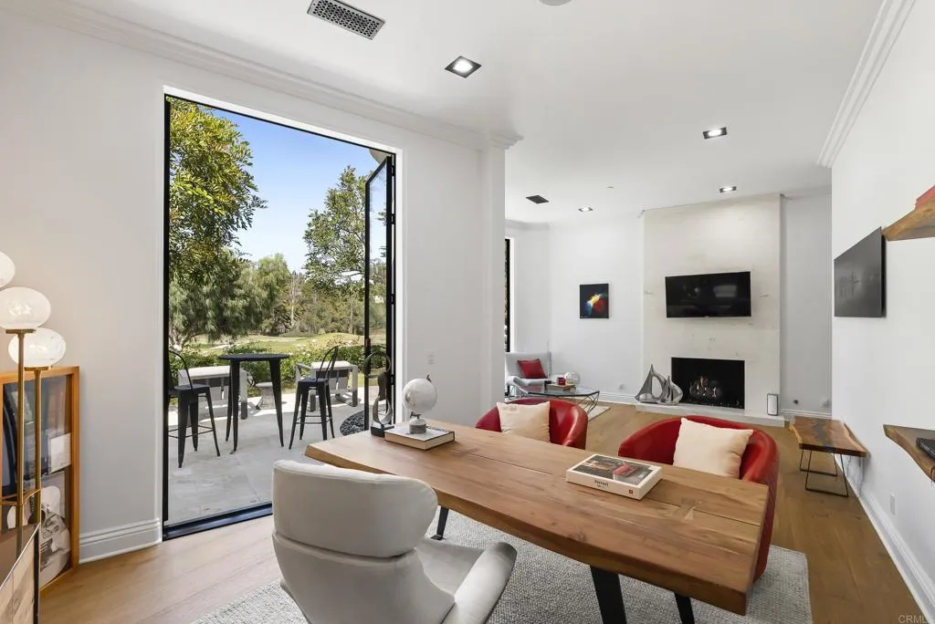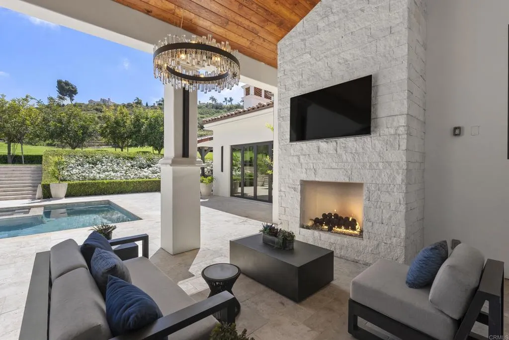 Set within the prestigious guard-gated Del Mar Country Club, this estate is defined by scale, natural light, and a design that reveals itself from the moment you enter. A dramatic two-story entry and sweeping staircase draw you in, crowned by a cascading glass globe chandelier and framed by a wall of glass opening to the pool and private grounds. A curated palette carries throughout with DuChateau Savanna wide-plank European white oak flooring, striking feature walls, and sculptural lighting. New Pella Impervia windows and Black Diamond steel doors featured throughout. The kitchen is anchored by a large island with Wolf and Sub-Zero appliances, flowing to the daily dining area, where glass doors open to the California room. The formal dining room offers its own patio with fairway views. The family room is defined by a full quartzite slab fireplace, a statement wine display wall, and French doors opening to the patio. The main-level primary suite features a floor-to-ceiling stone fireplace, two custom walk-in closets, and a full wall of glass opening to the outdoors. The spa bath is exceptional, with a soaking tub, walk-in shower, and dual vanities set against a dramatic full quartzite slab wall. An office with its own fireplace opens to a private patio. The powder room earns its own moment with a fluted Calacatta marble floating vanity, a diamond mosaic marble tile wall, and brushed brass fixtures. Upstairs: a theater room, two en-suite bedrooms with private balconies, and two additional rooms joined by a Jack-and-Jill bath, one appointed as a gym with an infrared sauna. A detached casita offers private guest accommodation with its own entrance and garage. Outdoors, a California room with a fireplace, pool, spa, and outdoor kitchen opening to an expansive yard and fruit trees. This property includes exclusive use of an additional 0.59 acres of Lot 7. Ultimately a home that reveals itself gradually and stays with you long after you leave.