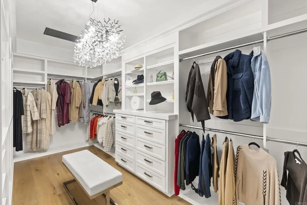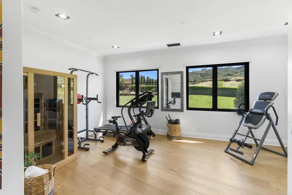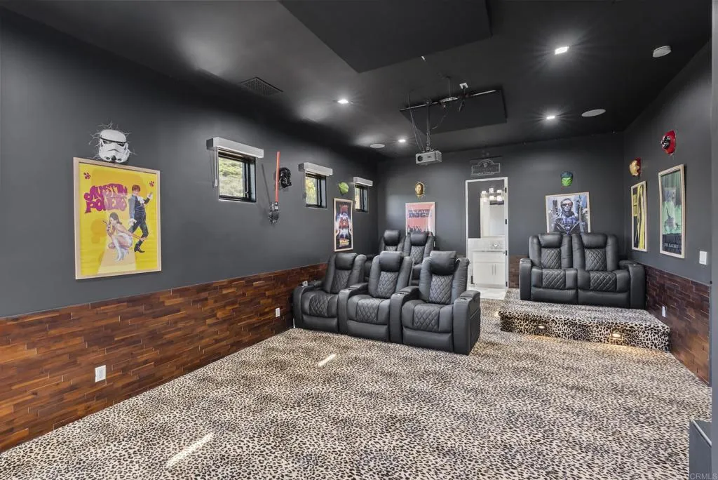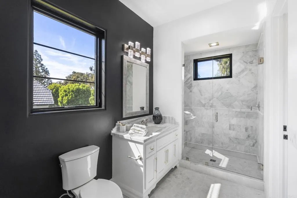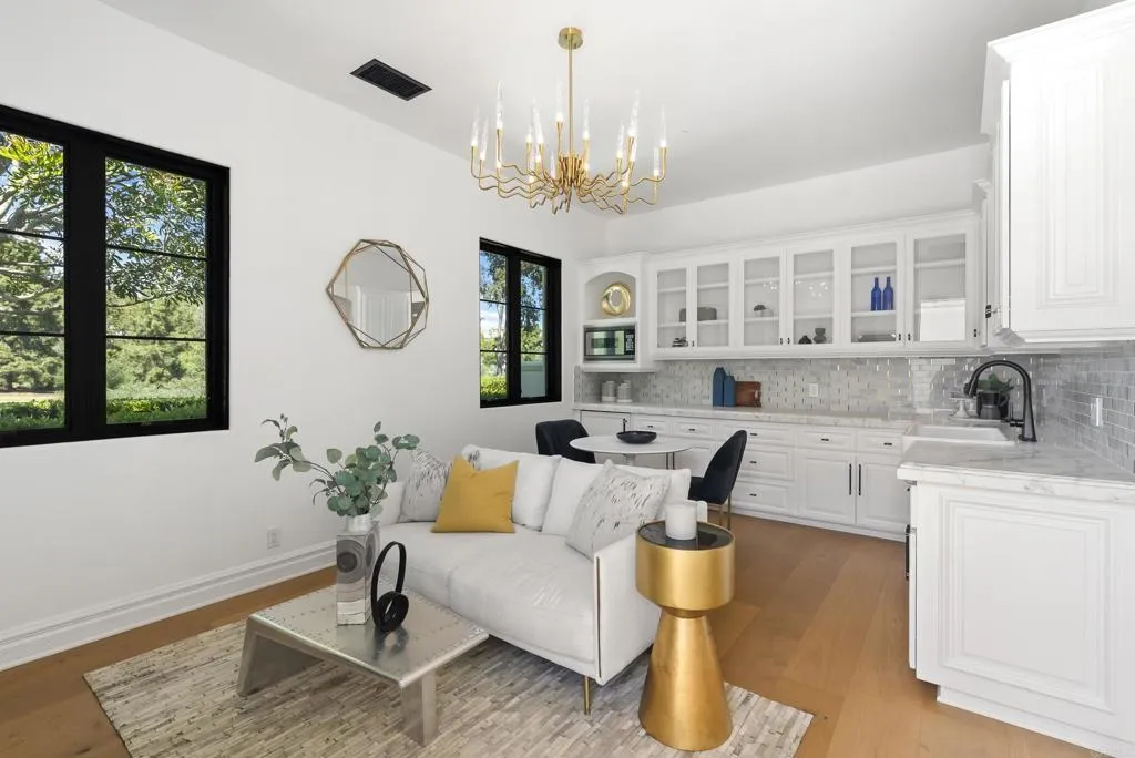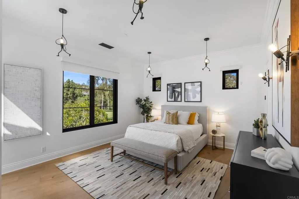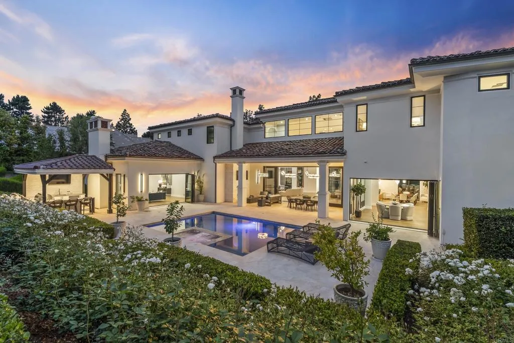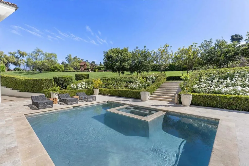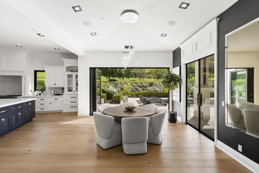 Set within the prestigious guard-gated Del Mar Country Club, this estate is defined by scale, natural light, and a design that reveals itself from the moment you enter. A dramatic two-story entry and sweeping staircase draw you in, crowned by a cascading glass globe chandelier and framed by a wall of glass opening to the pool and private grounds. A curated palette carries throughout with DuChateau Savanna wide-plank European white oak flooring, striking feature walls, and sculptural lighting. New Pella Impervia windows and Black Diamond steel doors featured throughout. The kitchen is anchored by a large island with Wolf and Sub-Zero appliances, flowing to the daily dining area, where glass doors open to the California room. The formal dining room offers its own patio with fairway views. The family room is defined by a full quartzite slab fireplace, a statement wine display wall, and French doors opening to the patio. The main-level primary suite features a floor-to-ceiling stone fireplace, two custom walk-in closets, and a full wall of glass opening to the outdoors. The spa bath is exceptional, with a soaking tub, walk-in shower, and dual vanities set against a dramatic full quartzite slab wall. An office with its own fireplace opens to a private patio. The powder room earns its own moment with a fluted Calacatta marble floating vanity, a diamond mosaic marble tile wall, and brushed brass fixtures. Upstairs: a theater room, two en-suite bedrooms with private balconies, and two additional rooms joined by a Jack-and-Jill bath, one appointed as a gym with an infrared sauna. A detached casita offers private guest accommodation with its own entrance and garage. Outdoors, a California room with a fireplace, pool, spa, and outdoor kitchen opening to an expansive yard and fruit trees. This property includes exclusive use of an additional 0.59 acres of Lot 7. Ultimately a home that reveals itself gradually and stays with you long after you leave.