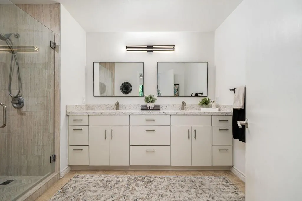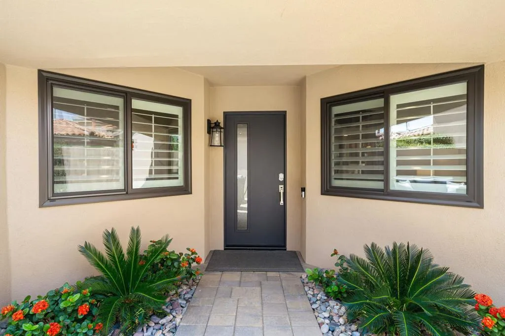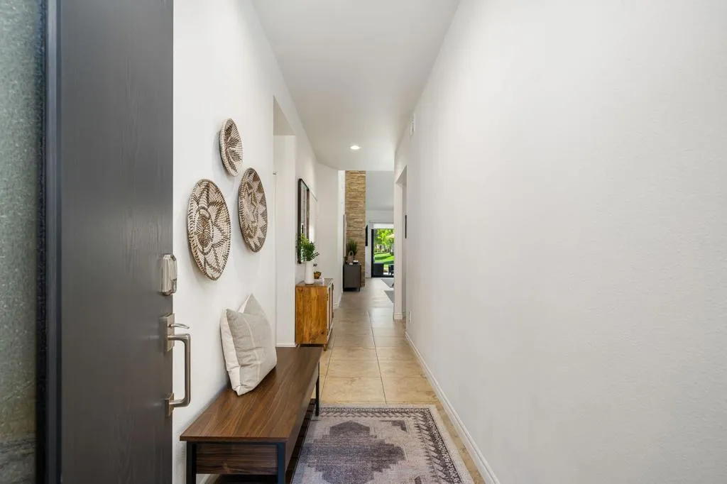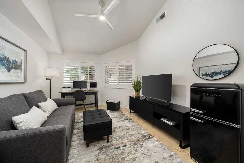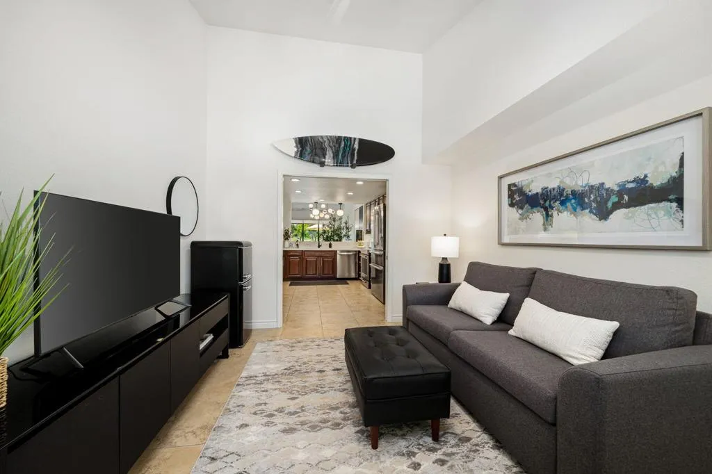 Stunning Furnished Golf Course Condo in Palm Valley Country Club! Beautifully updated and move-in ready furnished home located on the #12 Challenge Course in highly desirable Palm Desert. This sought-after Palm Plan offers 2 bedrooms, 2 ensuite baths, and a flexible den/office, with ideal separation for privacy. Enjoy west-facing golf course and mountain views from the expanded and tiled patio - perfect for relaxing days and sunset entertaining. The gated courtyard entry features upgraded pavers, a new front door, and new windows, while fresh interior paint throughout the home and garage creates a bright, modern feel. Inside, this renovated golf course home includes tile throughout, newer A/C and heat pump, water heater, and new sliding doors that open seamlessly to outdoor living. The redesigned kitchen showcases quartz countertops, updated backsplash, new sink, faucet, disposal, and newer appliances, complemented by modern lighting. The open-concept living and dining areas feature high ceilings, motorized window shades, updated lighting, a stacked stone fireplace, custom built-ins, and a wet bar. Additional upgrades include custom closet systems, renovated bathrooms with updated showers and fixtures, new toilets, ceiling fans, lighting throughout, and a laundry room with newer LG washer/dryer. The garage features epoxy flooring for a clean, finished look. Located in one of the desert's premier communities, Palm Valley Country Club offers two Ted Robinson-designed golf courses, fitness center & spa, tennis, pickleball, and 46 pools & spas. HOA includes social membership, guard-gated security, cable/internet, exterior maintenance, roof, landscaping, and trash. Short-term rentals allowed (28 days or less) with City of Palm Desert permit, making this an excellent investment property, seasonal rental, or full-time residence.