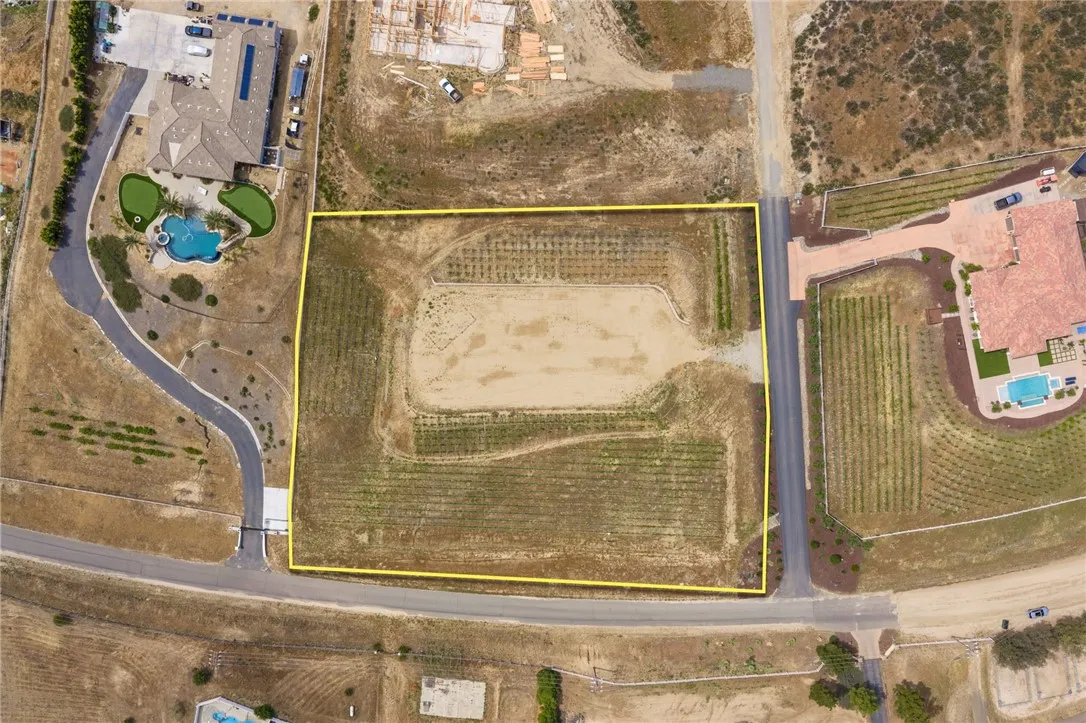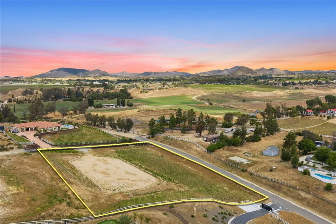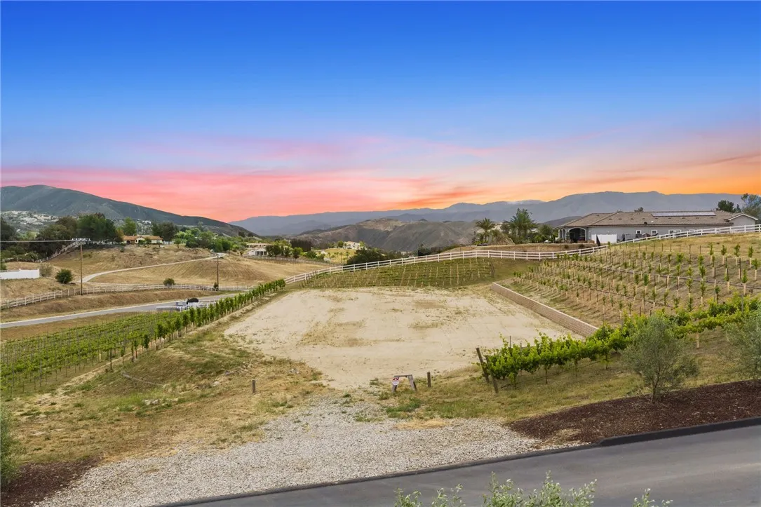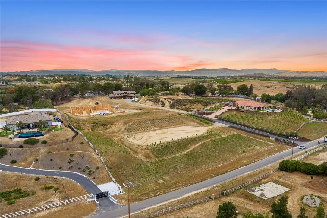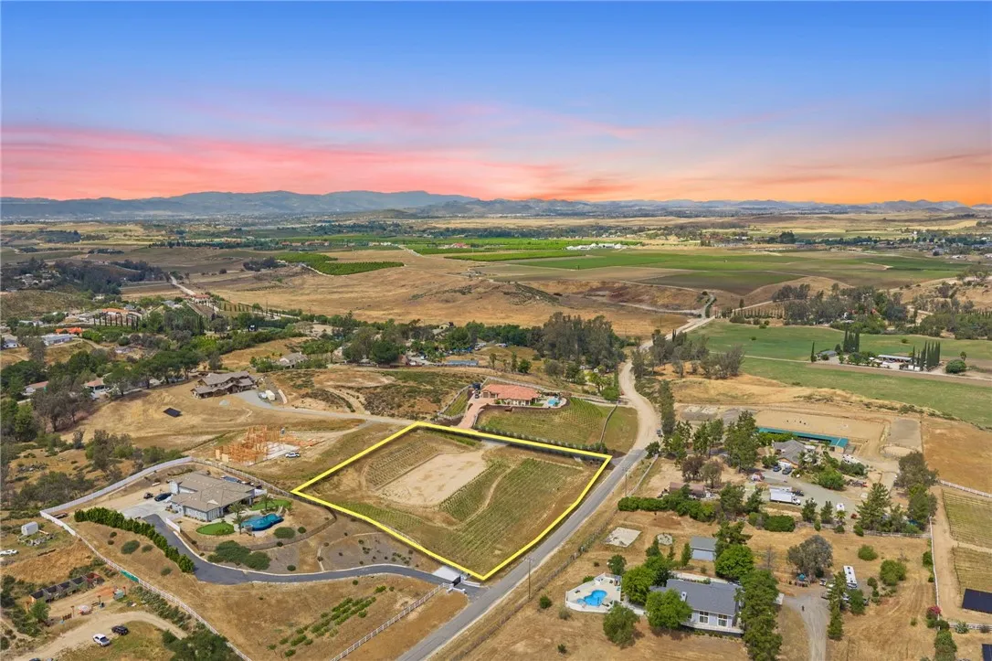 Welcome to an exceptional opportunity in the heart of Temecula’s renowned Wine Country. Situated on a private cul de sac between the De Portola and Rancho California wine trails, this prime 2 acre parcel offers the perfect blend of privacy, convenience, and long term potential. This property is truly build ready, featuring an expansive ~20,000 sq. ft. graded building pad, installed water meter with backflow, and a 1” water main with Rancho Water District fees already paid. The previous grading permit has expired but is expected to be easily renewable, with erosion control measures already in place and previously approved. An established vineyard adds immediate character and value, with approximately 1,400 Petite Sirah vines (certified P1103 rootstock) supported by both trellis and head trained systems. The vineyard is fully equipped with a complete irrigation system, including automated timers, filtration, drip emitters, and fertilizer injectors, ideal for those looking to step into a functioning agricultural setup or expand further. The property has been thoughtfully improved with a finished road leading to the top of the parcel, landscaped frontage featuring mature olive trees, and a block retaining wall that can be modified or reused to suit your vision. A fire hydrant is conveniently located at the front of the property, adding an extra layer of practicality for future development. Zoned RA2.5, the property allows for a custom single family residence along with an ADU and junior ADU, as well as light agricultural uses and equestrian opportunities. With no HOA restrictions, you have the flexibility to design and build a true estate tailored to your lifestyle. Despite its peaceful, rural setting, the property is just minutes from Temecula’s most popular wineries, dining, and everyday conveniences, offering the best of Wine Country living without sacrificing accessibility. Whether you envision a luxury vineyard estate, private retreat, or investment opportunity, this property provides a rare foundation to bring your vision to life.