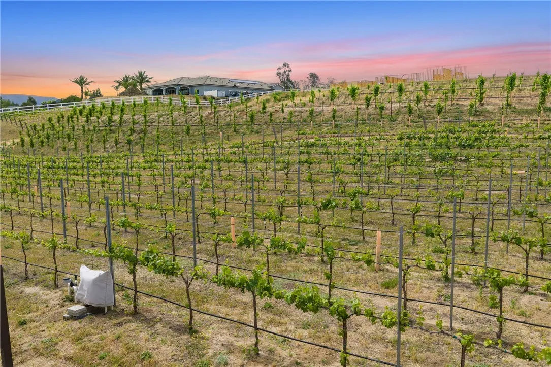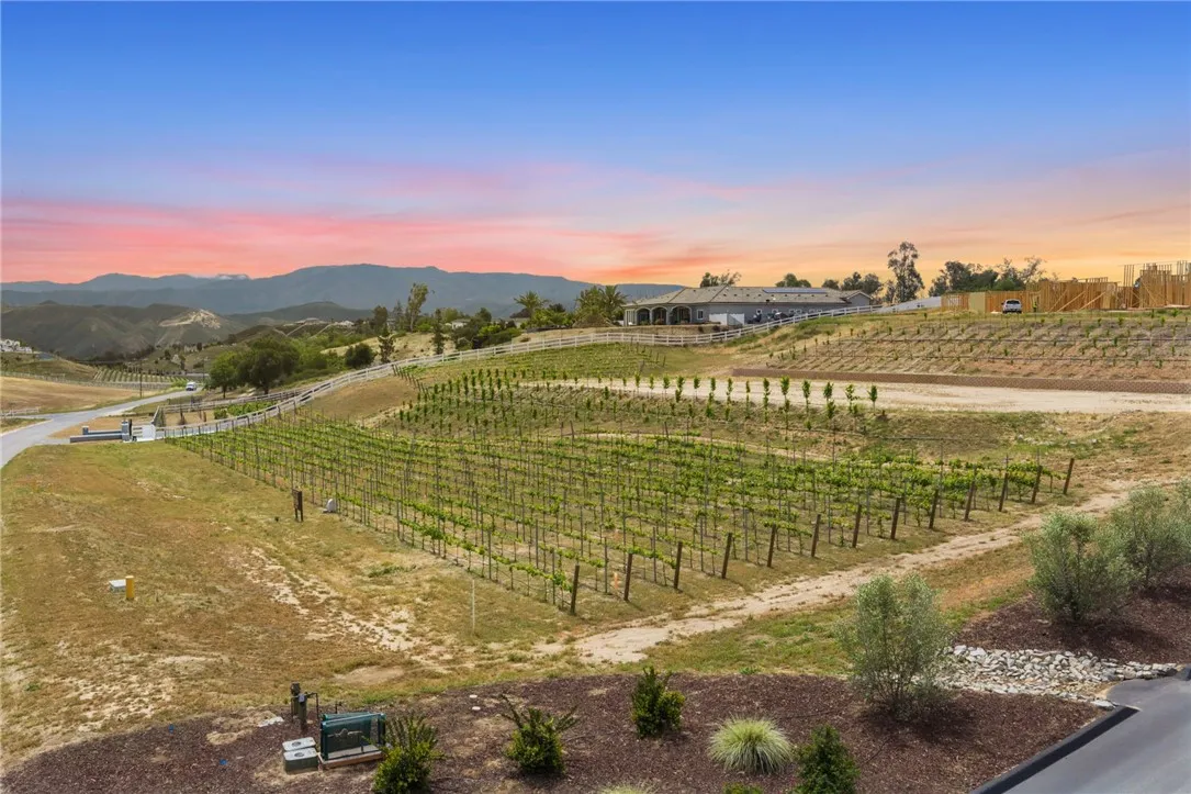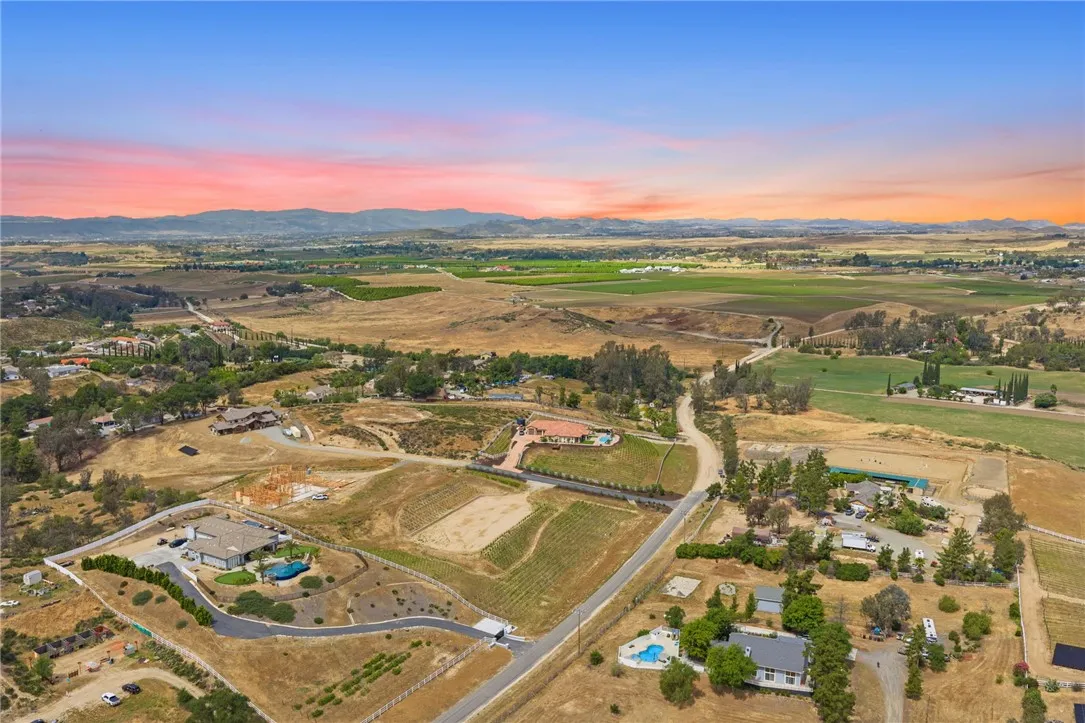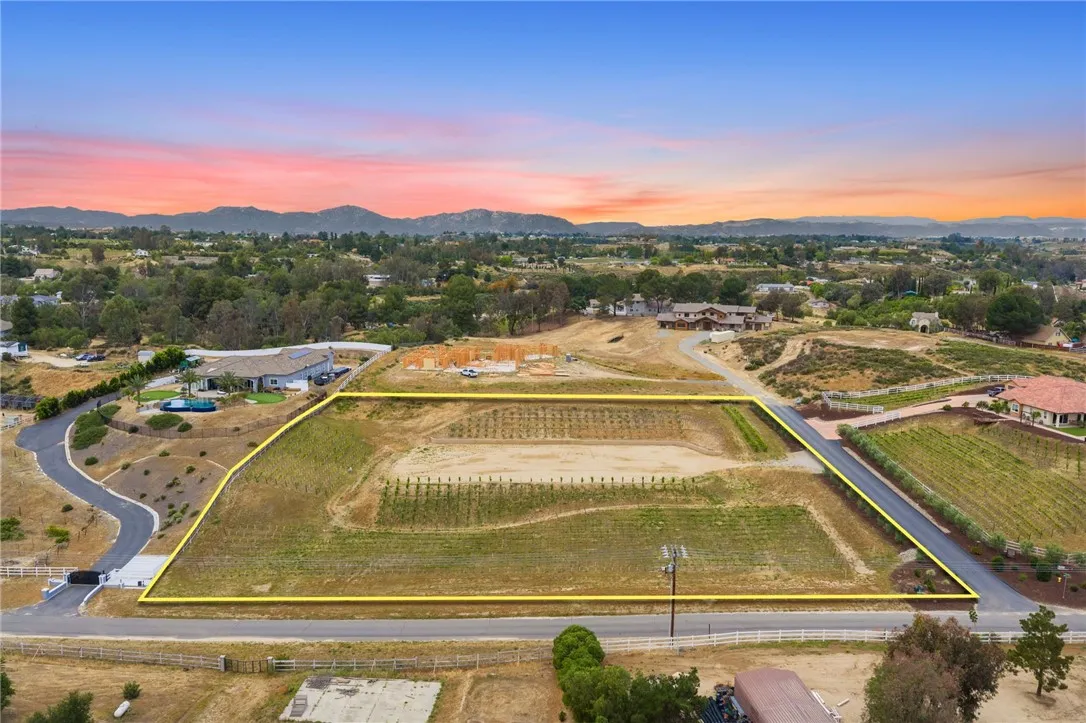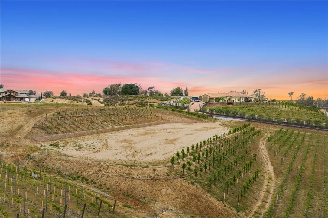 Welcome to an exceptional opportunity in the heart of Temecula’s renowned Wine Country. Situated on a private cul de sac between the De Portola and Rancho California wine trails, this prime 2 acre parcel offers the perfect blend of privacy, convenience, and long term potential. This property is truly build ready, featuring an expansive ~20,000 sq. ft. graded building pad, installed water meter with backflow, and a 1” water main with Rancho Water District fees already paid. The previous grading permit has expired but is expected to be easily renewable, with erosion control measures already in place and previously approved. An established vineyard adds immediate character and value, with approximately 1,400 Petite Sirah vines (certified P1103 rootstock) supported by both trellis and head trained systems. The vineyard is fully equipped with a complete irrigation system, including automated timers, filtration, drip emitters, and fertilizer injectors, ideal for those looking to step into a functioning agricultural setup or expand further. The property has been thoughtfully improved with a finished road leading to the top of the parcel, landscaped frontage featuring mature olive trees, and a block retaining wall that can be modified or reused to suit your vision. A fire hydrant is conveniently located at the front of the property, adding an extra layer of practicality for future development. Zoned RA2.5, the property allows for a custom single family residence along with an ADU and junior ADU, as well as light agricultural uses and equestrian opportunities. With no HOA restrictions, you have the flexibility to design and build a true estate tailored to your lifestyle. Despite its peaceful, rural setting, the property is just minutes from Temecula’s most popular wineries, dining, and everyday conveniences, offering the best of Wine Country living without sacrificing accessibility. Whether you envision a luxury vineyard estate, private retreat, or investment opportunity, this property provides a rare foundation to bring your vision to life.