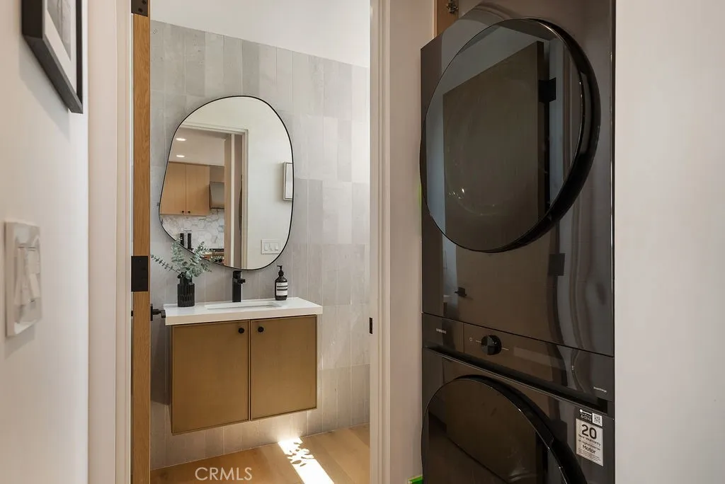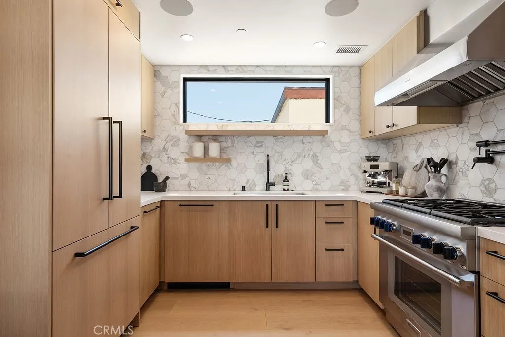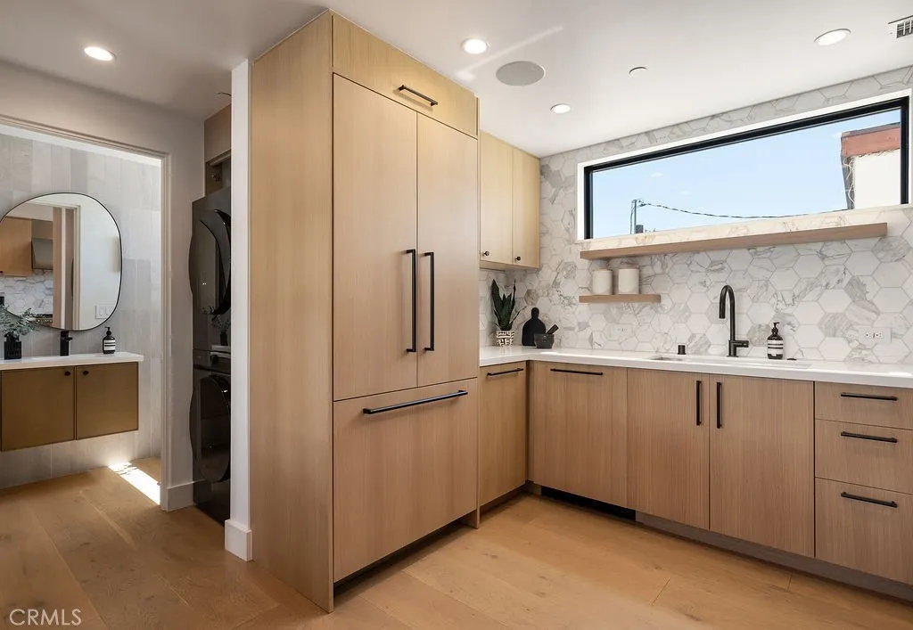 Located within the coveted Flower Streets of Corona del Mar’s Village, 521 ½ Iris Avenue presents a rare opportunity to own a brand-new coastal residence just moments from the area’s best beaches, dining, and boutique shopping. Built in 2024, this thoughtfully designed back unit spans approximately 1,100 square feet across three levels, offering 2 bedrooms and 2.5 bathrooms with a seamless blend of modern design and everyday functionality. The open-concept main level connects the living and dining areas to a chef-inspired kitchen, all flowing effortlessly to a covered deck—ideal for indoor-outdoor living. The kitchen is appointed with quartz countertops, white oak cabinetry, Thermador appliances including a built-in refrigerator, open shelving, and a pot filler, delivering both style and performance. Throughout the home, wide-plank white oak flooring, vaulted ceilings, custom tilework, accent walls, and integrated indoor-outdoor audio create a clean, elevated aesthetic. Upstairs, the primary suite serves as a private retreat, complete with its own balcony, walk-in closet, dual sinks, and a floating vanity. A rooftop patio crowns the home, offering panoramic city-light views and an ideal setting for relaxing or entertaining. Additional highlights include a one-car garage with epoxy flooring and a modern glass roll-up door, along with a covered parking space for added convenience. Perfectly positioned in the heart of the Village, the home is just blocks from the beach and within close proximity to Fashion Island, Laguna Beach, top-rated schools, and the vibrant coastal lifestyle that defines Corona del Mar