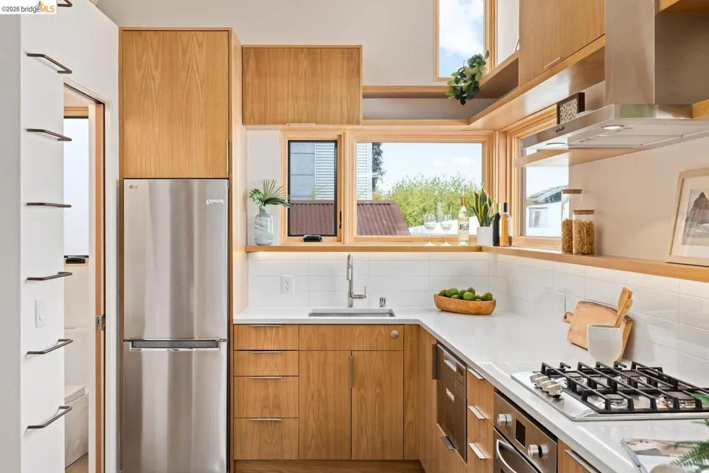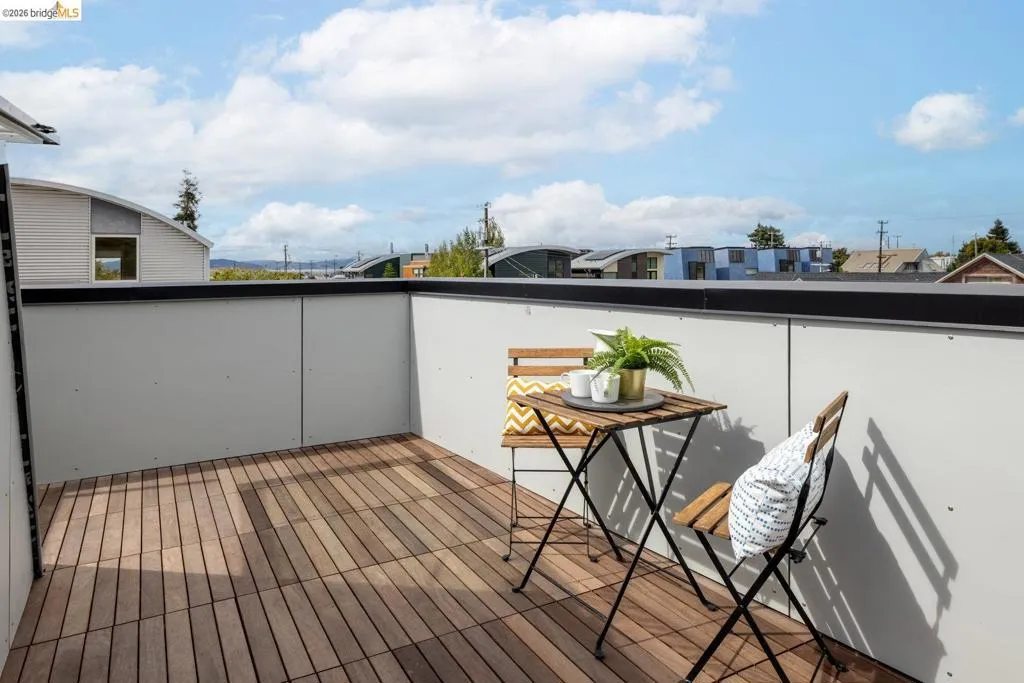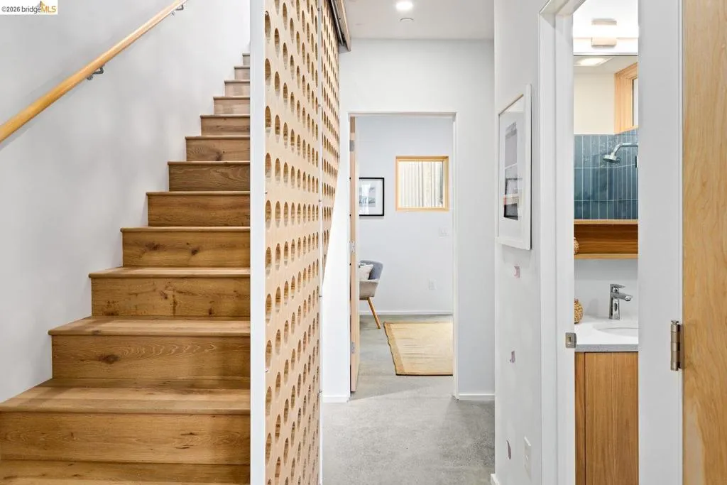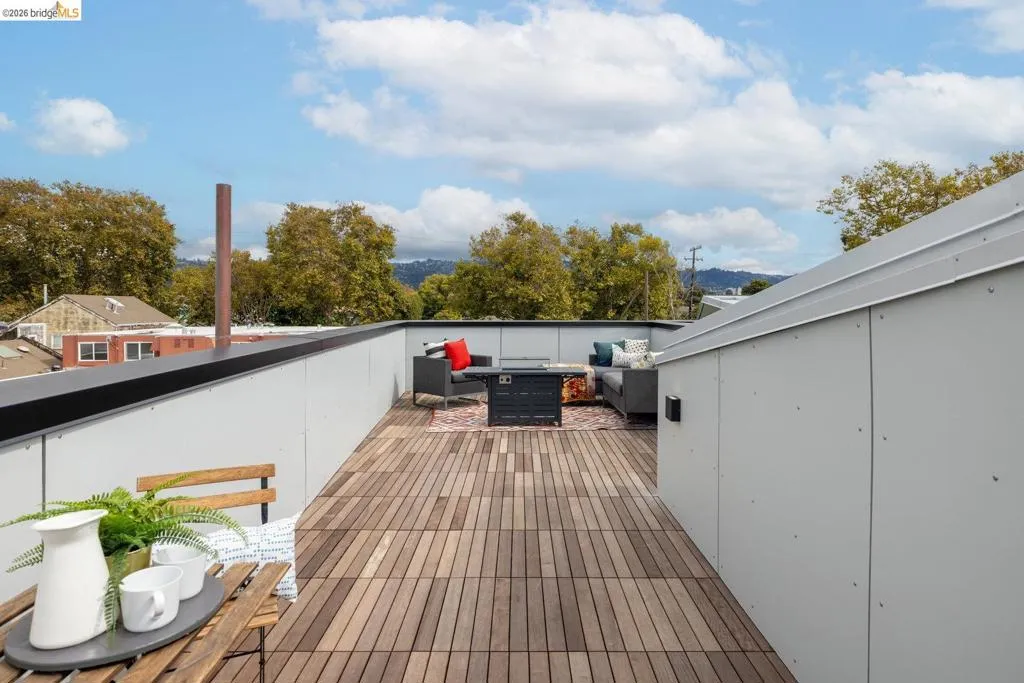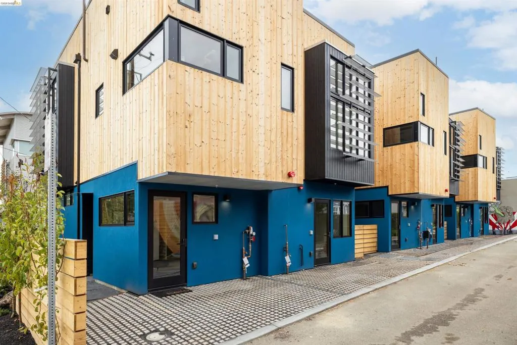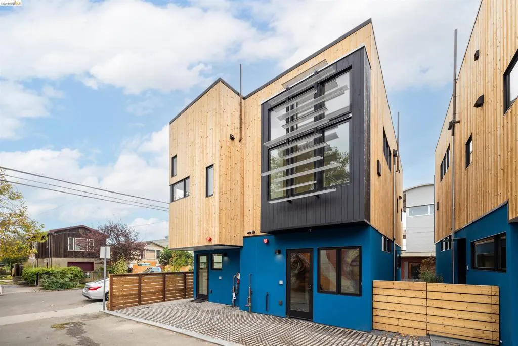 One of six sleek, sustainably built 2BD/1.5BA newly completed residences rise on a once-vacant and walkable infill site just blocks from parks, cafés, shopping, and transit. Each home flips convention with an inverted floor plan—private bedrooms below, open living and kitchen space above—and a rooftop deck showcasing Bay breezes and hill views. Thoughtful design brings in abundant daylight through large Marvin windows with unconventional sunscreens, while tight construction, high R-value insulation, and HRV ventilation ensure comfort and efficiency. Eco-forward features include permeable paving, drivable grass parking, natural wood siding, on-demand hydronic heat, recycled glass counters, low-flow fixtures, dual-flush toilets and individual 220 outlets for EV charging. Ten new trees, including fruit varieties, add beauty and shade. You'll find this modern Berkeley living smart, sustainable, and unapologetically stylish. *Pricing may differ per unit, photos are of a unit with same floor plan. Views: Downtown