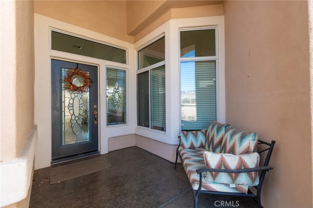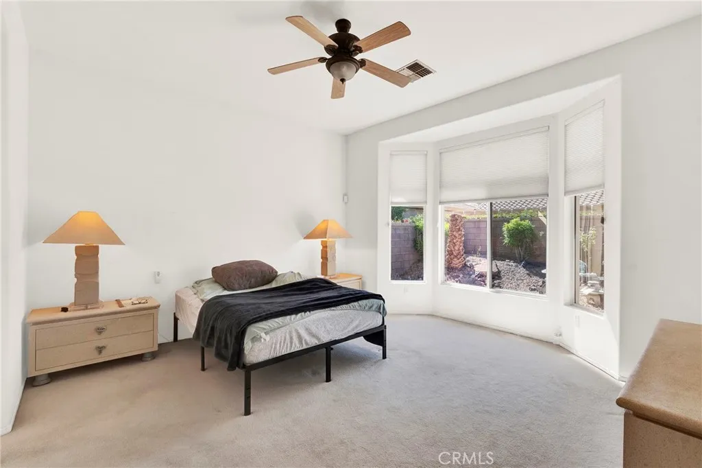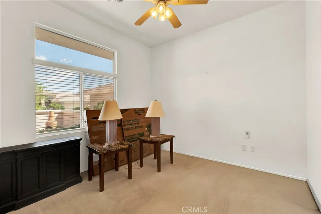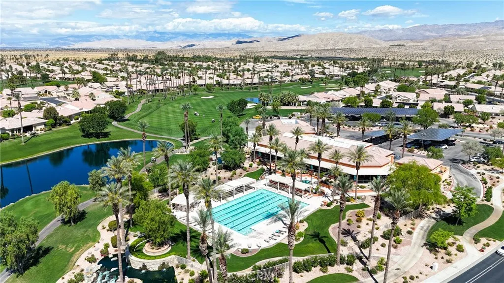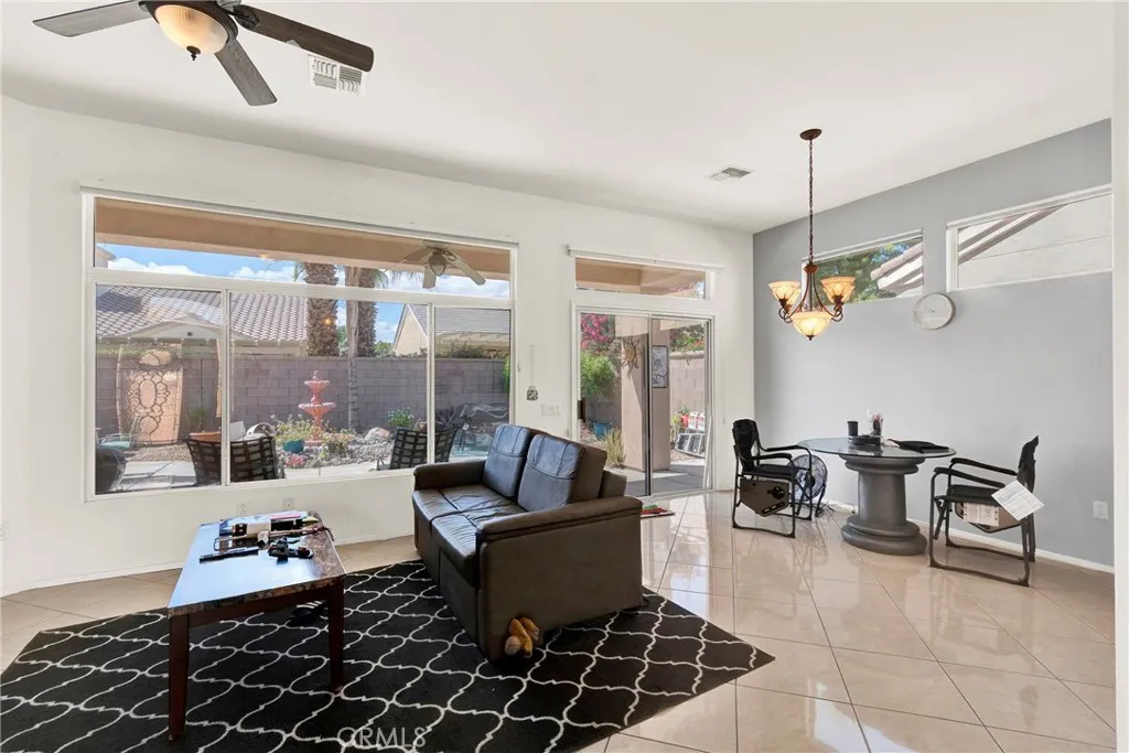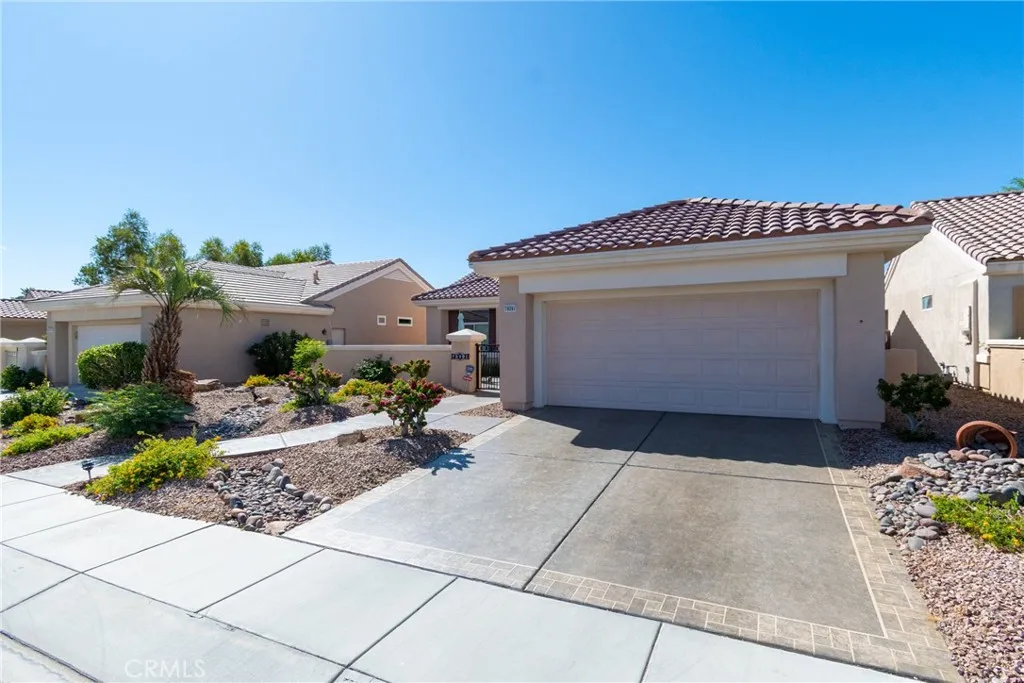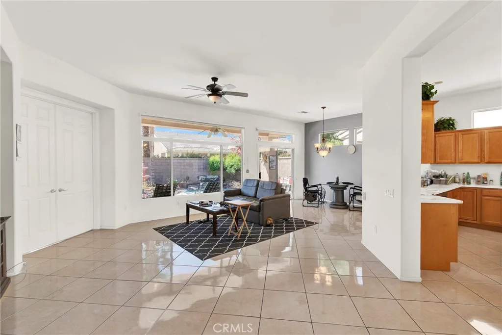 Located in Sun City Palm Desert — Morocco, just around the corner from the Lakeview Clubhouse (fitness center, indoor track, outdoor pool). This popular greatroom floorplan features a south-facing backyard with a large patio and low-maintenance desert landscaping. The home has a gated front courtyard, decorative hardscape, and a leaded-glass front door. Inside are 10-ft ceilings, transom windows, and 18" diagonal tile throughout (except bedrooms and den). The kitchen offers maple cabinets, Corian counters, a chef’s island, and stainless appliances. A den/office sits off the greatroom. Double doors lead to the primary suite with a bay window and a large walk-in closet; the primary bath has dual sinks and a glass-enclosed stall shower. The guest bath includes a tub/shower. The 2-car garage has space for a golf cart and an epoxy floor. AC was replaced in 2019.