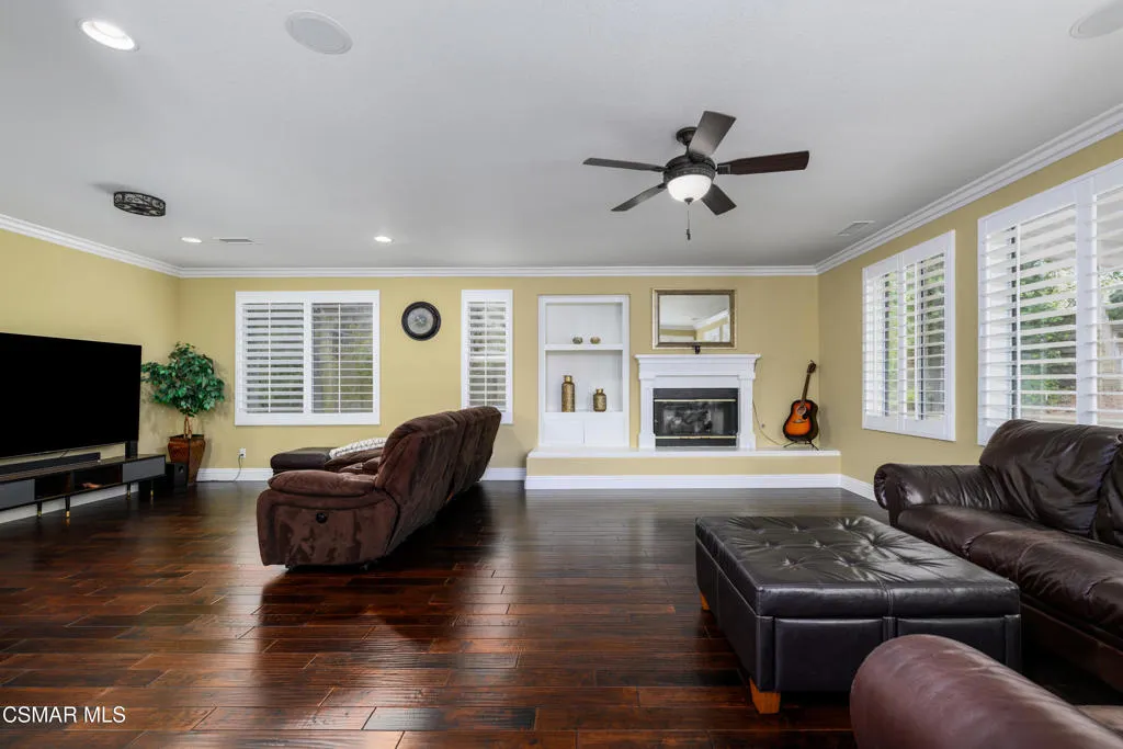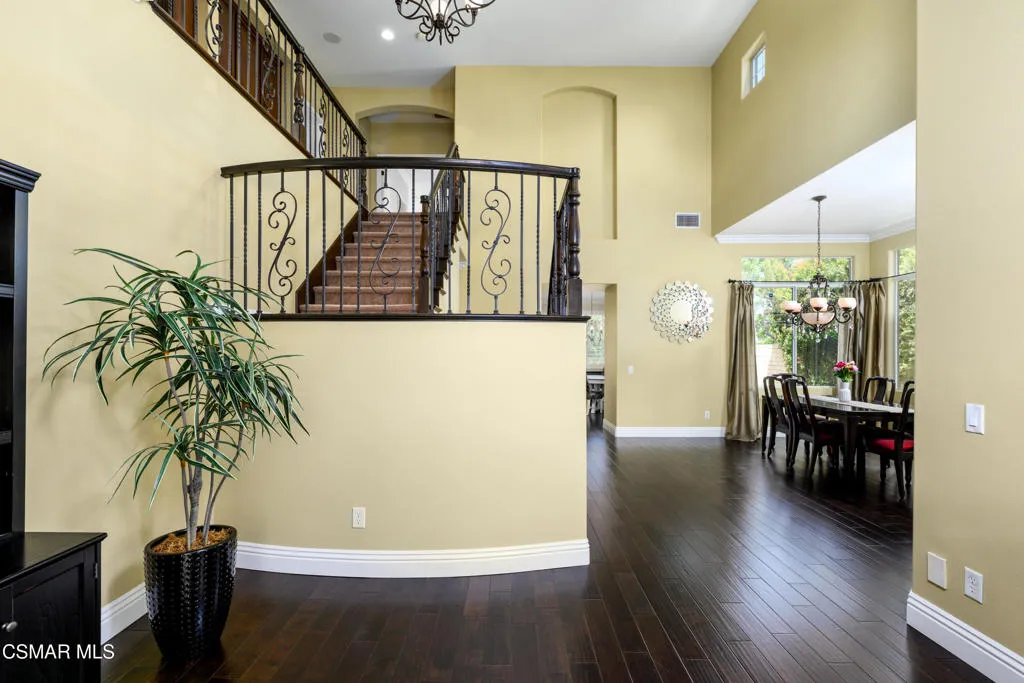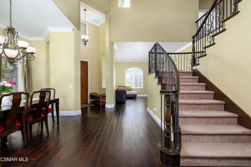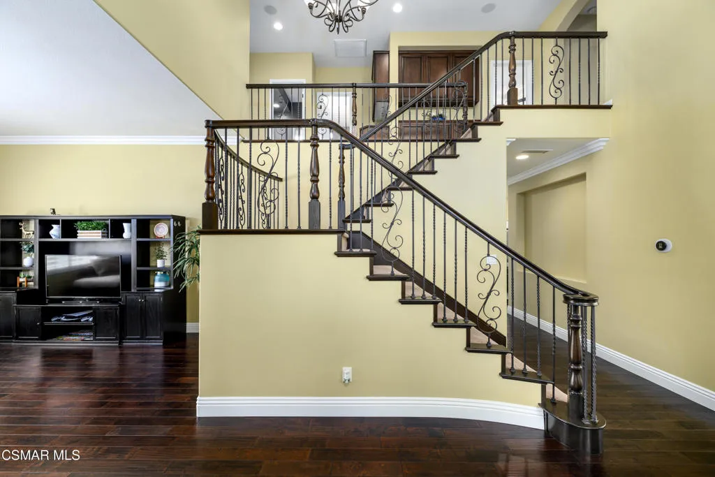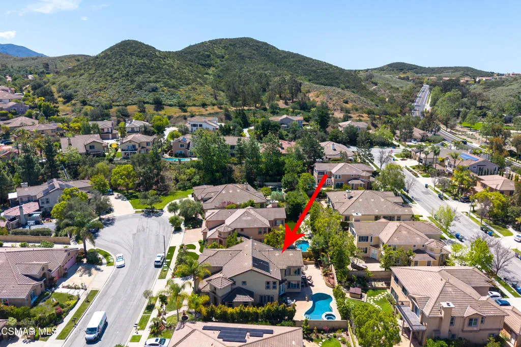 Beautiful Dos Vientos 4-bedroom home with large bonus room (optional 5th) located on a cul-de-sac. Excellent curb appeal with stamped concrete walkways, light pilasters, stacked stone entry, and fountain. Designed for entertaining, the backyard features a grey-bottom pool and spa with solar heating, spacious patios, side yards, and a motorized awning.Popular floor plan offers high ceilings, formal living room, formal dining room, and an expansive family room with fireplace. Large open kitchen includes rich dark cabinetry, granite countertops, center island with breakfast bar, walk-in pantry, and dining area. Downstairs bedroom and full bath plus indoor laundry room with sink.Upstairs includes 3 bedrooms and a large bonus room (optional 5th). Spacious primary suite features a fireplace, recessed ceiling with crown molding, walk-in closet with built-ins, added attic storage access, and en-suite bath with dual sinks, vanity, soaking tub, separate shower, and marble flooring.Additional upgrades include wrought iron staircase, crown molding, oversized baseboards, wood shutters, distressed dark wood flooring, surround sound, recessed lighting, and new dual-zoned HVAC system.Conveniently located near hiking trails and all Dos Vientos amenities.