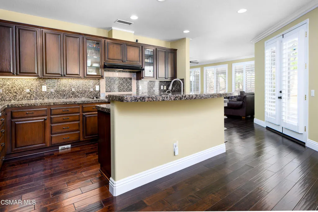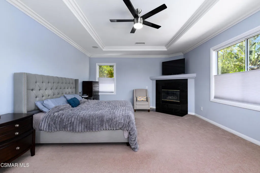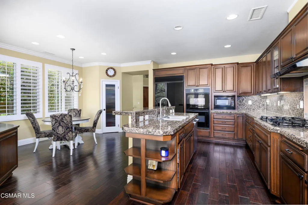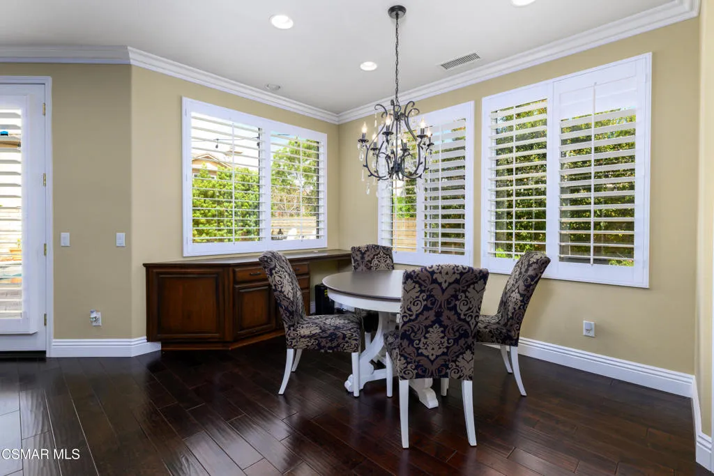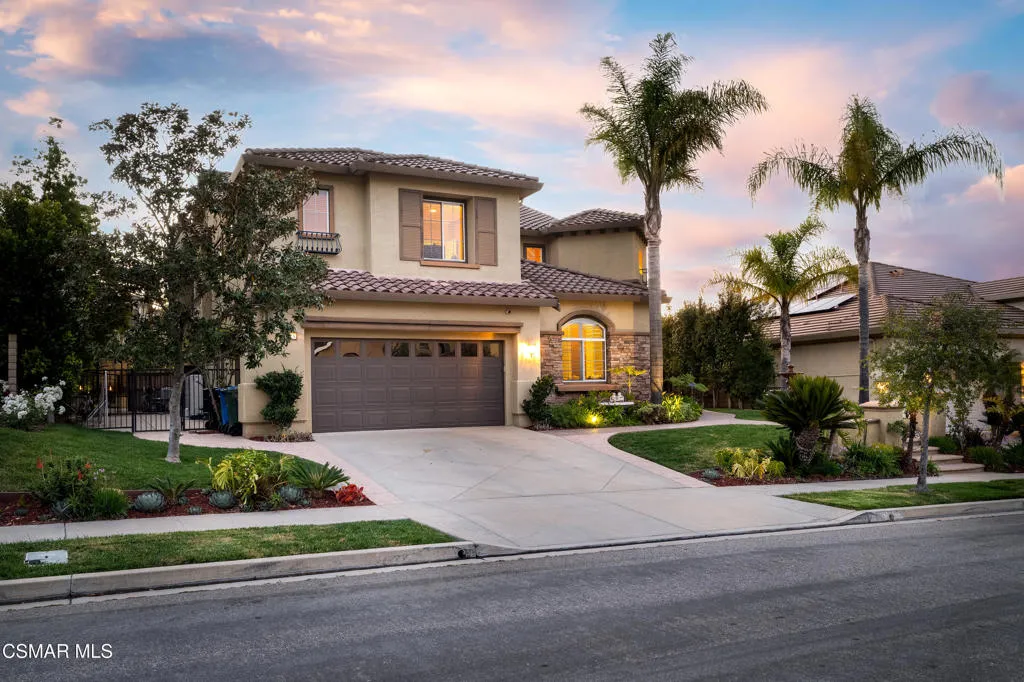 Beautiful Dos Vientos 4-bedroom home with large bonus room (optional 5th) located on a cul-de-sac. Excellent curb appeal with stamped concrete walkways, light pilasters, stacked stone entry, and fountain. Designed for entertaining, the backyard features a grey-bottom pool and spa with solar heating, spacious patios, side yards, and a motorized awning.Popular floor plan offers high ceilings, formal living room, formal dining room, and an expansive family room with fireplace. Large open kitchen includes rich dark cabinetry, granite countertops, center island with breakfast bar, walk-in pantry, and dining area. Downstairs bedroom and full bath plus indoor laundry room with sink.Upstairs includes 3 bedrooms and a large bonus room (optional 5th). Spacious primary suite features a fireplace, recessed ceiling with crown molding, walk-in closet with built-ins, added attic storage access, and en-suite bath with dual sinks, vanity, soaking tub, separate shower, and marble flooring.Additional upgrades include wrought iron staircase, crown molding, oversized baseboards, wood shutters, distressed dark wood flooring, surround sound, recessed lighting, and new dual-zoned HVAC system.Conveniently located near hiking trails and all Dos Vientos amenities.