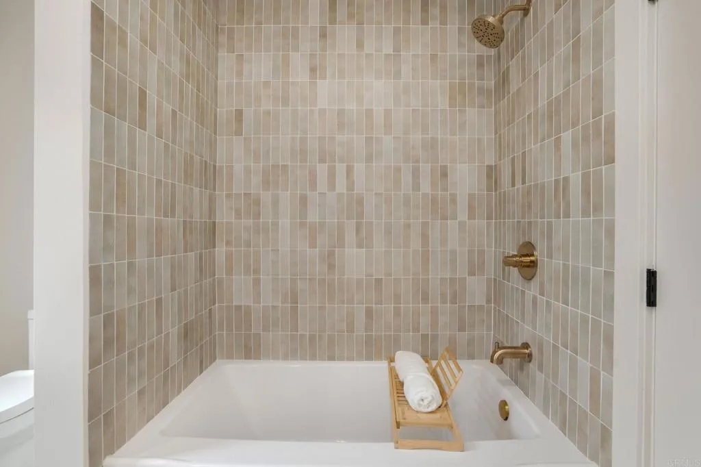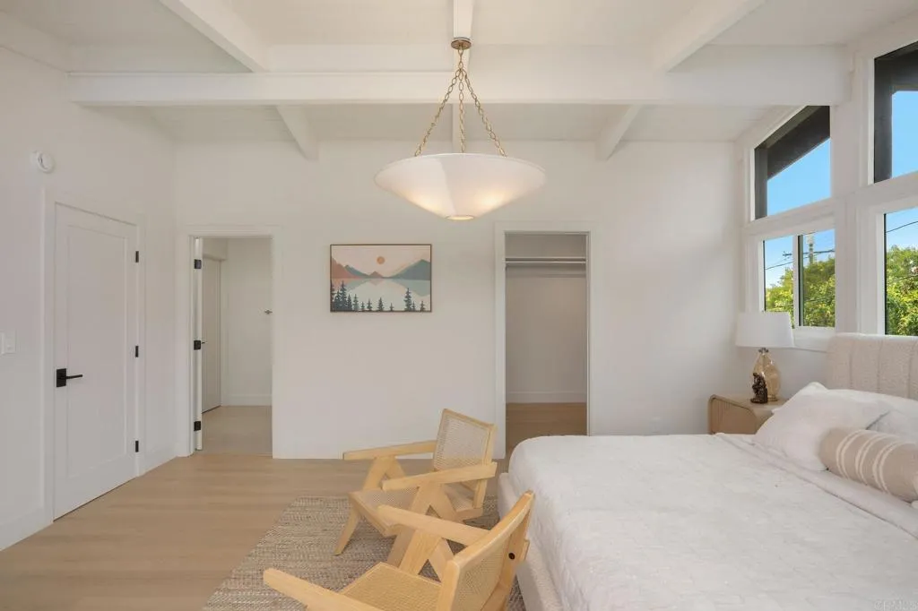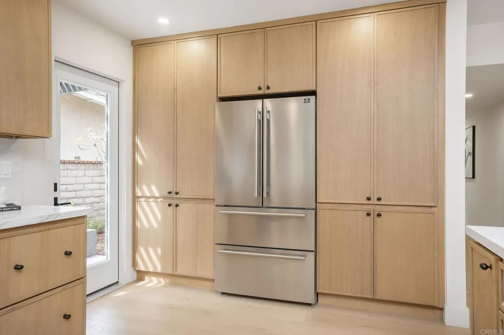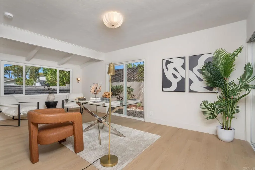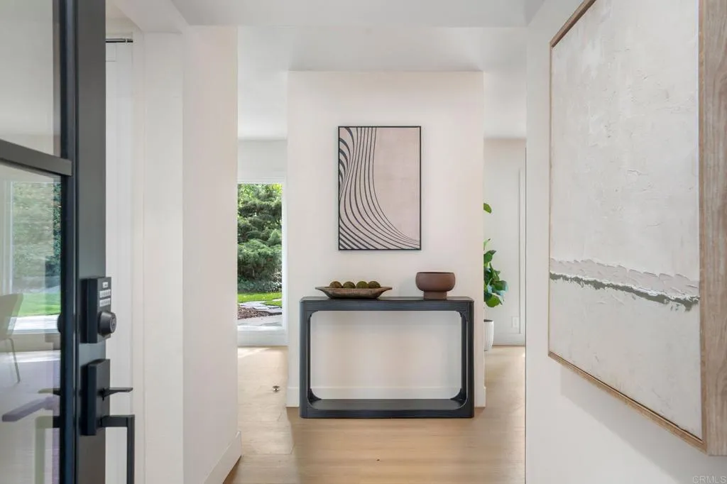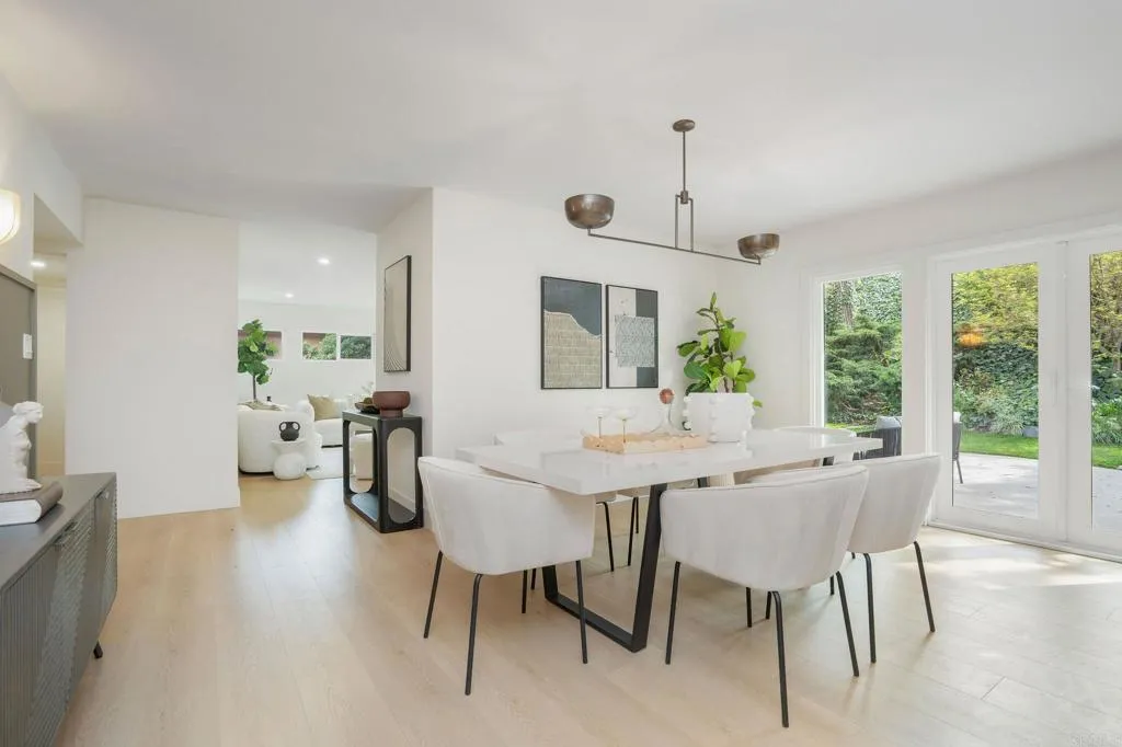 This top-to-bottom renovation of a two-story mid-century modern in Rancho Palos Verdes has been thoughtfully reimagined. A bold stucco-and-black-wood facade, new roof, and white oak-toned plank flooring throughout set the tone for what's inside. A sunlit living room with a plaster-surround fireplace, picture windows, and French doors opening to the backyard anchors the main floor. The open-concept kitchen and dining area is the heart of it all — white oak cabinetry with black hardware, Calacatta quartz countertops and full-slab backsplash, professional-grade range with pot filler, and a generous island beneath gold pendants and a botanical wallpaper accent. Upstairs, the primary suite feels like a private retreat — vaulted shiplap ceilings, a balcony with treetop views, and a spa-caliber en-suite with a freestanding soaking tub against a brick accent niche, rain shower with hand-textured plaster walls, and a white oak vanity with Calacatta countertops and shiplap-framed mirror wall. Every bathroom has been renovated with designer tile and curated fixtures. Outside, a rear patio flows beneath a black pergola to an outdoor kitchen with built-in grill, while a landscaped lawn stretches under mature trees bordered by roses. Close proximity to Terranea Resort, Point Vicente Lighthouse, coastal trails, and top rated schools — make this one of the South Bay's most coveted addresses.