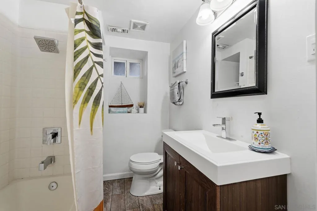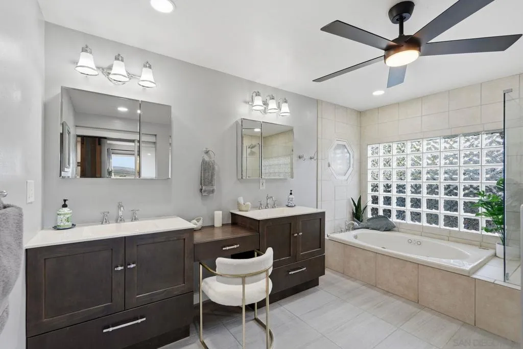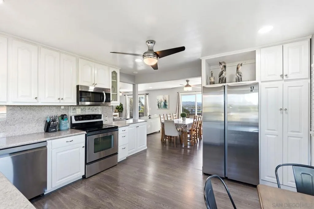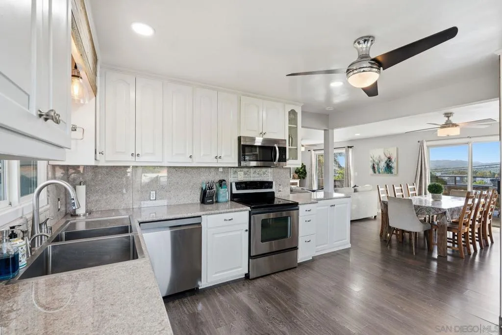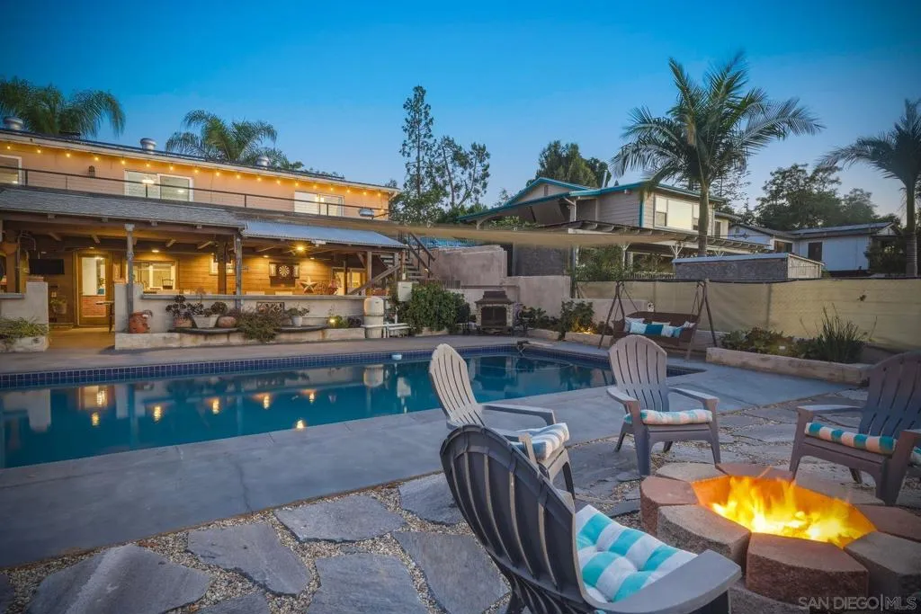 Turnkey Airbnb/Short-Term Rental (STR) Investment Opportunity in the heart of Escondido’s Historic District! This beautifully updated two-story residence offers 1,954 sq ft of light-filled living space with breathtaking city and mountain views. Currently generating $80K+ in gross annual revenue. Sold fully furnished with the right offer. The main level features luxury vinyl plank flooring throughout, an open-concept kitchen with sleek countertops, stainless steel appliances, modern cabinetry, recessed LED lighting, and ceiling fans. The spacious living room boasts a cozy wood-burning fireplace and large sliding glass doors that open to an enormous balcony overlooking the views. The adjacent dining room also accesses the expansive balcony. The private primary suite includes a large walk-in closet, ceiling fan, and luxurious ensuite bathroom with a Jacuzzi soaking tub, double vanity, brand-new frameless glass shower enclosure, and new porcelain tile floors. Downstairs offers excellent flexibility with a separate living area, kitchenette, den, and two additional bedrooms — perfect for guests, extended family, or additional rental income. Step outside to the beautifully remodeled covered patio, separate pool area with seating, outdoor fireplace, fire pit, pool house, and mature orange, avocado, and pomegranate trees. The large, fully fenced, and completely flat backyard provides ample room for future ADU expansion. Additional features include a tankless water heater, new HVAC system, and a full Vivint home automation and alarm system with smart thermostat.