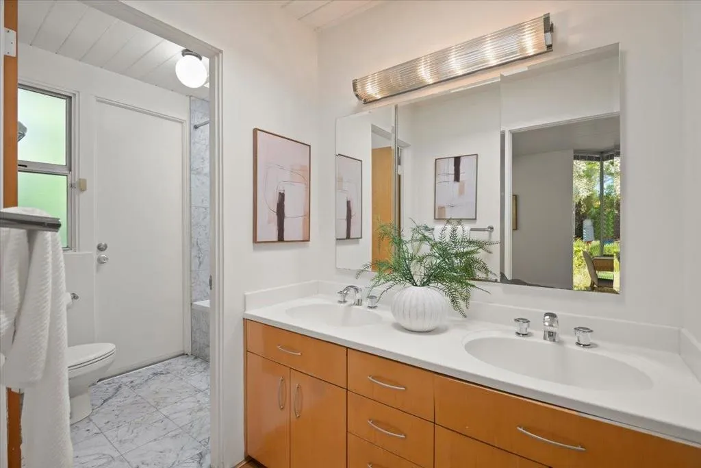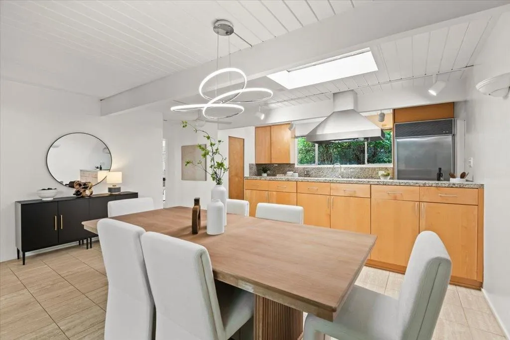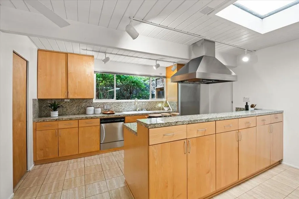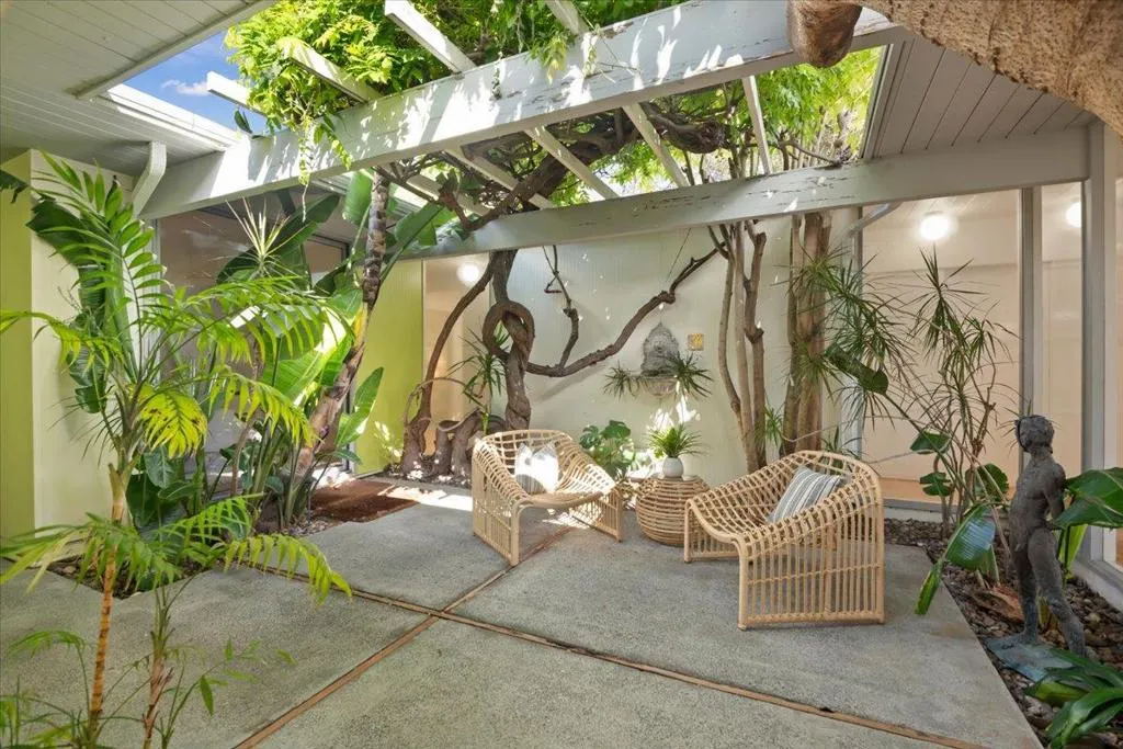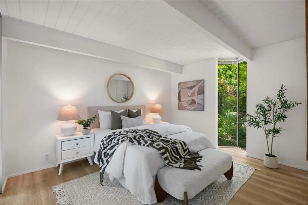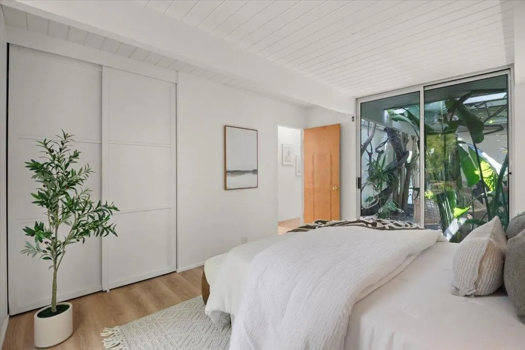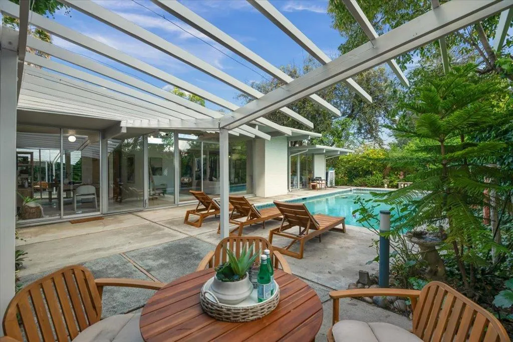 Stunning Atrium model Eichler in prime location on cul-de-sac in heart of Silicon Valley w/outstanding school district: Cherry Chase/Sunnyvale/Homestead High. This home speaks to the artistic spirit at heart. The masterfully created front, side and back vegan garden areas along with the stunning Atrium (with mature wisteria vines) allow you to feel you are outdoors in almost every room in the house. Very spacious with generous rooms and wide hallways, this 5 bed, 2 bath home features new interior paint, reconditioned hdwd floors, upgraded kitchen with solid wood cabinetry, stone tile counters and stainless steel appliances. Bathrooms have been exquisitely remodeled. There are other Eichlers then there is ours! Shows like a model home!