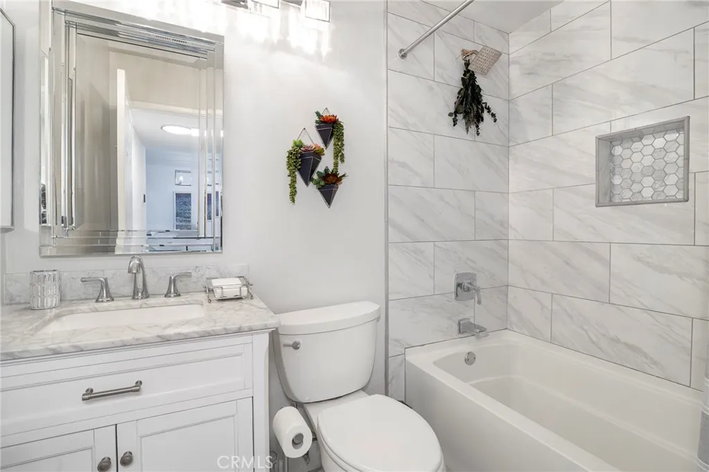 Welcome to this beautifully upgraded 2-bedroom plus loft home, filled with natural light and soaring vaulted ceilings. In addition to the two bedrooms, a spacious and versatile private loft offers the perfect space for a third bedroom, guest suite, office, or playroom, complete with its own oversized deck nestled among the treetops. The kitchen features stainless steel appliances, quartz countertops, white cabinetry, an in-unit washer and dryer, and convenient access to the front patio. The primary suite includes an upgraded ensuite bathroom with dual closets, a glass-enclosed marble shower, double vanities, and modern fixtures throughout. Enjoy exceptional outdoor living with three large decks, ideal for relaxing or entertaining. Additional highlights include a private garage with custom storage, a separate dedicated carport, and nearby guest parking. Ideally located in Valencia near top-rated schools, parks, paseos, easy freeway access, and a shopping center just across the street with dining, groceries, and more.