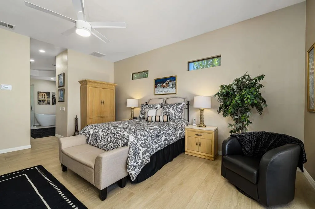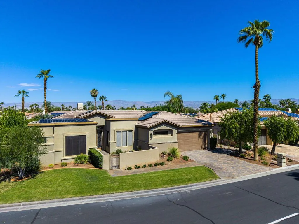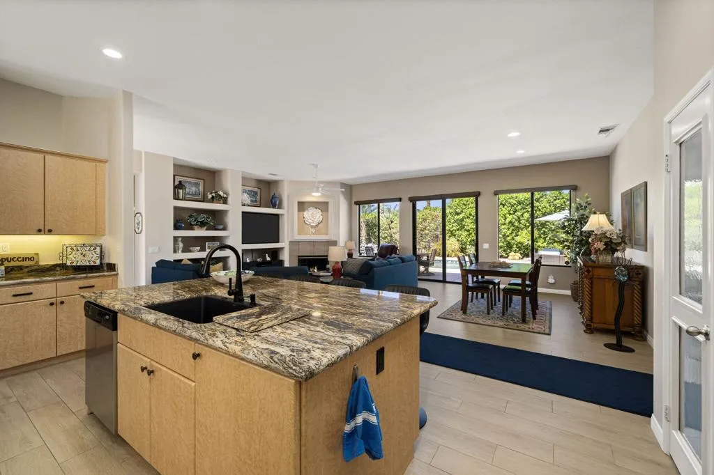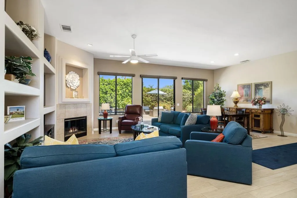 Beautifully maintained home available for long-term lease within the desirable Sunterrace community in Palm Desert.This immaculate residence reflects true pride of ownership and offers a warm, inviting atmosphere with neutral tones throughout. Wood-look porcelain tile flooring runs throughout the home, adding both durability and style, while the open floor plan creates a seamless flow between living spaces--ideal for both everyday living and entertaining.The chef's kitchen is thoughtfully designed with a central island, bar seating, and a charming kitchen nook, perfect for casual dining. Just off the nook, a bonus room/gym provides added flexibility for fitness, office, or hobby space (current storage cabinets shown in photos will be removed). The spacious living room features a cozy fireplace and custom built-in shelving, enhancing both comfort and functionality.Additional highlights include a private pool for outdoor enjoyment, a detached casita offering flexibility for guests or a home office, a dedicated laundry room, and solar for improved energy efficiency. Internet and basic cable are also included.Offered unfurnished, this home provides a wonderful opportunity to create your own personalized living space in a highly sought-after Palm Desert location.