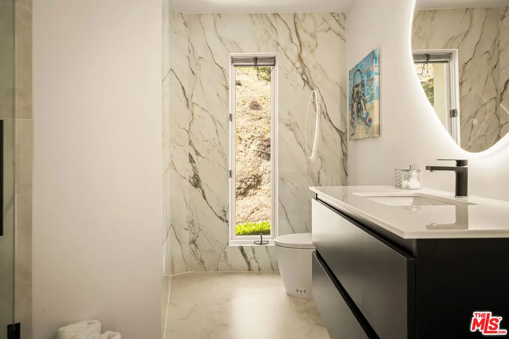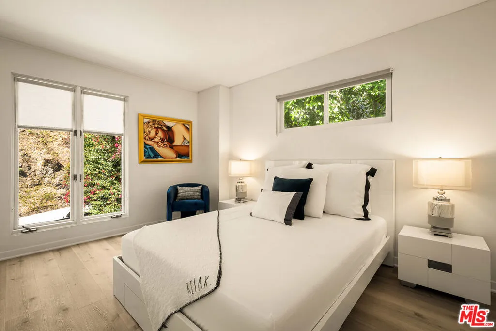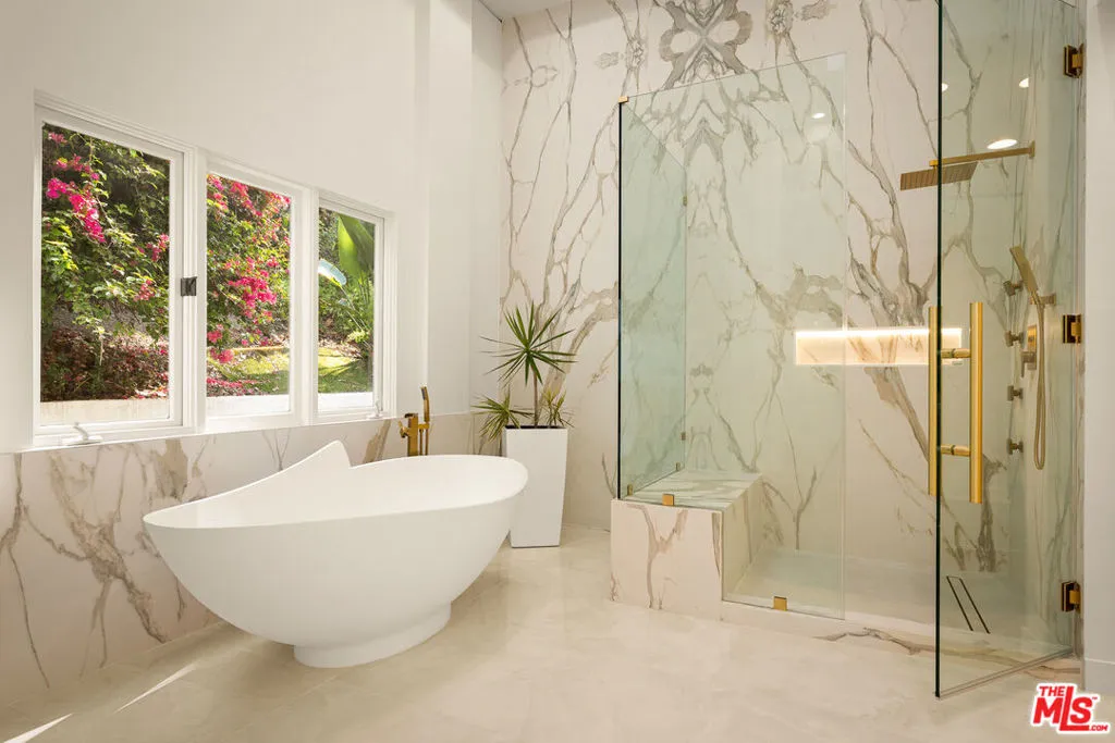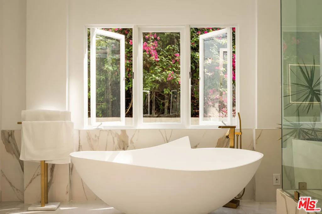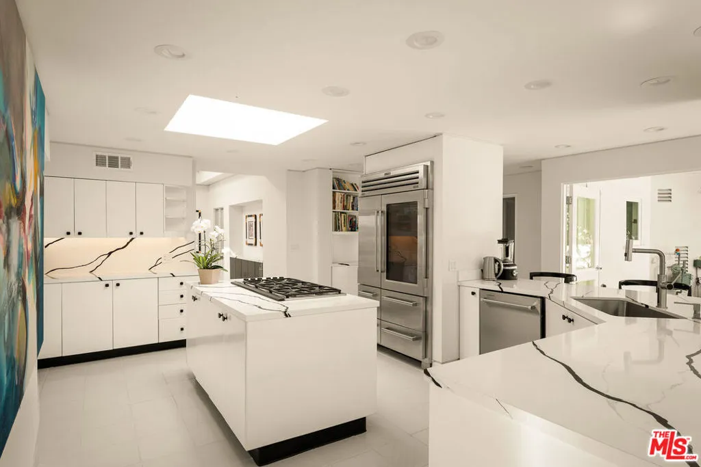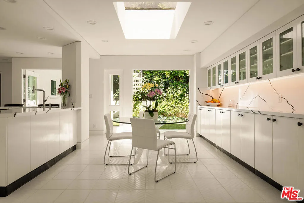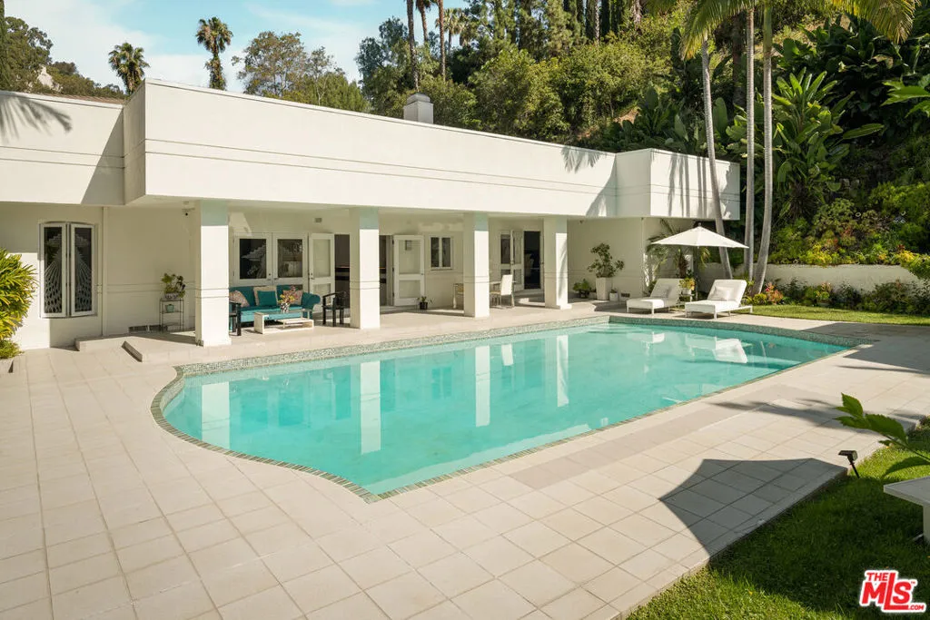 BEVERLY HILLS PROPER. Completely reimagined in 2026 and privately tucked behind tall hedges and gates on one of the most desirable streets in Beverly Hills, this Art Deco estate offers exceptional scale and privacy. Originally designed and built by renowned Hollywood couture designer Dina Barel, the home reflects timeless design and thoughtful attention to detail throughout. Set on over half an acre of landscaped grounds, the property blends classic architecture with a layout that feels functional and inviting. High ceilings, skylights, and French doors fill the home with natural light, while quality finishes add warmth and polish. The main level is ideal for entertaining, featuring a well-appointed kitchen with high-end appliances, custom cabinetry, and a large island that opens to the dining area and wet bar, all with direct access to the backyard. Outside, a pool and spa, natural waterfall, mature palms, and multiple seating areas create a private setting perfect for both relaxing and hosting. Upstairs, the primary suite includes a fireplace, dual dressing areas, and spacious bathrooms with a soaking tub and steam shower. Additional bedrooms are bright and generously sized, complemented by a lounge area and separate staircase for added flexibility. A rare opportunity in a premier Beverly Hills location, this home offers privacy, quality, and timeless appeal, ready for its next owner to enjoy.