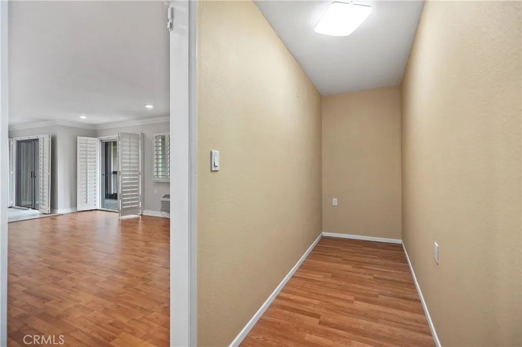 Bright and inviting top floor “Villa Puerta” one bedroom with a spacious glass enclosed balcony, stunning panoramic views, and easy access via elevator from the underground parking level. This 1 bedroom, 1 bath home has a spacious, open layout with a large living room and dining area, crown molding, updated lighting, vinyl windows with Plantation shutters and easy care flooring through the main living spaces. A custom closet has been added in the living room with access through a secret book shelf door, offering excellent extra storage. The kitchen is clean and functional with white cabinetry, granite countertops, and plenty of storage. Sliding doors open to the glass enclosed balcony, a great spot for morning coffee, reading, or simply enjoying the fresh air and distant views. The bedroom is generously sized with a ceiling fan and ample closet space. the bathroom features a walk in shower and updated vanity. There is also a louvered window in the shower. Underground parking and storage add everyday convenience. Laguna Woods Village is an Active Senior Community where the first occupant must be 55+, and a second occupant may be 45+. Enjoy resort style living with golf on the 27 hole championship course plus the 9 hole executive course, tennis and pickleball, fitness centers, multiple pools, an equestrian center, community gardens, art studio, world class woodshop, over 200 clubs, a free community bus, economical RV storage, guard gated security, and you are about 6 miles from Laguna Beach