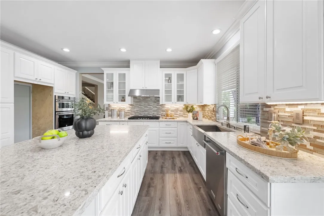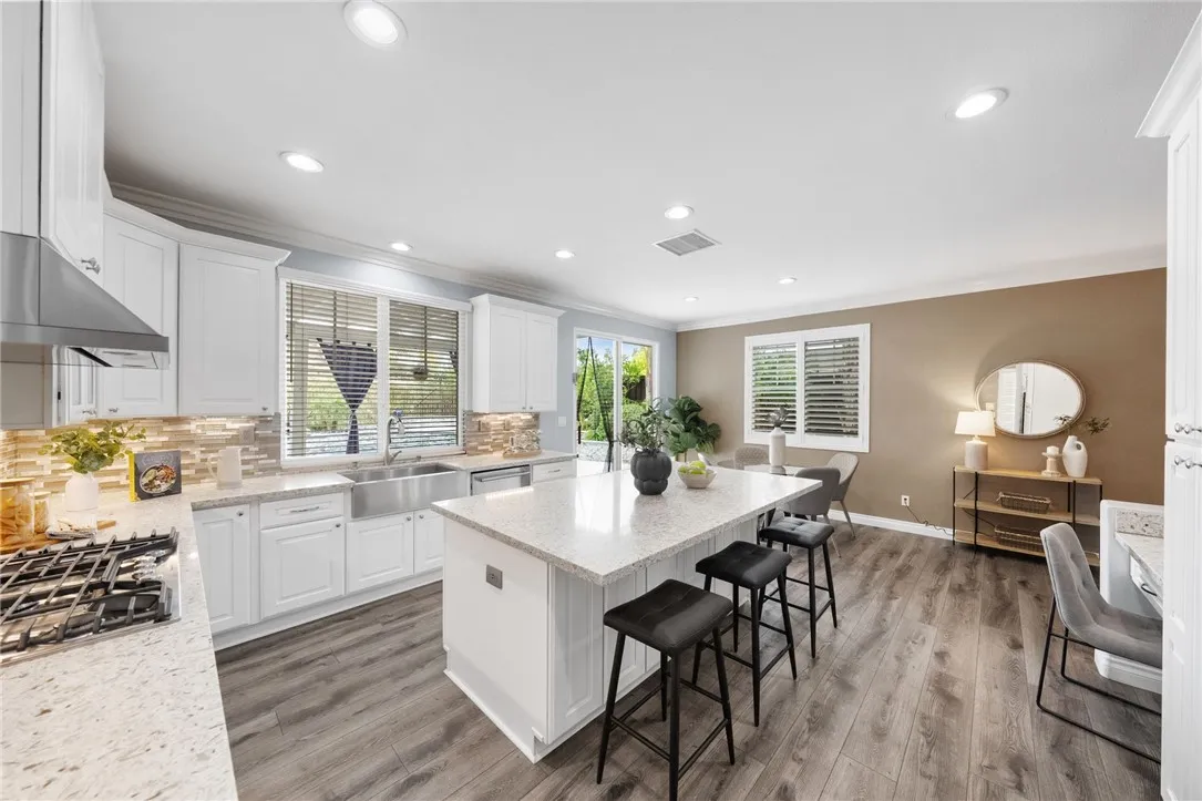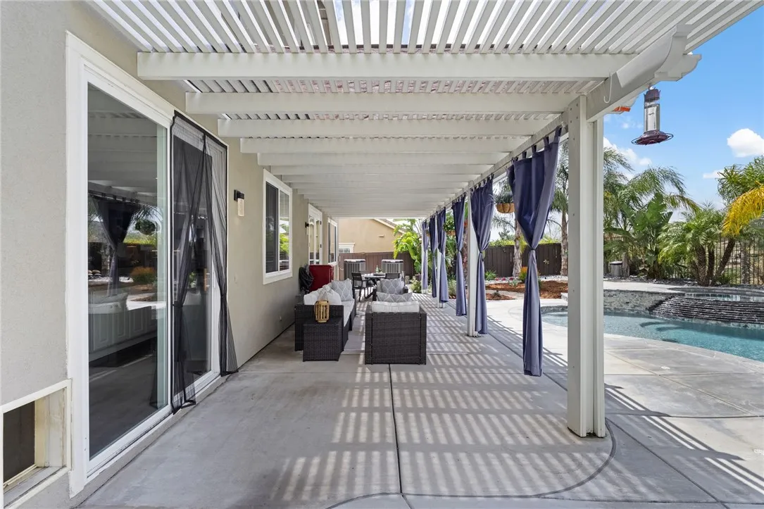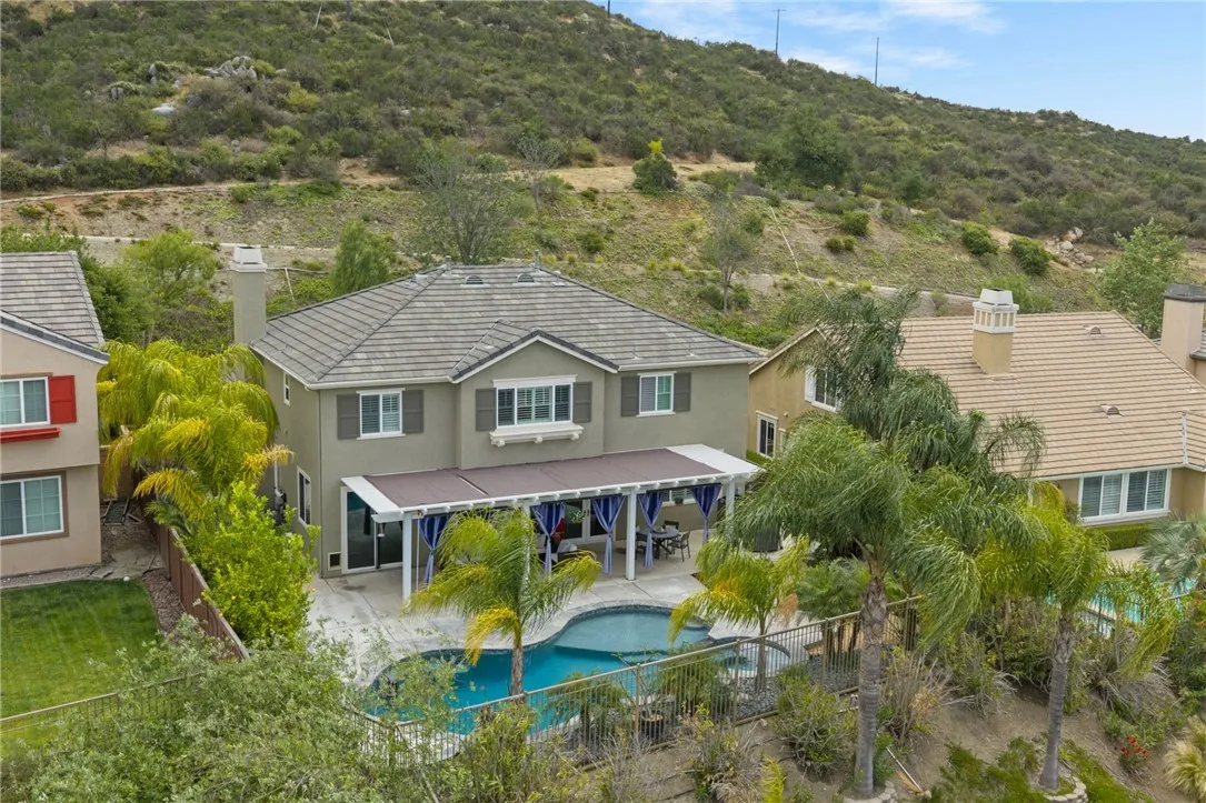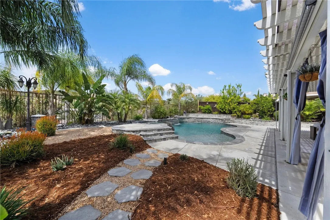 Welcome to Paper Bark Ave., a beautifully appointed, extensively upgraded residence set on a SINGLE-LOADED street w/in the prestigious GUARD-GATED community of Greer Ranch. Showcasing a significant investment in quality enhancements & ENERGY-EFFICIENT systems, this home offers an exceptional blend of refined living, privacy, & modern comfort. Striking curb appeal sets the stage w/manicured landscaping, vibrant accents, & illuminated entry steps leading to a stunning glass leaded front door. Inside, soaring ceilings & luxury vinyl plank flooring create an elegant yet inviting ambiance. Formal living & dining spaces are filled w/natural light, w/the dining rm featuring a custom door for seamless indoor-outdoor flow. The fully REMODELED KITCHEN is the heart of the home, designed w/white cabinetry, an expansive island, quartz counters, tile backsplash, & SS appl., all opening to the inviting family rm w/fireplace, custom built-ins, & ceiling fan. The main level also features a flexible rm w/double door entry, ideal as a 5th BR or office, along w/a nearby full BA. Upstairs, 3 secondary BR offer mirrored wardrobes & ceiling fans, along w/a full secondary BA, + a laundry rm w/sink & storage. The primary suite is a true retreat, capturing scenic views through large picturesque windows w/plantation shutters. The primary BA features a soaking tub, walk-in shower, dual vanities, & a spacious walk-in closet. Designed for efficiency & comfort, the home incl. OWNED SOLAR to SAVE you $$$, newer dual high-efficiency A/C systems (approx. $68K), upgraded insulation & ducting, + a whole house water filtration system. Additional enhancements include crown molding, upgraded baseboards, a security camera system, & a custom generator setup. Step outside to your private backyard oasis, where a covered patio offers the perfect place to relax or entertain year-round. Just beyond, a beautifully designed freeform POOL takes center stage, complemented by a RAISED SPA wrapped in stacked stone & a tranquil spillway cascading into the pool. Surrounded by lush palms, mature landscaping, & a curved stone retaining wall, the space offers both privacy & a peaceful hillside backdrop. Multiple seating areas & an expansive patio make this yard ideal for relaxing or entertaining. Residents of Greer Ranch enjoy guard-gated security, parks, community events, hiking trails & a prime location near top-rated schools, shopping, dining, Temecula wineries, & Old Town Murrieta.