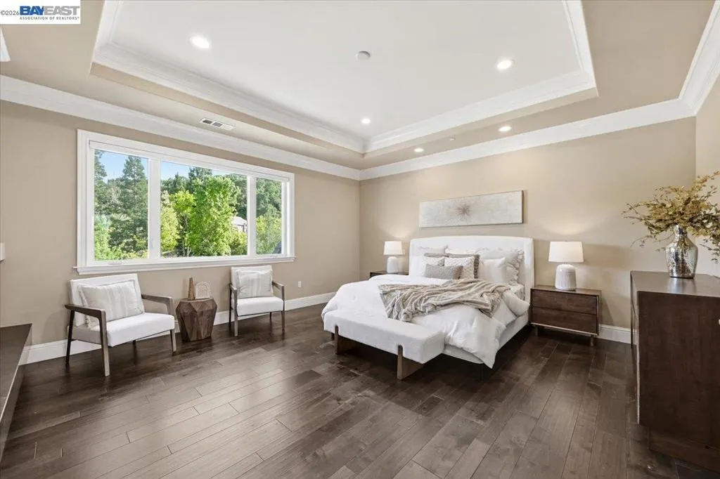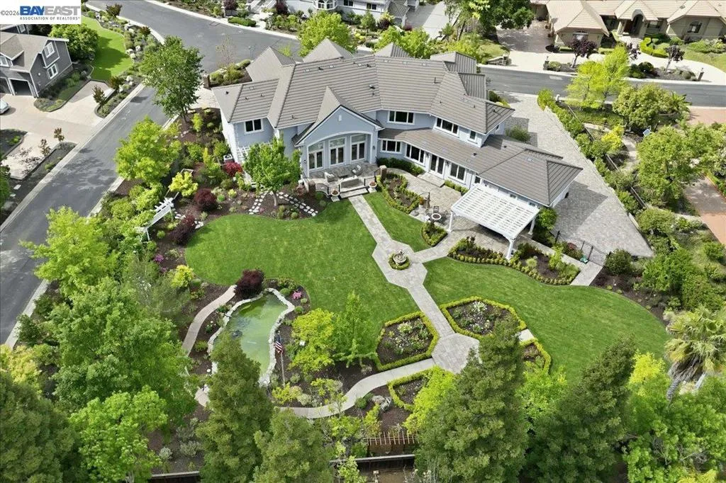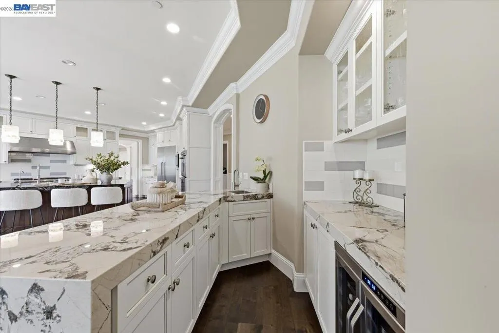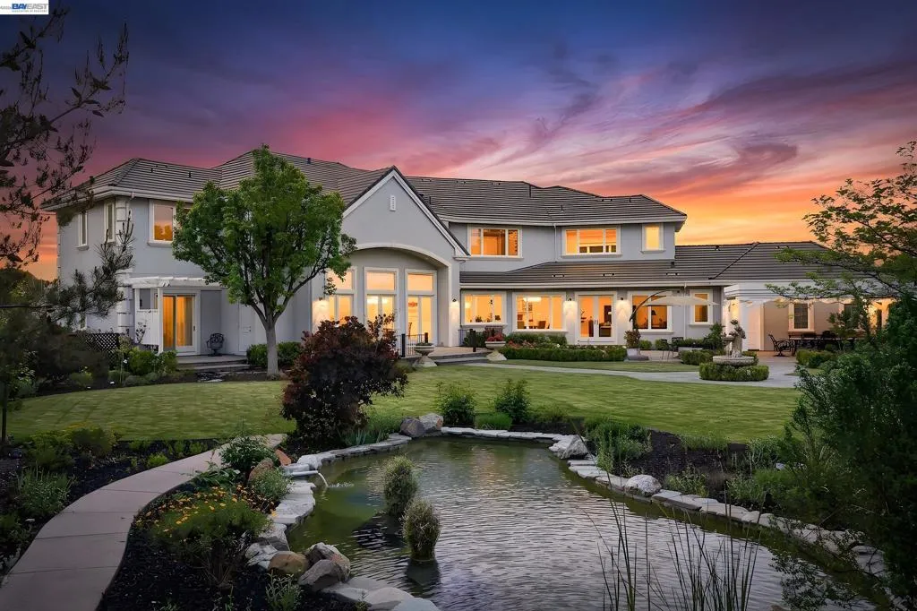 Discover refined elegance in this exceptional custom-built estate in Golden Eagle, an exclusive gated luxury community. This 5-bedroom, 5.5-bath residence offers approximately 6,528 sq ft of living space on a rare, flat ~0.85-acre lot and includes a 4-car garage. A grand entry with soaring ceilings and abundant natural light opens to expansive living spaces designed for both everyday living and entertaining. The chef’s kitchen is beautifully appointed with a large island, walk-in pantry, built-in wet bar, and premium Thermador appliances, flowing seamlessly into the inviting family room. Thoughtfully designed with an open-concept layout, the home offers two dedicated offices and spacious en-suite bedrooms throughout. The luxurious primary suite is a private retreat featuring a spa-inspired bath with steam shower, soaking tub, and generous walk-in closet. High-end finishes include hardwood and marble flooring, custom cabinetry, designer countertops, and elegant architectural details throughout. Additional highlights include a custom wine cellar, smart home features, tankless water heater, and three-zone HVAC system. The professionally landscaped, garden-like grounds feature a waterfall pond, patio, and a rare, flat backyard offering exceptional space for outdoor living and entertaining. Enjoy a private retreat offering modern luxury, comfort, and practical living in one of Pleasanton’s most coveted communities.