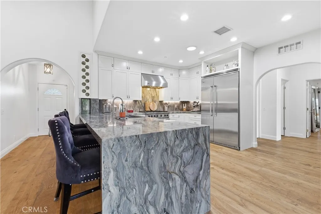 Modern Mediterranean home on approximately 5.1 acres in Arlington Heights. Located on a quiet street with three separate entrances, this property offers both residential and agricultural use, creating an ideal ranch-style living environment. It includes 10 shares of the Gage Canal, established orange groves, and a barn stable. Inside, the home features vaulted ceilings, an open floor plan, high-end finishes, Viking kitchen appliances, custom bathroom designs, and wide-plank oak flooring throughout the 4 bedrooms. Additional highlights include 3 beautifully tiled bathrooms, a dedicated laundry room, a huge carport, a massive canopy, and an additional garage with over 1,300 sq ft of storage plus a bonus room—both garages have epoxy-coated floors. The property is fully fenced with RV parking, an irrigation system, and a yard enhanced by beautiful palm trees. The upgraded backyard provides a unique outdoor retreat perfect for relaxing or entertaining. Located near the Historic California State Citrus Park.